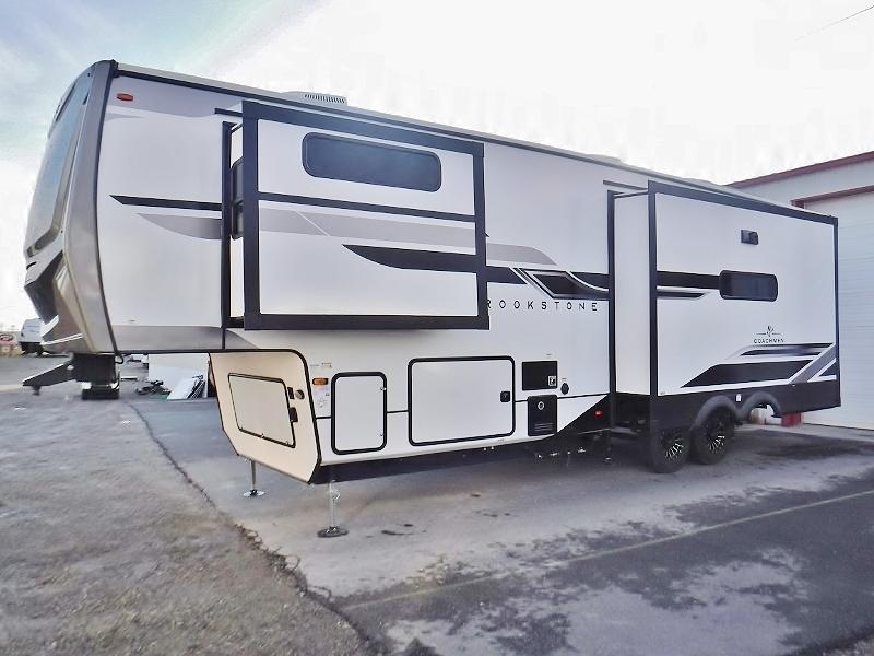 The Brookstone fifth wheels by Coachmen are coming to you with wide-body comfort, home-like amenities, and unique designs for a truly luxurious RV. The Weather Shield+ consists of a 6X double Azdel aluminum cage sidewall system, a Radiant Pro weather barrier system, and more that will help you extend your camping season or go full-time. Head inside to find solid surface countertops in the kitchen, an 4K Smart LED TV in the living room, slow rise roller night shades, and the list of comforts goes on! The Brookstone also includes 6-point electric auto-leveling, four Solid Step entry steps, an electric awning with LED lights, and many more exterior conveniences!