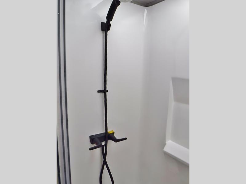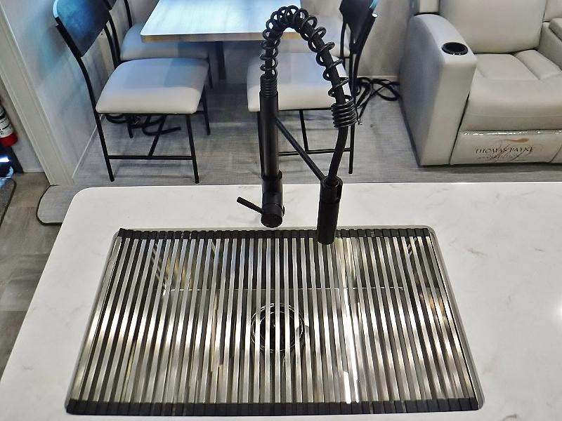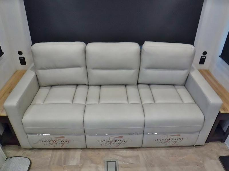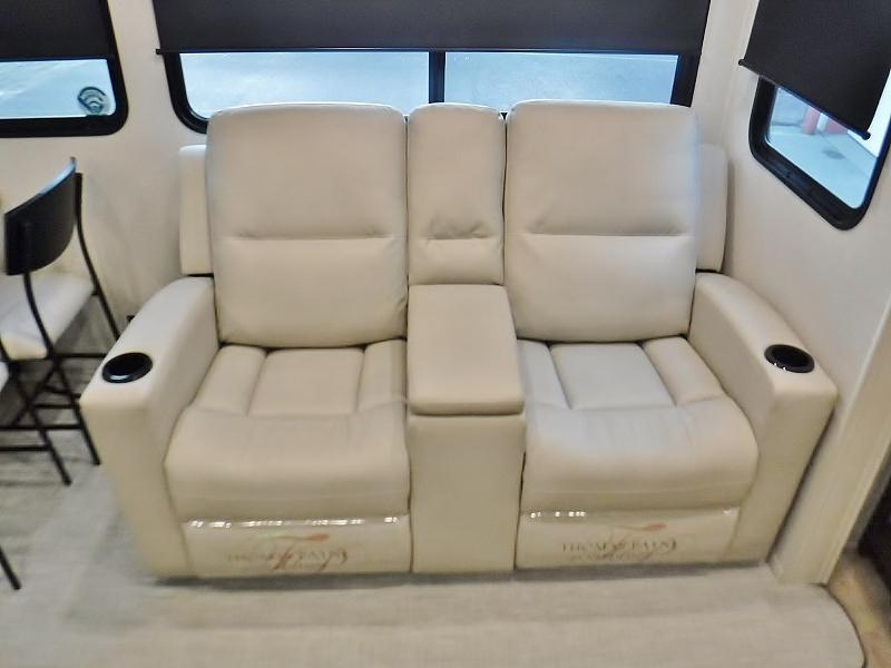 The great outdoors is calling your name in this triple slide out fifth wheel. The kitchen is any chef's dream with its kitchen island, residential 12V refrigerator, and large transom window at the cooktop to let a breeze in. The theater seating is directly across from the entertainment center for easy viewing, and you'll find additional seating on the 78" tri-fold hide-a-bed sofa and free-standing table. Cleaning up each day will be a breeze with the shower with a seat and sliding glass doors. The front private bedroom includes a king bed slide out, a large front wardrobe, plus washer and dryer prep to make camping even easier.