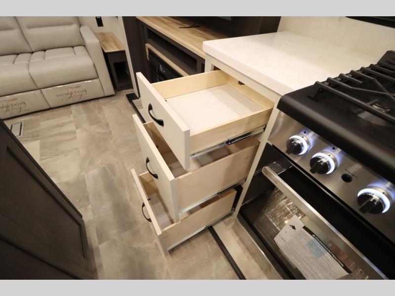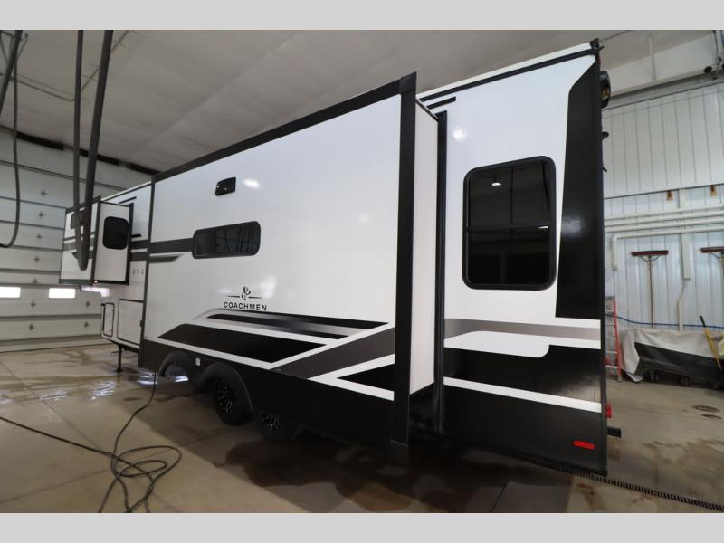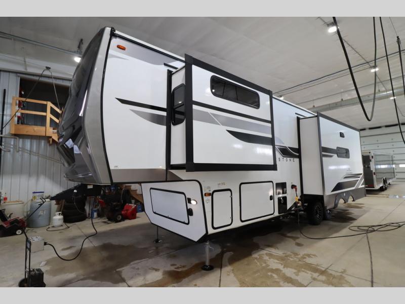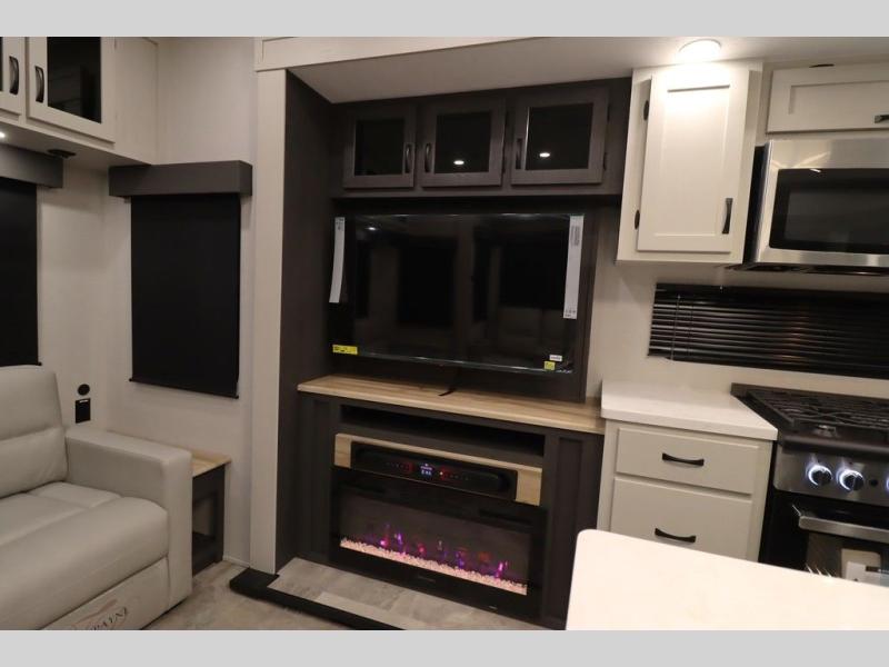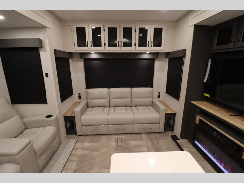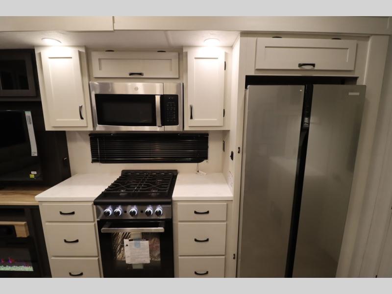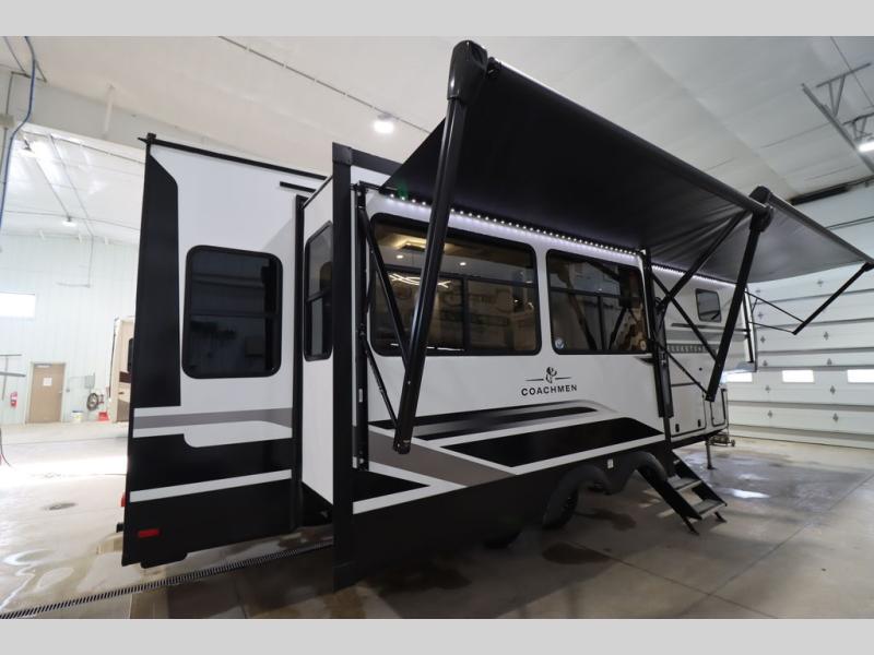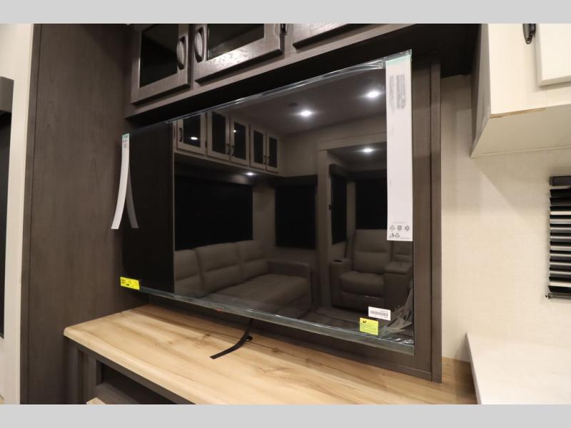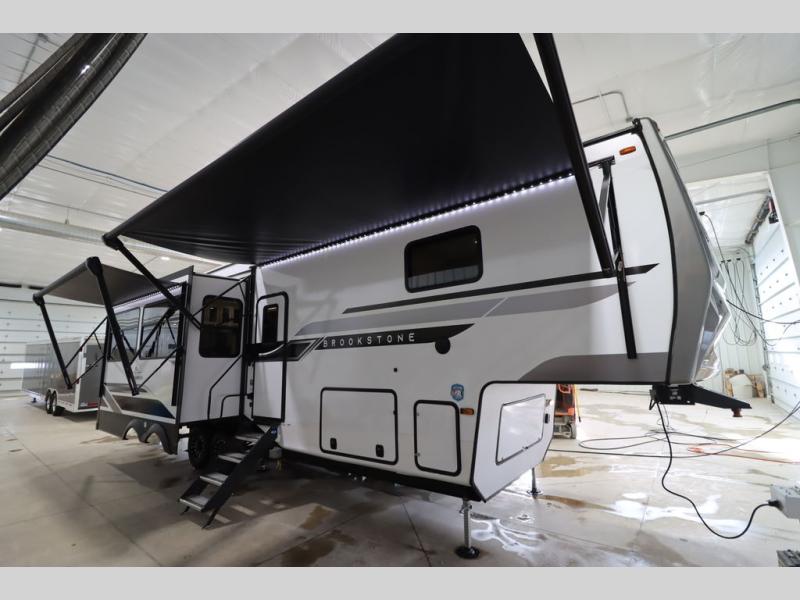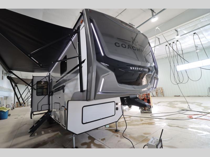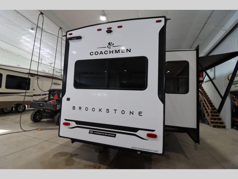 The Brookstone fifth wheels by Coachmen are coming to you with wide-body comfort, home-like amenities, and unique designs for a truly luxurious RV. The Weather Shield+ consists of a 6X double Azdel aluminum cage sidewall system, a Radiant Pro weather barrier system and more, all built to keep you in your fifth wheel comfortable and capable in varying weather. Head inside to find solid surface countertops in the kitchen, an 4K Smart LED TV in the living room, slow rise blackout roller night shades, and the list of comforts goes on! The Brookstone also includes 6-point electric auto-leveling, four step MORryde StepAbove main entry, an electric awning with LED lights, and many more exterior conveniences!