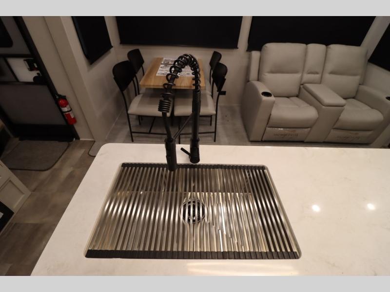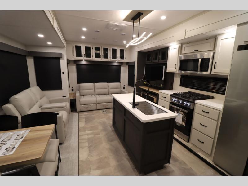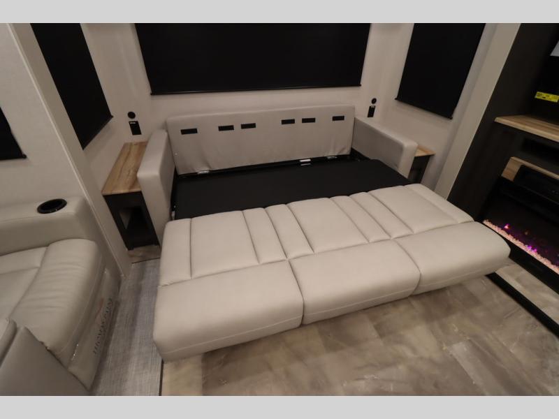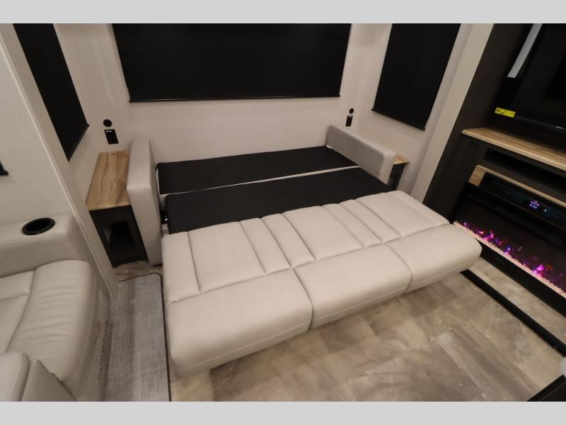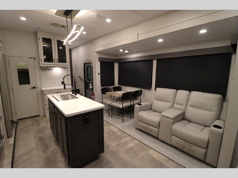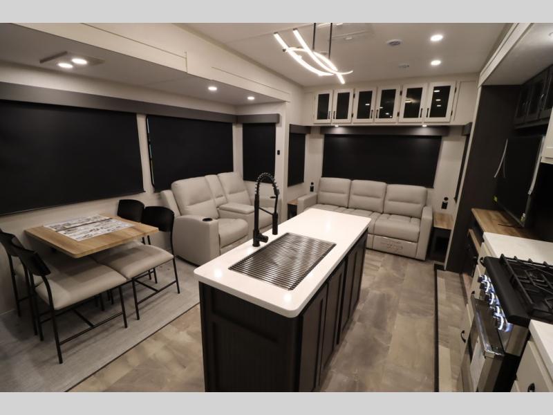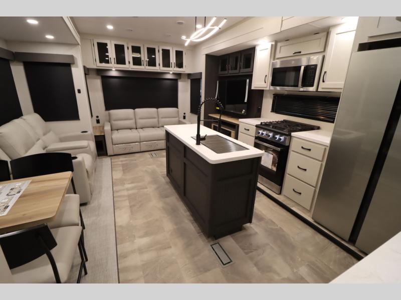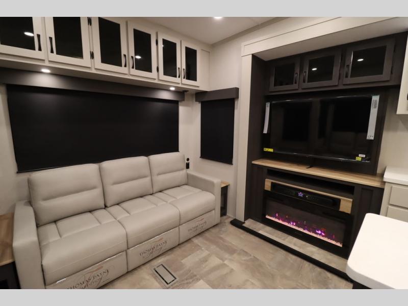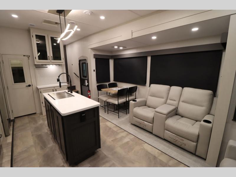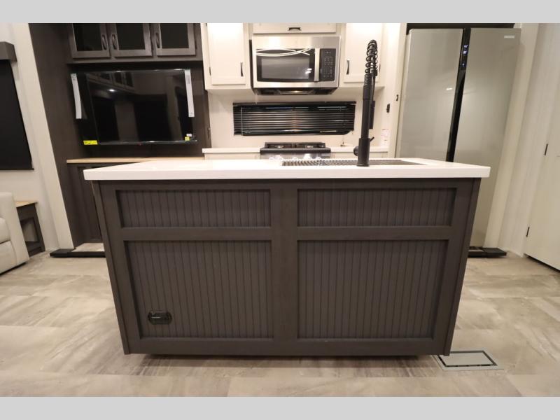 The great outdoors is calling your name in this triple slide out fifth wheel. The kitchen is any chef's dream with its kitchen island, residential 12V refrigerator, and large transom window at the cooktop to let a breeze in. The theater seating is directly across from the entertainment center for easy viewing, and you'll find additional seating on the 78" tri-fold hide-a-bed sofa and free-standing table. Cleaning up each day will be a breeze with the shower with a seat and sliding glass doors. The front private bedroom includes a king bed slide out, a large front wardrobe, plus washer and dryer prep to make camping even easier.