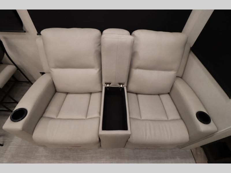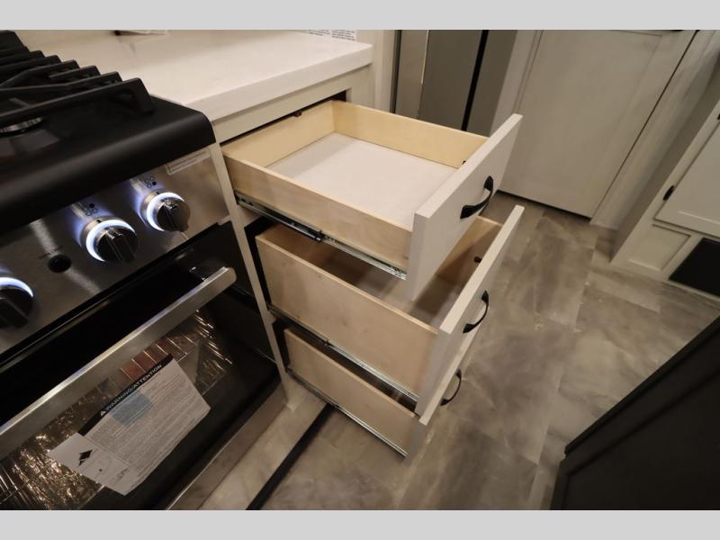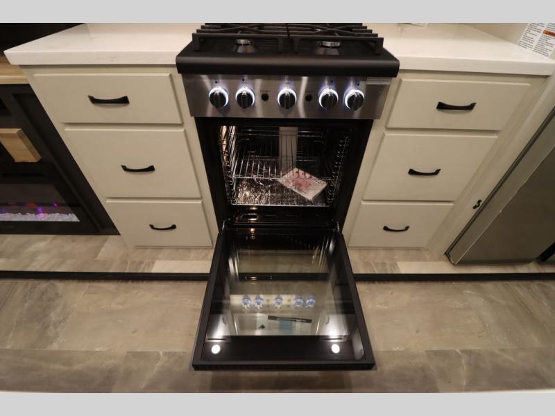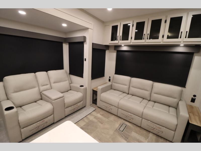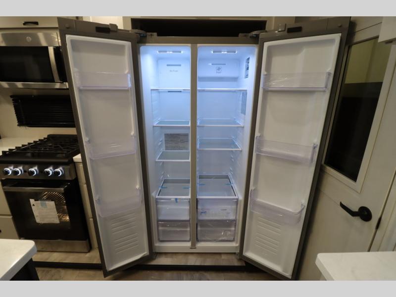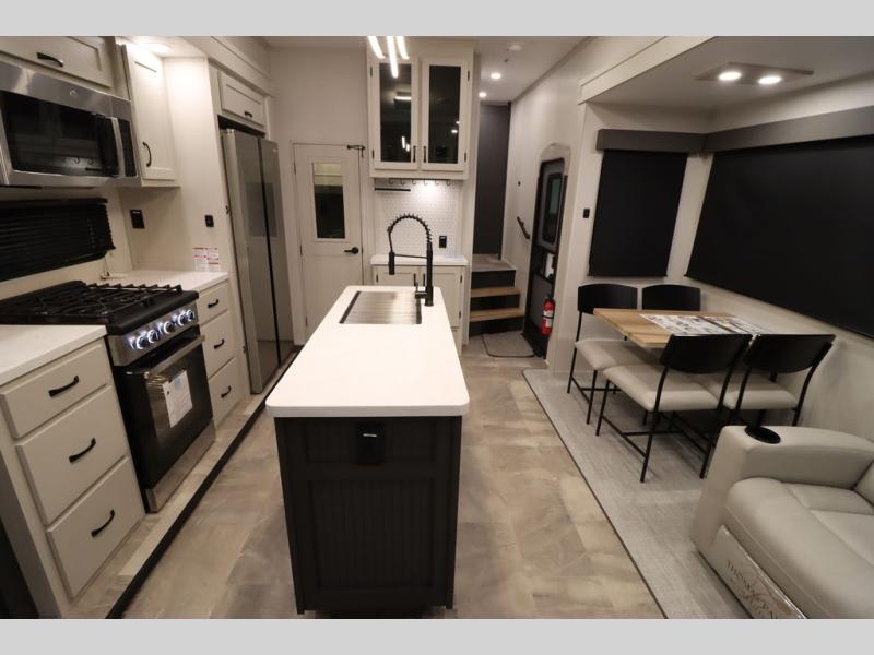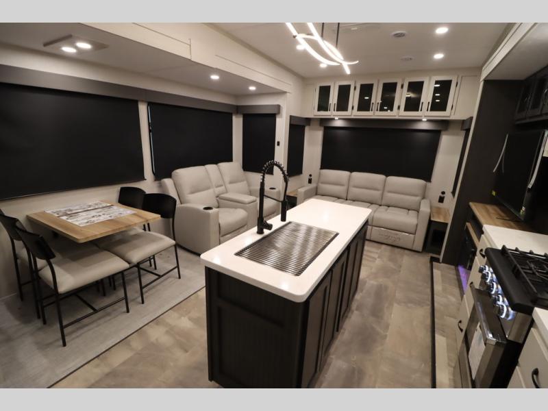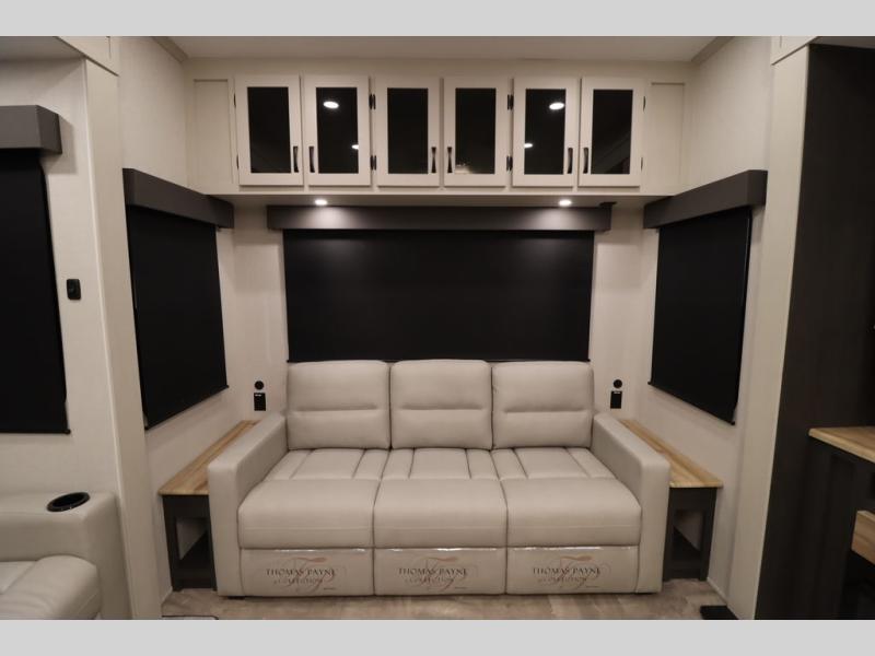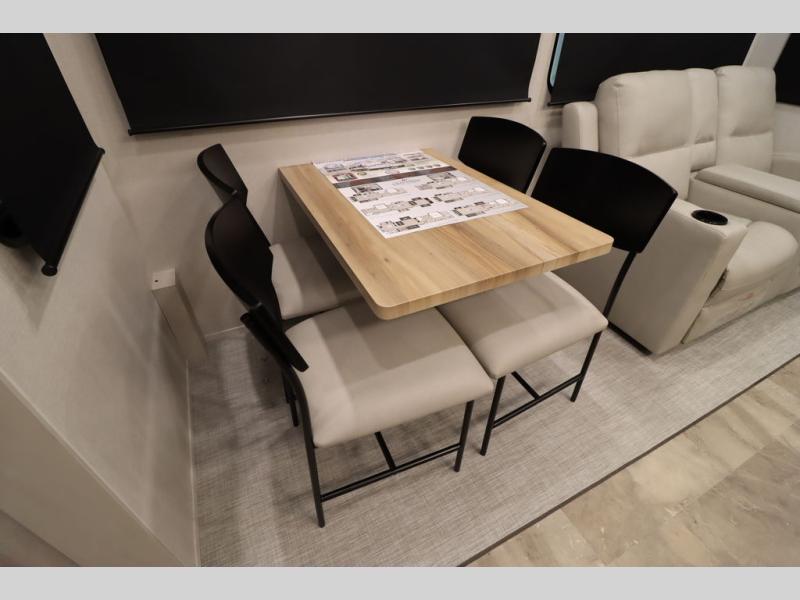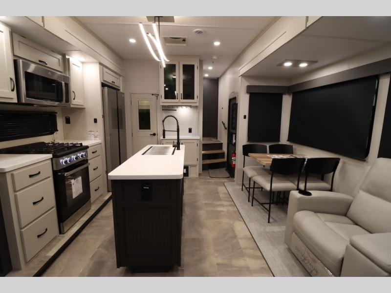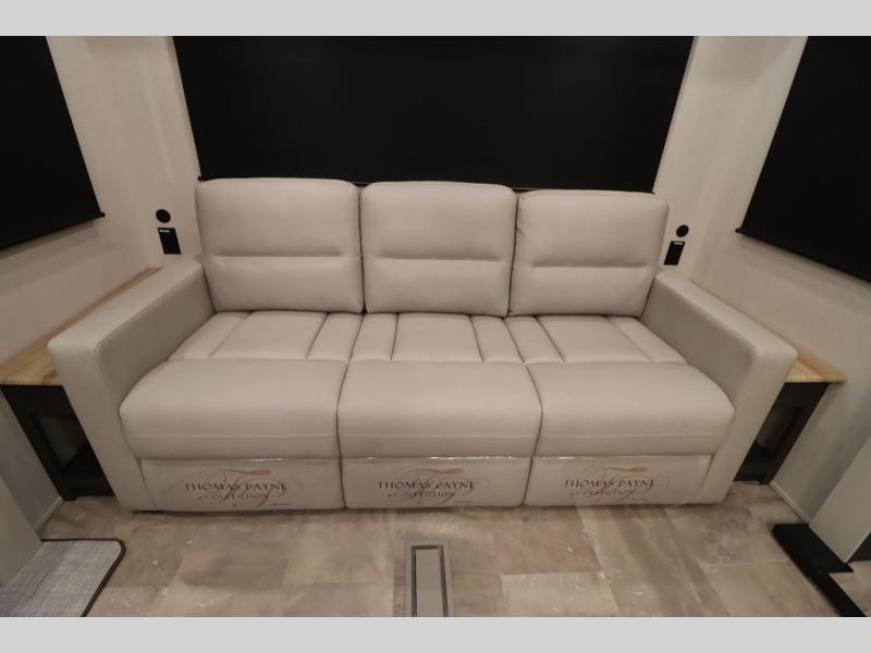 The great outdoors is calling your name in this triple slide out fifth wheel. The kitchen is any chef's dream with its kitchen island, residential 12V refrigerator, and large transom window at the cooktop to let a breeze in. The theater seating is directly across from the entertainment center for easy viewing, and you'll find additional seating on the 78" tri-fold hide-a-bed sofa and free-standing table. Cleaning up each day will be a breeze with the shower with a seat and sliding glass doors. The front private bedroom includes a king bed slide out, a large front wardrobe, plus washer and dryer prep to make camping even easier.