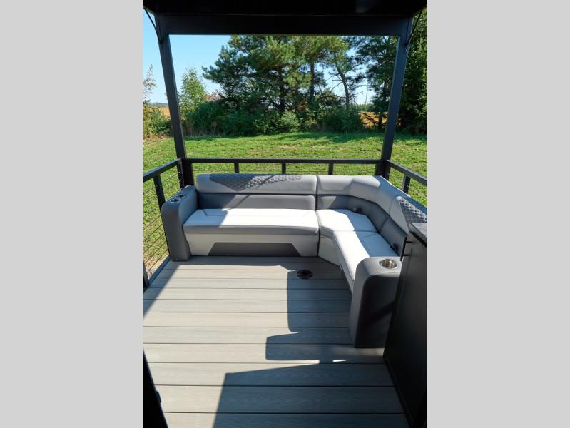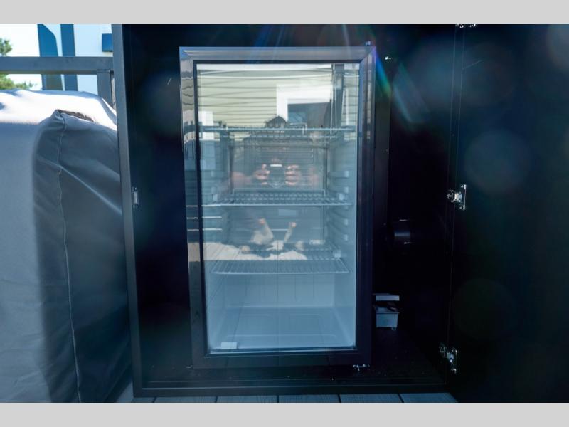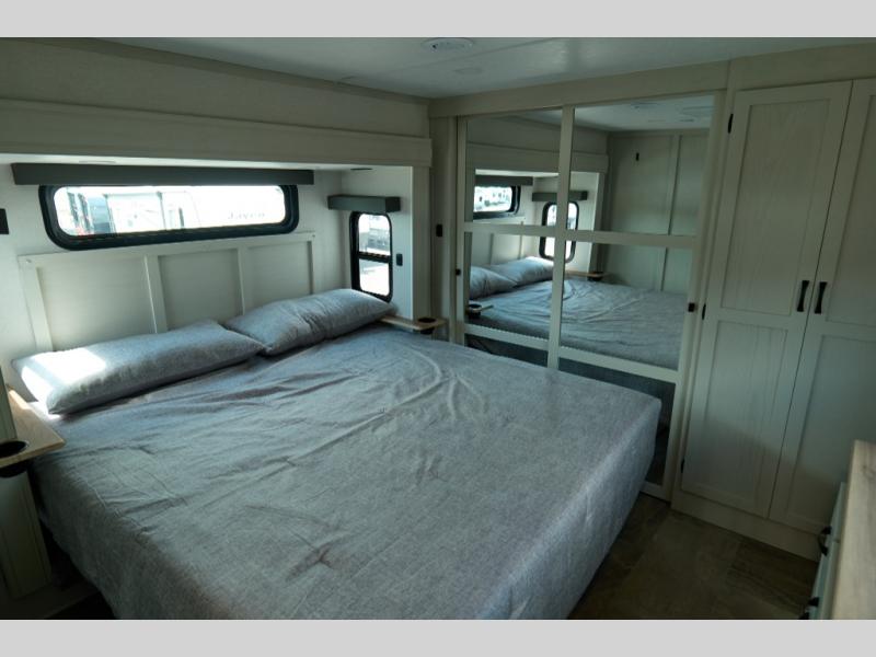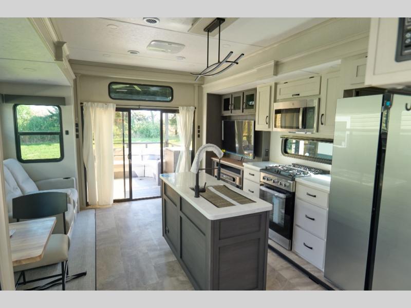 Step outside and enjoy the fresh air on our covered patio, complete with a refrigerator and L-shaped sofa, which is the perfect place to relax and unwind after a long day of adventure. Inside, the kitchen/living room area will make you feel an at-home experience, featuring overhead cabinets, an entertainment center, theater seating, a free-spanning table, a kitchen island, a microwave, a refrigerator, and a pantry. Perfect for cooking up a storm, entertaining friends and family, or simply relaxing and enjoying the comforts of home. The full bathroom is a spacious oasis, complete with a shower with a seat, a linen closet, and more. Plus, with a front bedroom featuring a king bed, dresser, washer and dryer prep, and a large wardrobe, you'll have the perfect place to rest and recharge after a long day of adventure. With two entry/exit doors and a massive 17’ awning, you'll have easy access to the RV and plenty of shade and protection from the weather.