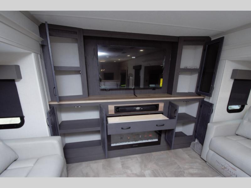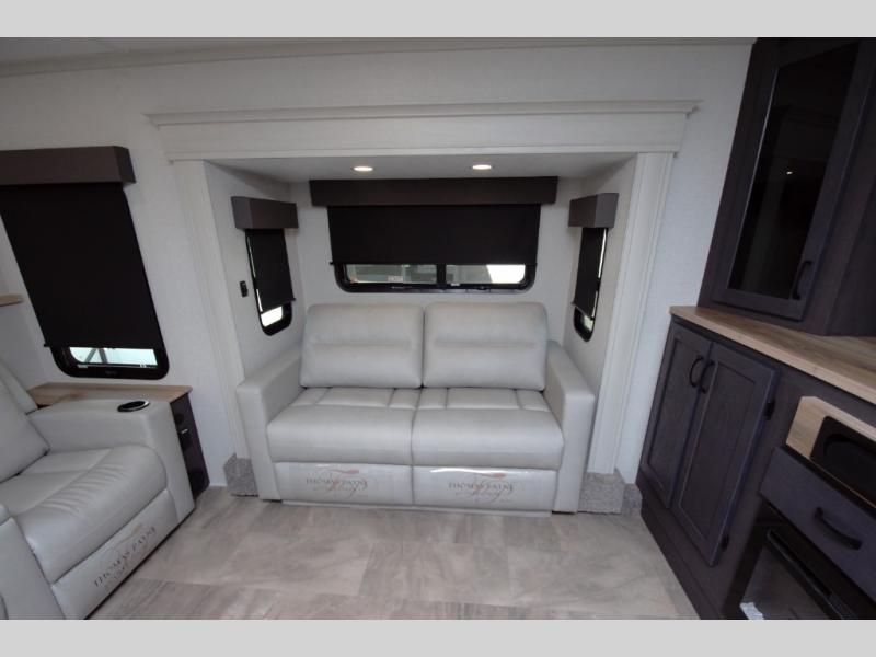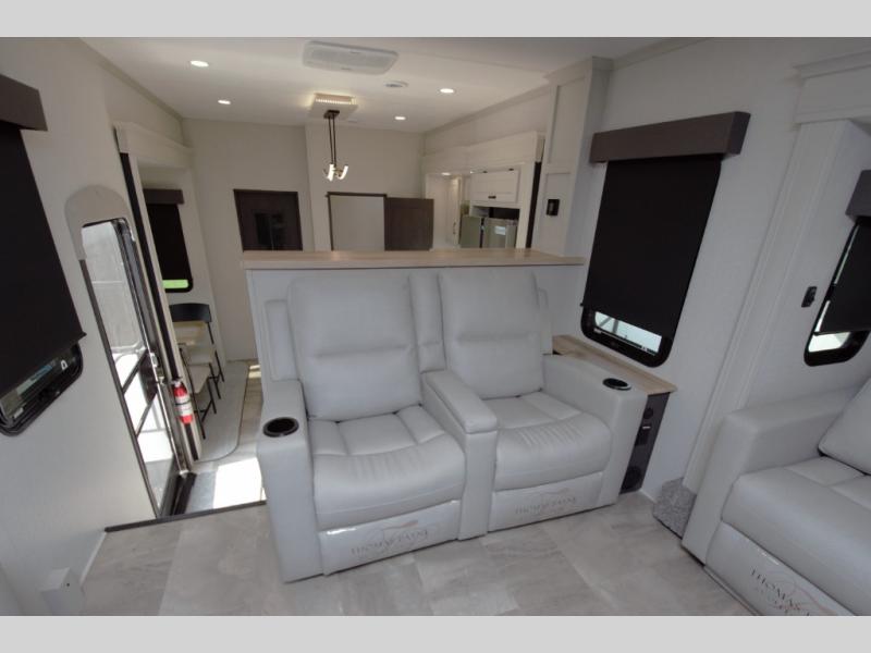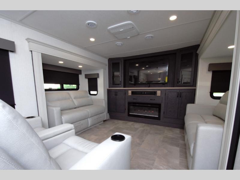Relax in a front living space made for entertaining. Dual opposing slide outs open up the room, offering two tri fold sofas and comfortable theater seating. Perfect for movie nights or extra sleeping space for guests.