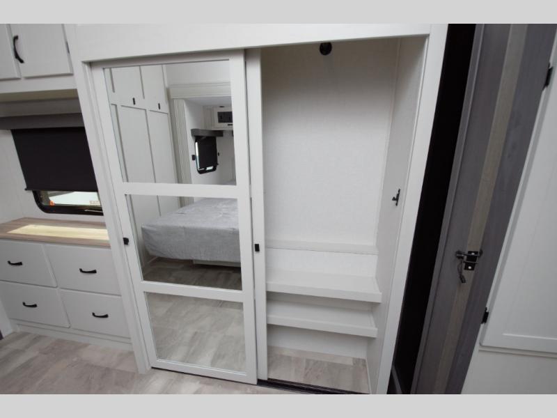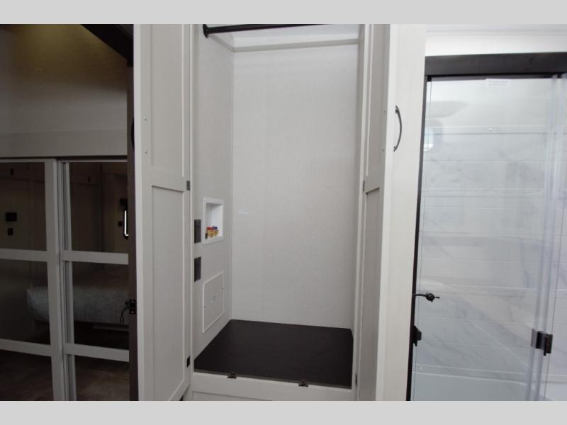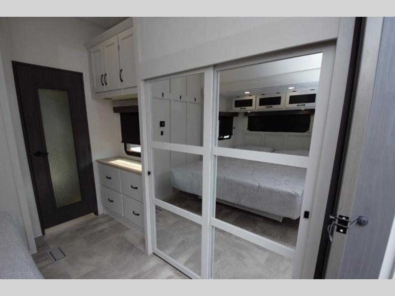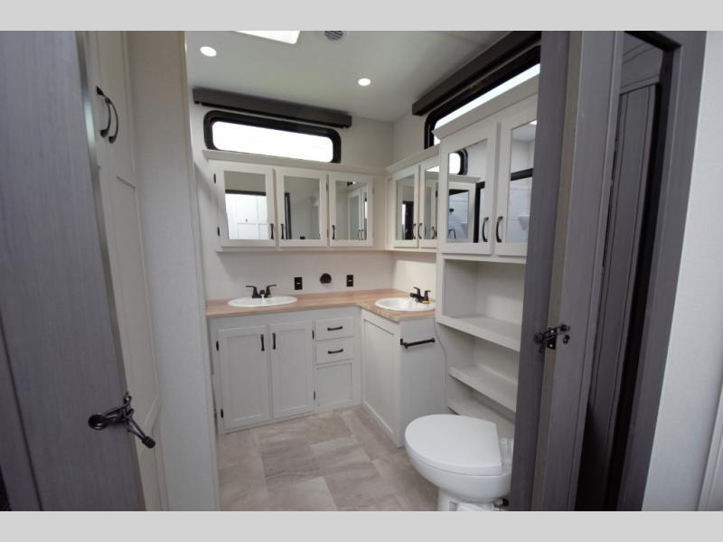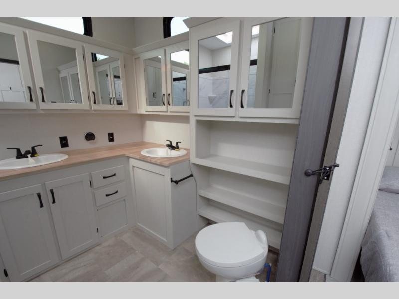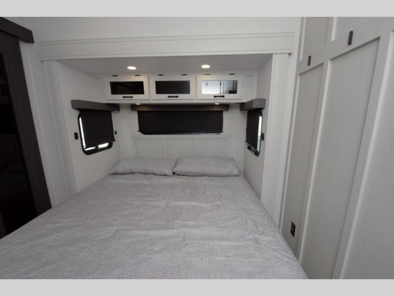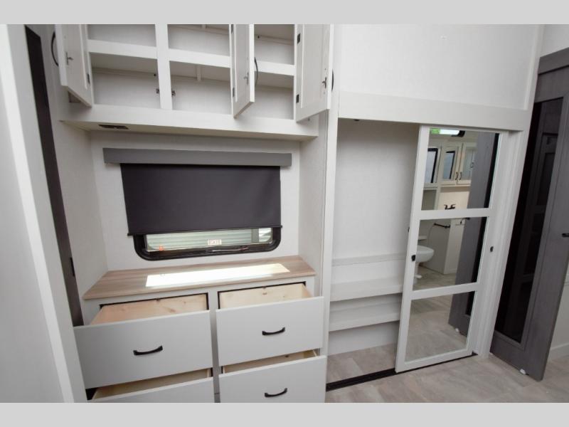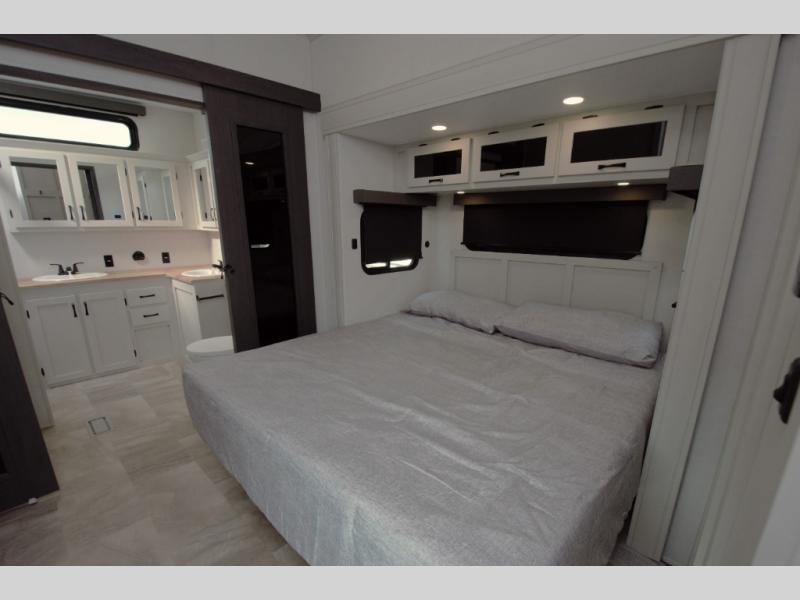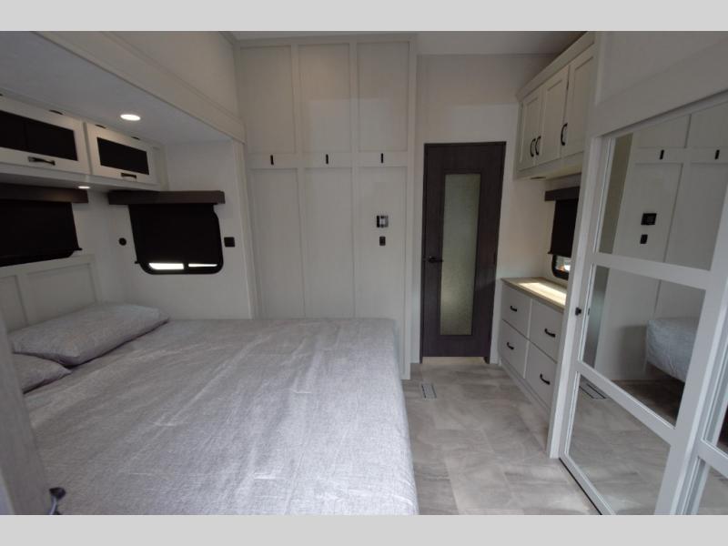Enjoy a quiet retreat in the rear bedroom, featuring a king bed slide out, dresser, and large wardrobe. Private access to the full rear bathroom adds to the comfort and convenience.