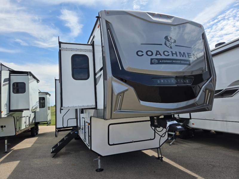The Brookstone fifth wheels by Coachmen are coming to you with wide-body comfort, home-like amenities, and unique designs for a truly luxurious RV. The Weather Shield+ consists of a 6X double Azdel aluminum cage sidewall system, a Radiant Pro weather barrier system, and more that will help you extend your camping season or go full-time. Head inside to find solid surface countertops in the kitchen, an 4K Smart LED TV in the living room, slow rise roller night shades, and the list of comforts goes on! The Brookstone also includes 6-point electric auto-leveling, four Solid Step entry steps, an electric awning with LED lights, and many more exterior conveniences!