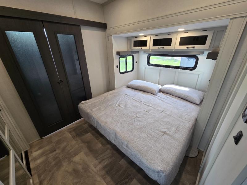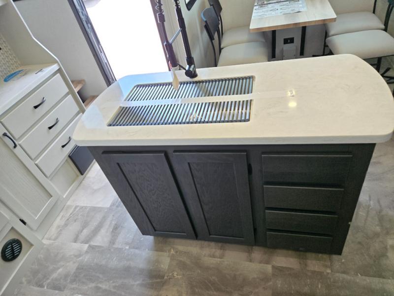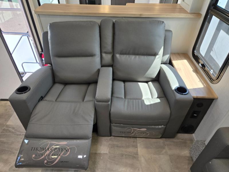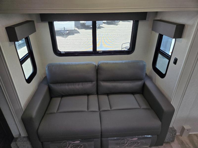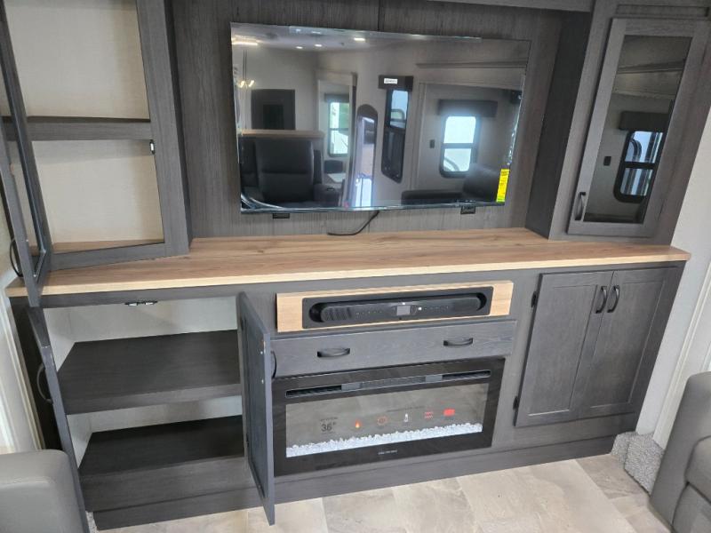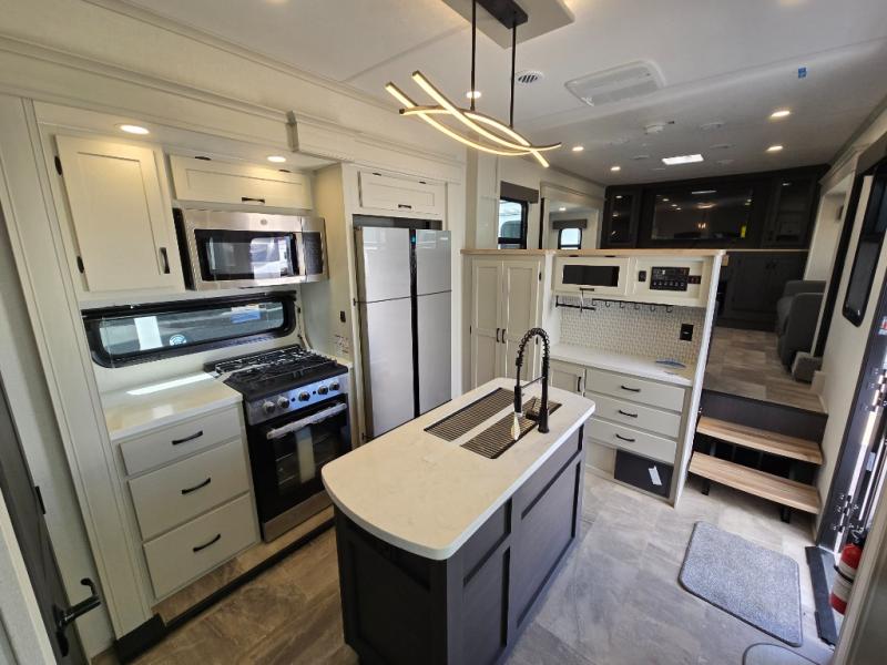 If you're looking for a luxury fifth wheel with more space and a larger sleeping capacity, you've found it! There are an impressive five slides, including dual opposing slides in the front living area and kitchen so you can really stretch out. Everyone will love to gather in the front living area on the two tri-fold sofas and theatre seating, and this room can become your guests' bedroom at night. The little ones will love to play a game at the free-standing table while the chef cooks dinner on the residential cooktop with a stainless steel oven. You'll also find a pantry here for dry goods and a 12V refrigerator for perishables. The feature that really stands out in this model is the master suite, take a look! A king bed slide and you'll have a dresser and a wardrobe for your clothes, plus access to the full bathroom. The spacious full rear bath includes a large shower with a seat, a large dual sink vanity, and a wardrobe with washer and dryer prep. And we didn't even mention the outside refrigerator that will be perfect for cold drinks under the 14' power awning!