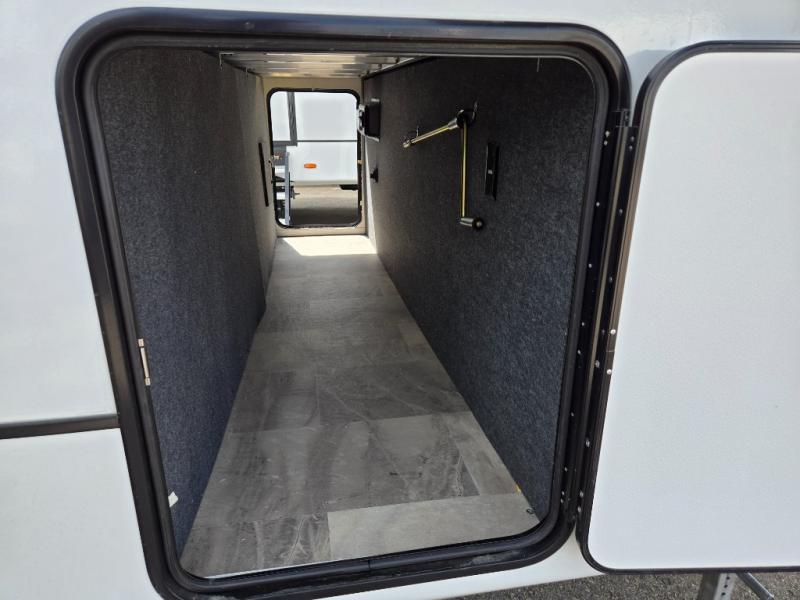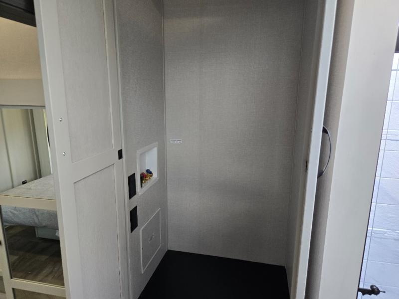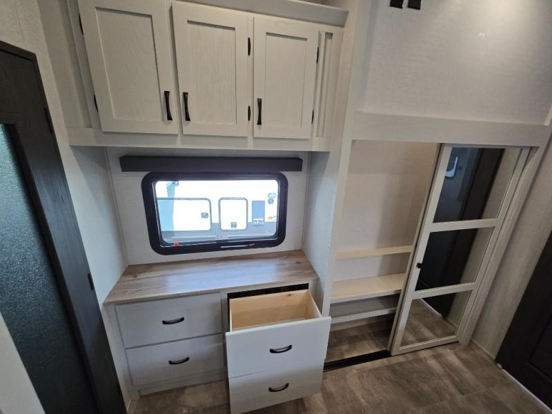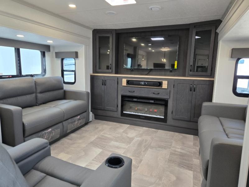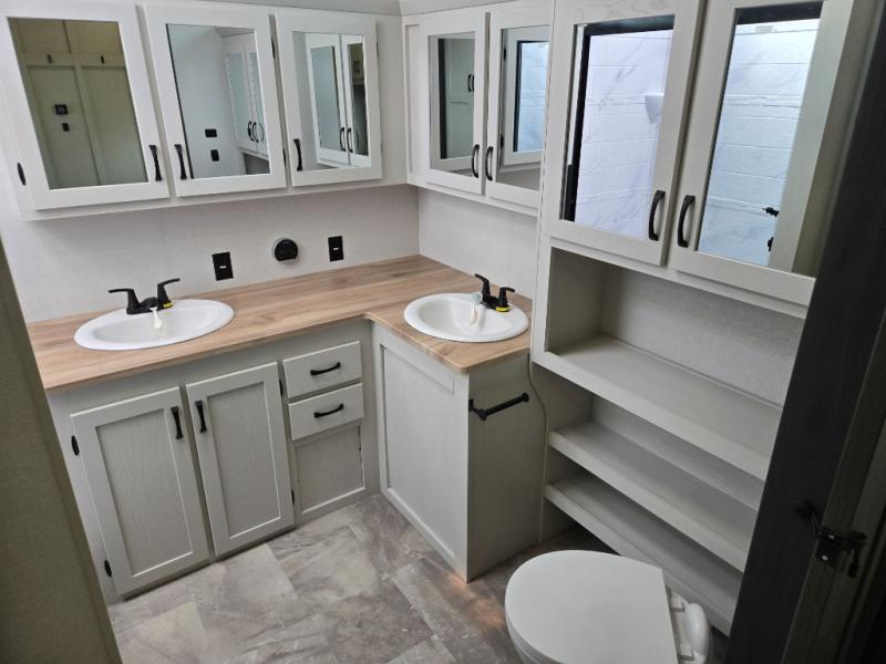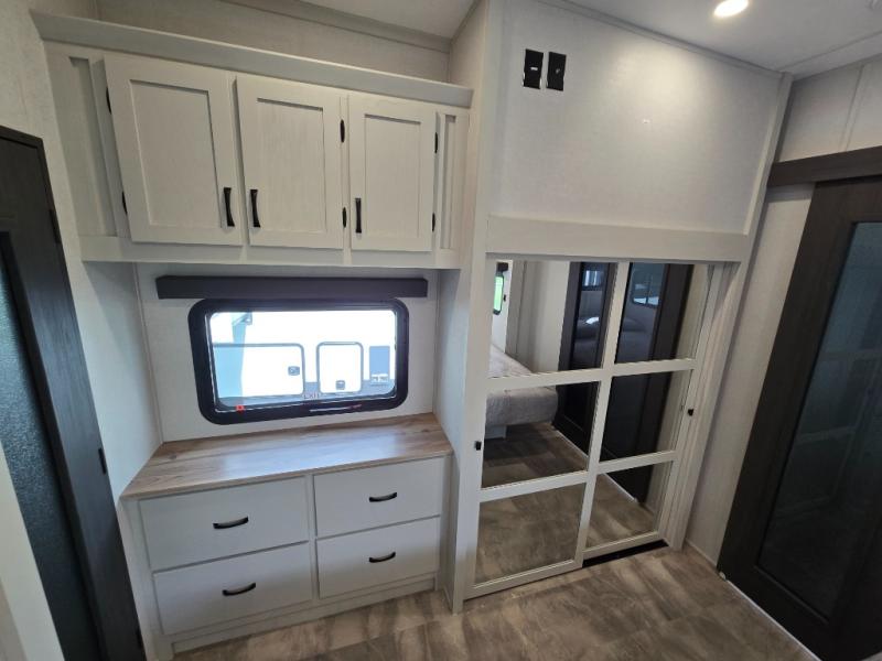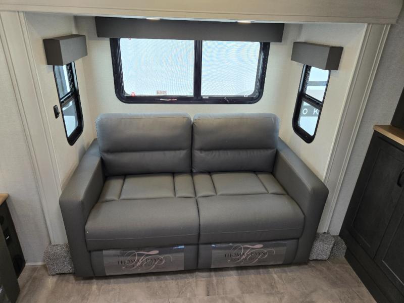 If you're looking for a luxury fifth wheel with more space and a larger sleeping capacity, you've found it! There are an impressive five slides, including dual opposing slides in the front living area and kitchen so you can really stretch out. Everyone will love to gather in the front living area on the two tri-fold sofas and theatre seating, and this room can become your guests' bedroom at night. The little ones will love to play a game at the free-standing table while the chef cooks dinner on the residential cooktop with a stainless steel oven. You'll also find a pantry here for dry goods and a 12V refrigerator for perishables. The feature that really stands out in this model is the master suite, take a look! A king bed slide and you'll have a dresser and a wardrobe for your clothes, plus access to the full bathroom. The spacious full rear bath includes a large shower with a seat, a large dual sink vanity, and a wardrobe with washer and dryer prep. And we didn't even mention the outside refrigerator that will be perfect for cold drinks under the 14' power awning!