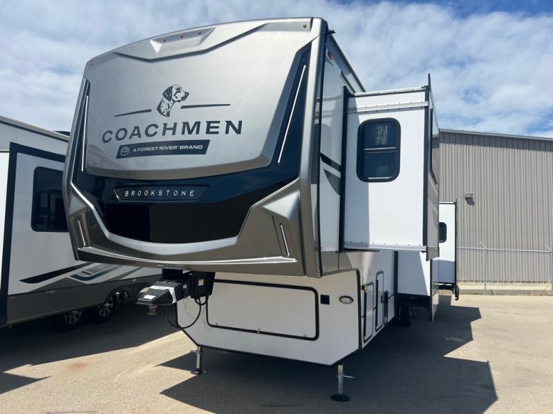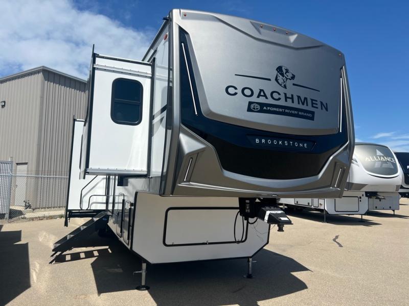 The Brookstone fifth wheels by Coachmen are coming to you with wide-body comfort, home-like amenities, and unique designs for a truly luxurious RV. The Weather Shield+ consists of a 6X double Azdel aluminum cage sidewall system, a Radiant Pro weather barrier system, and more that will help you extend your camping season or go full-time. Head inside to find solid surface countertops in the kitchen, an 4K Smart LED TV in the living room, slow rise roller night shades, and the list of comforts goes on! The Brookstone also includes 6-point electric auto-leveling, four Solid Step entry steps, an electric awning with LED lights, and many more exterior conveniences!
