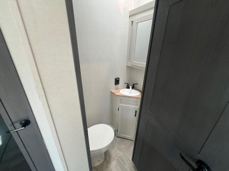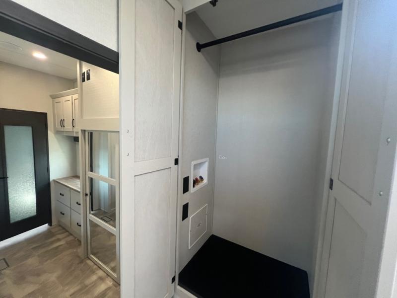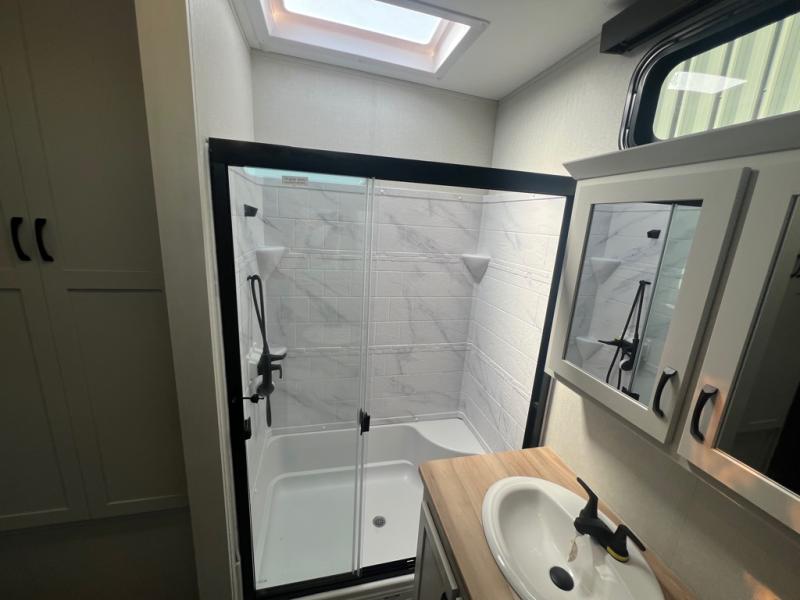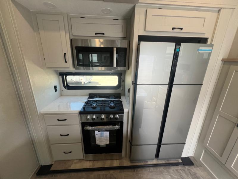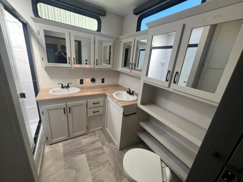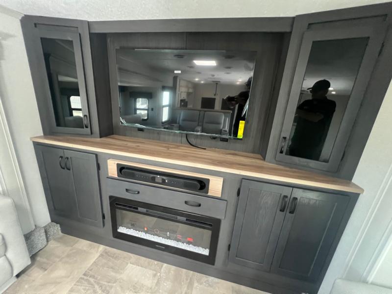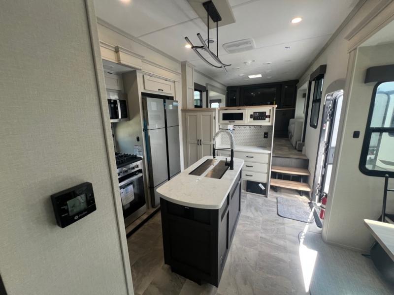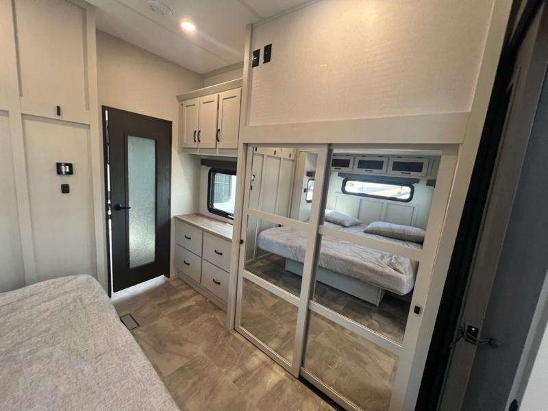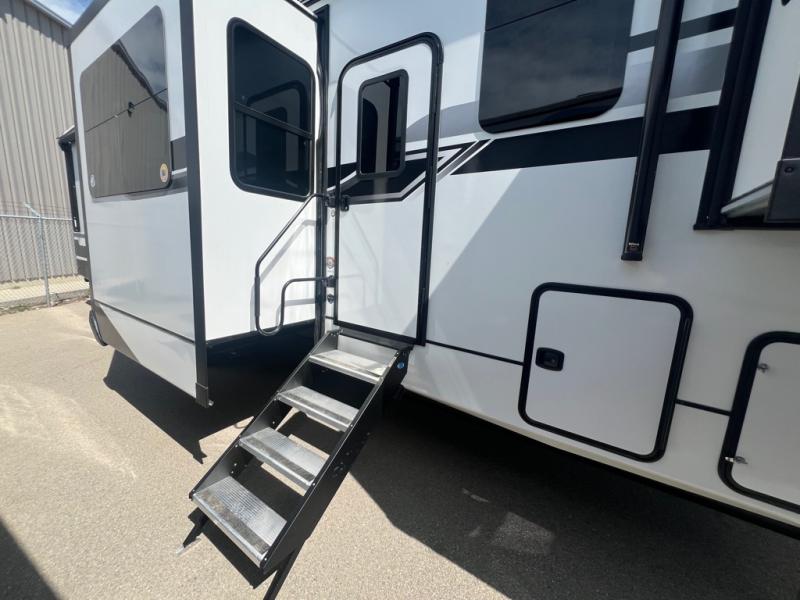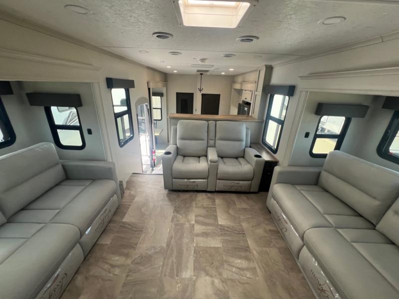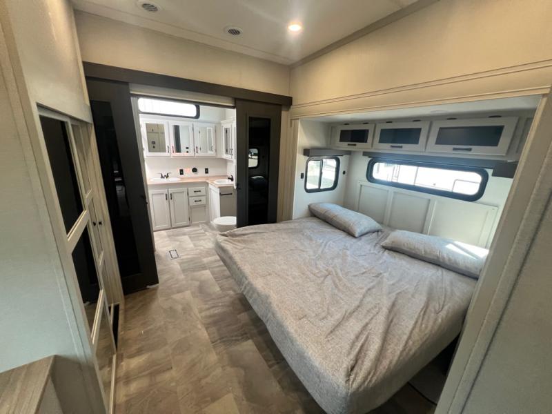 If you're looking for a luxury fifth wheel with more space and a larger sleeping capacity, you've found it! There are an impressive five slides, including dual opposing slides in the front living area and kitchen so you can really stretch out. Everyone will love to gather in the front living area on the two tri-fold sofas and theatre seating, and this room can become your guests' bedroom at night. The little ones will love to play a game at the free-standing table while the chef cooks dinner on the residential cooktop with a stainless steel oven. You'll also find a pantry here for dry goods and a 12V refrigerator for perishables. The feature that really stands out in this model is the master suite, take a look! A king bed slide and you'll have a dresser and a wardrobe for your clothes, plus access to the full bathroom. The spacious full rear bath includes a large shower with a seat, a large dual sink vanity, and a wardrobe with washer and dryer prep. And we didn't even mention the outside refrigerator that will be perfect for cold drinks under the 14' power awning!