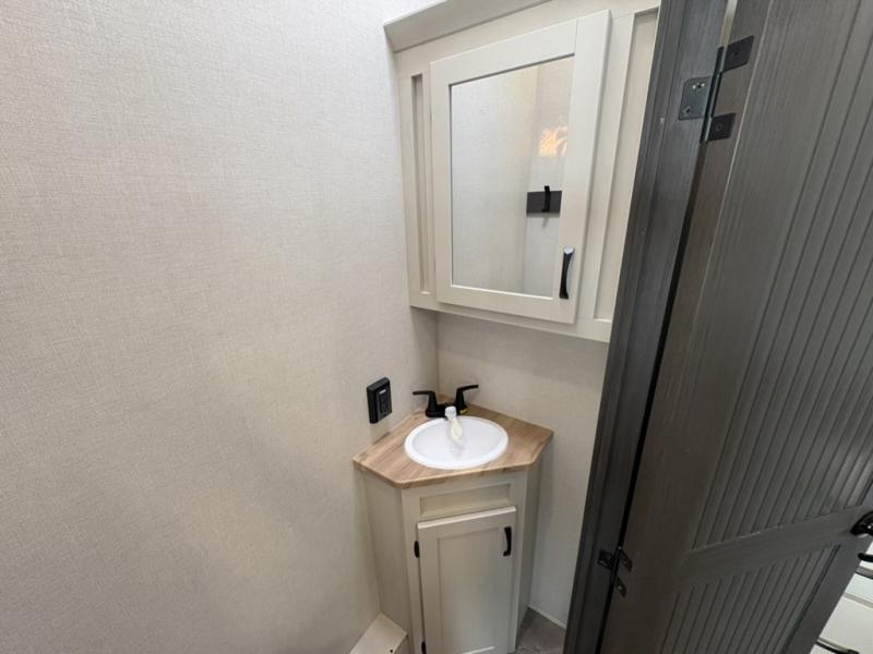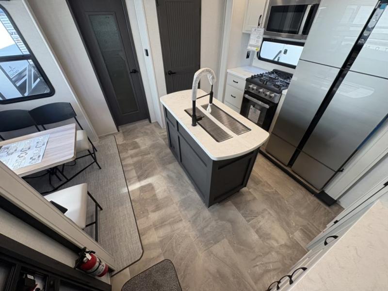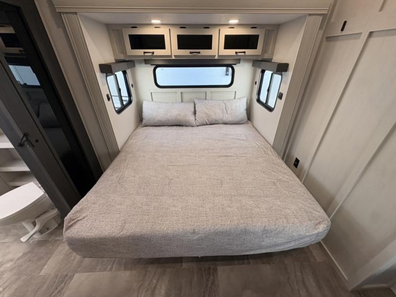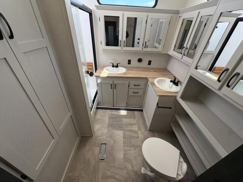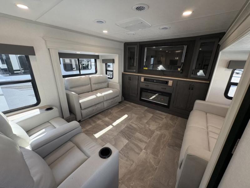If you're looking for a luxury fifth wheel with more space and a larger sleeping capacity, you've found it! There are an impressive five slides, including dual opposing slides in the front living area and kitchen so you can really stretch out. Everyone will love to gather in the front living area on the two tri-fold sofas and theatre seating, and this room can become your guests' bedroom at night. The little ones will love to play a game at the free-standing table while the chef cooks dinner on the residential cooktop with a stainless steel oven. You'll also find a pantry here for dry goods and a 12V refrigerator for perishables. The feature that really stands out in this model is the master suite, take a look! A king bed slide and you'll have a dresser and a wardrobe for your clothes, plus access to the full bathroom. The spacious full rear bath includes a large shower with a seat, a large dual sink vanity, and a wardrobe with washer and dryer prep. And we didn't even mention the outside refrigerator that will be perfect for cold drinks under the 14' power awning!