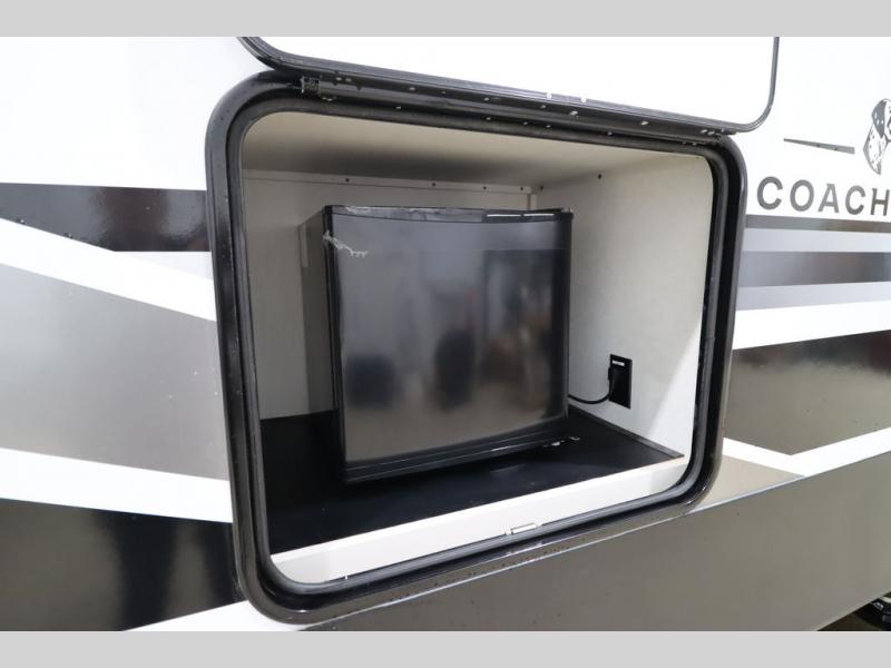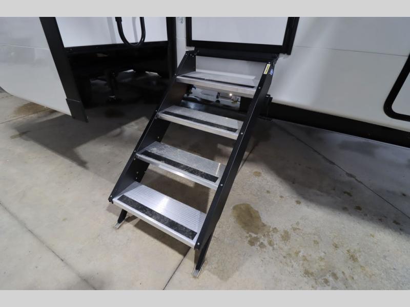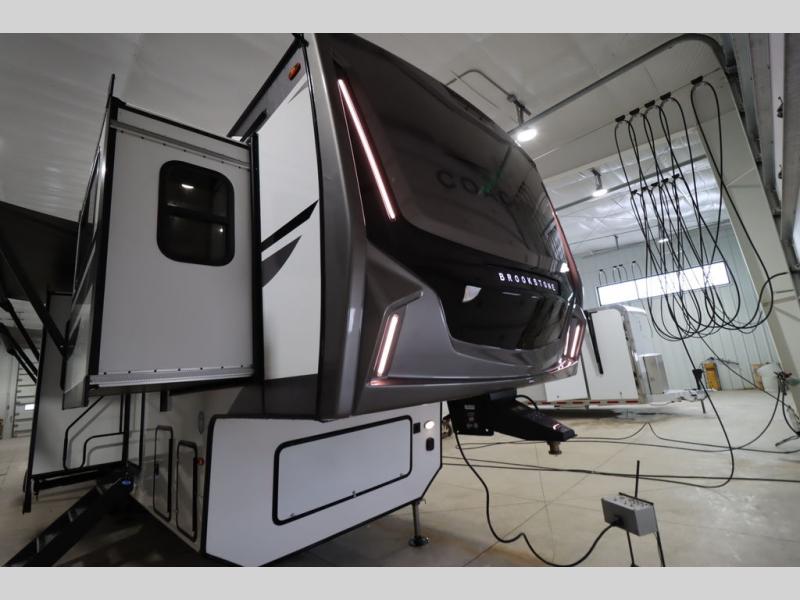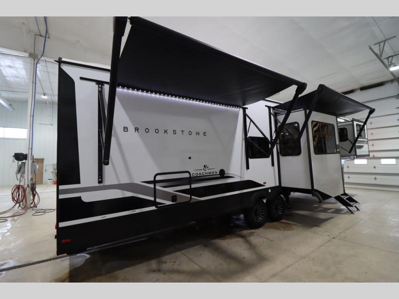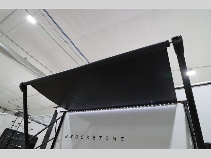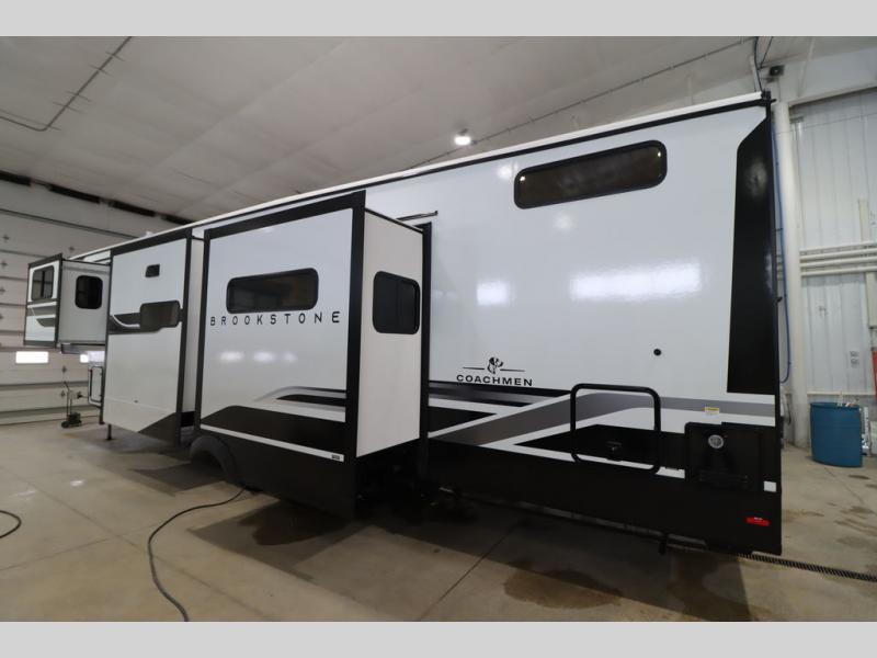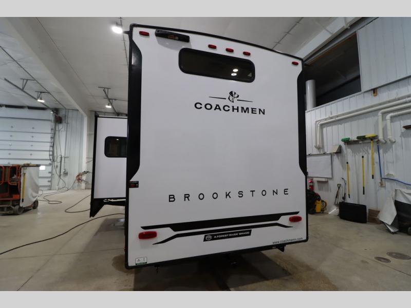 he Brookstone fifth wheels by Coachmen are coming to you with wide-body comfort, home-like amenities, and unique designs for a truly luxurious RV. The Weather Shield+ consists of a 6X double Azdel aluminum cage sidewall system, a Radiant Pro weather barrier system and more, all built to keep you in your fifth wheel comfortable and capable in varying weather. Head inside to find solid surface countertops in the kitchen, an 4K Smart LED TV in the living room, slow rise blackout roller night shades, and the list of comforts goes on! The Brookstone also includes 6-point electric auto-leveling, four step MORryde StepAbove main entry, an electric awning with LED lights, and many more exterior conveniences!