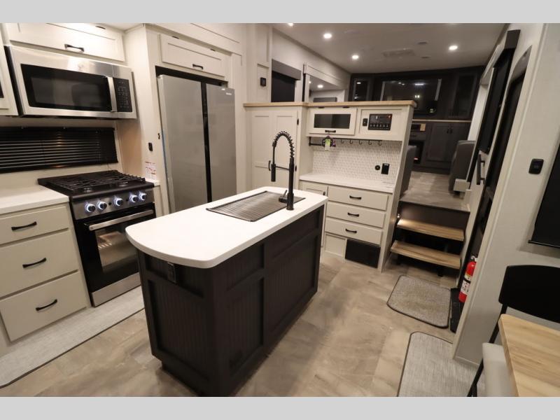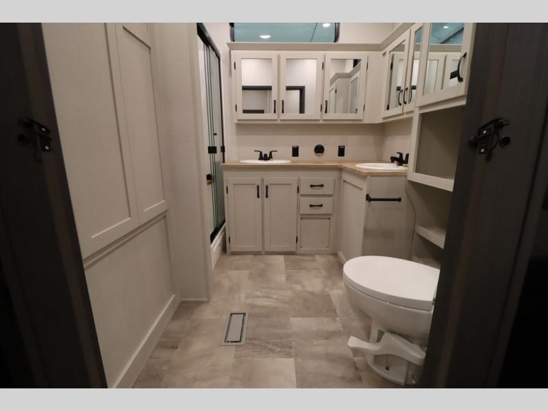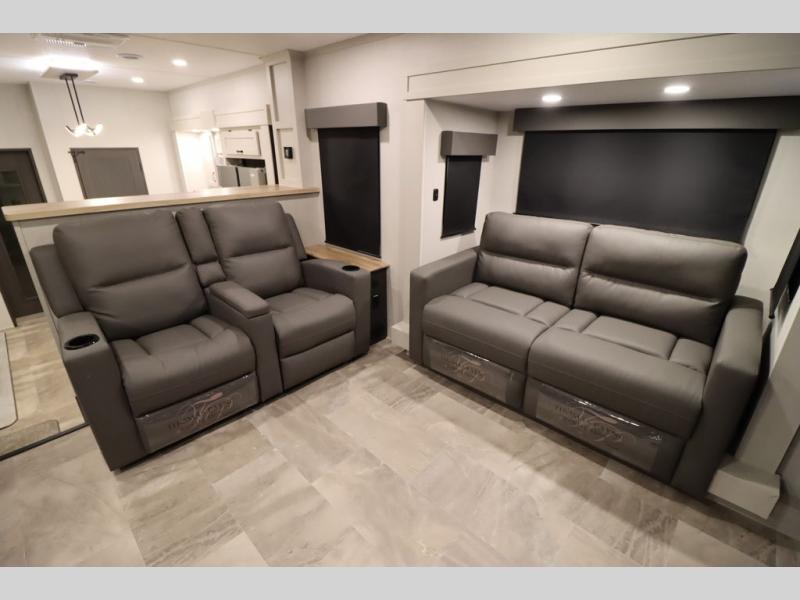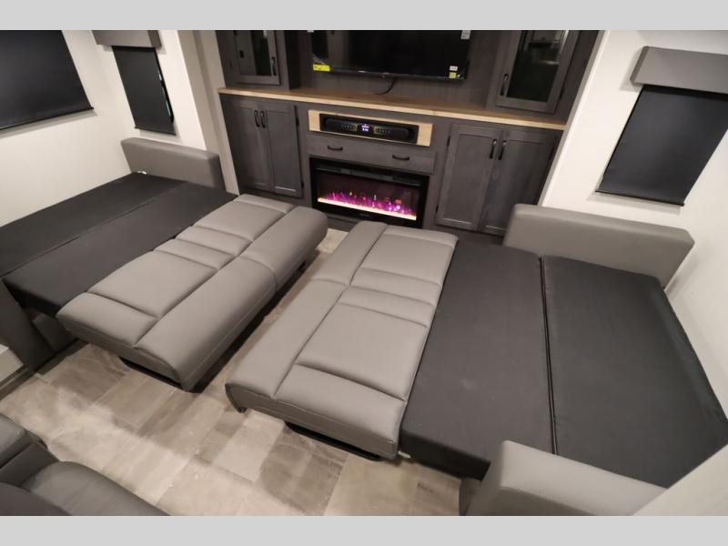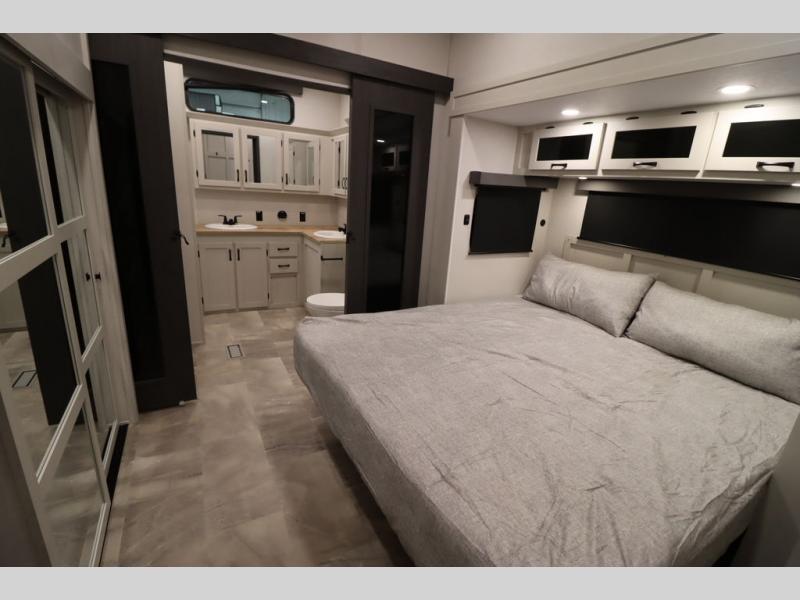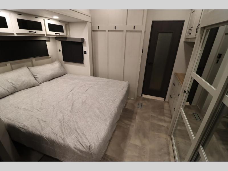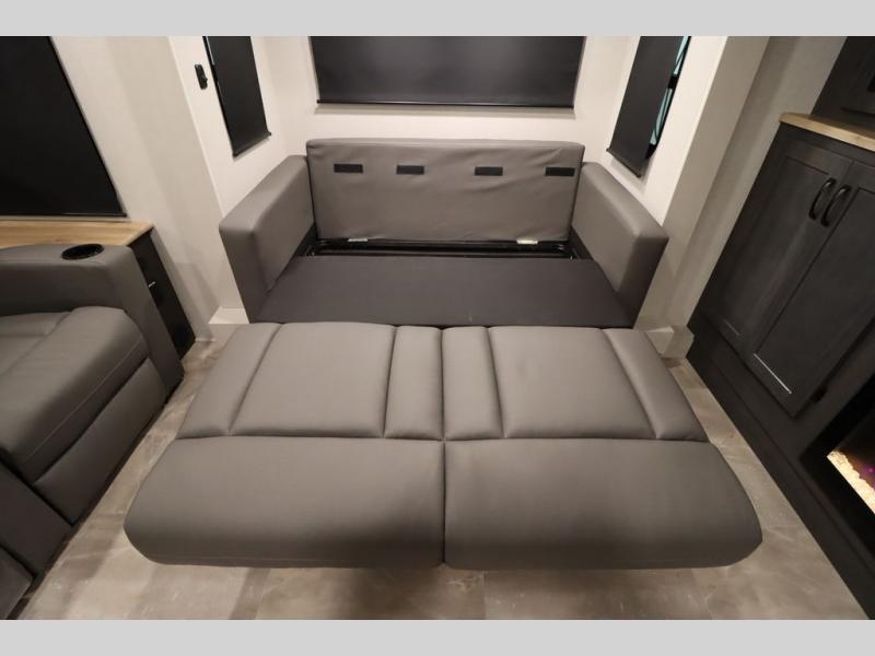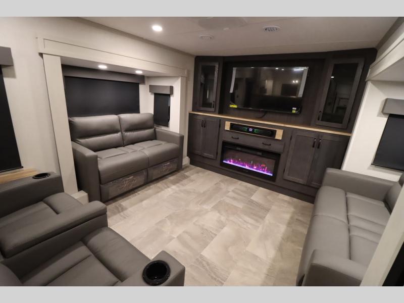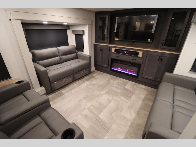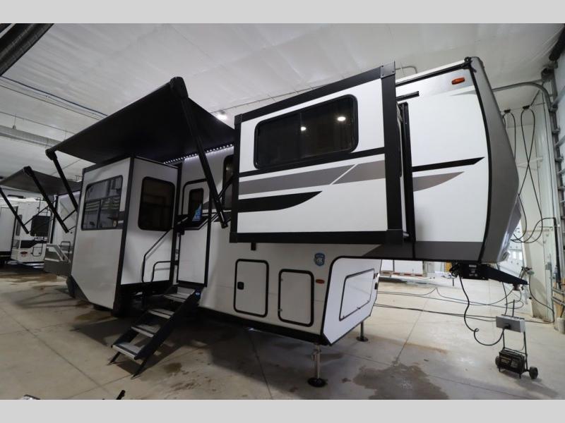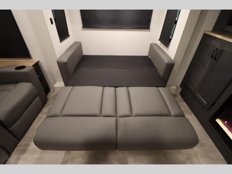 If you're looking for a luxury fifth wheel with more space and a larger sleeping capacity, you've found it! There are an impressive five slides, including dual opposing slides in the front living area and kitchen so you can really stretch out. Everyone will love to gather in the front living area on the two tri-fold sofas and theatre seating, and this room can become your guests' bedroom at night. The little ones will love to play a game at the free-standing table while the chef cooks dinner on the residential cooktop with a stainless steel oven. You'll also find a pantry here for dry goods and a 12V refrigerator for perishables. The feature that really stands out in this model is the master suite, take a look! A king bed slide and you'll have a dresser and a wardrobe for your clothes, plus access to the full bathroom. The spacious full rear bath includes a large shower with a seat, a large dual sink vanity, and a wardrobe with washer and dryer prep. And we didn't even mention the outside refrigerator that will be perfect for cold drinks under the 14' power awning!