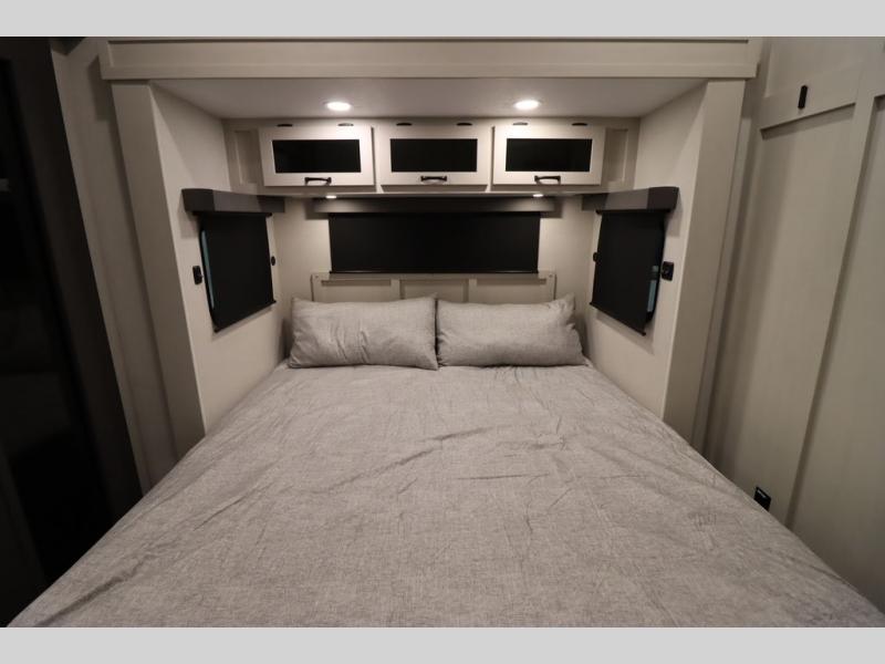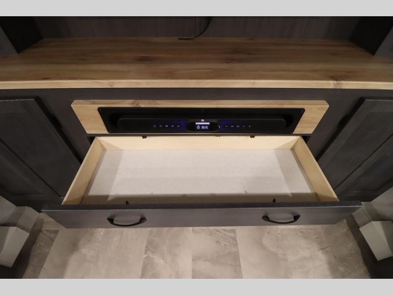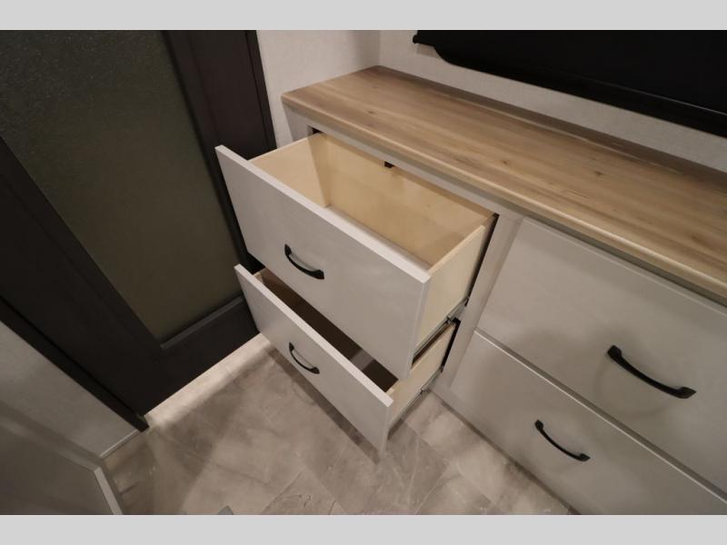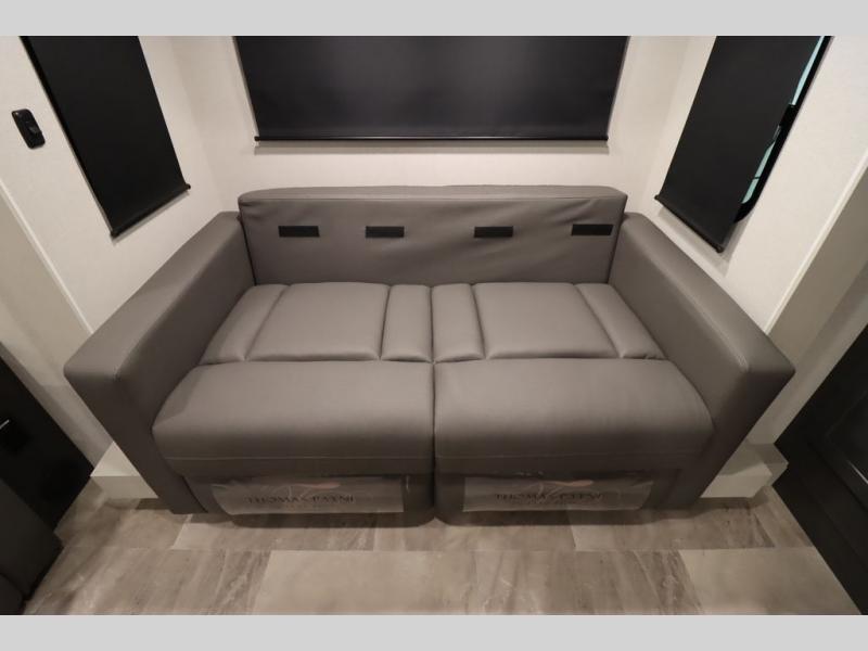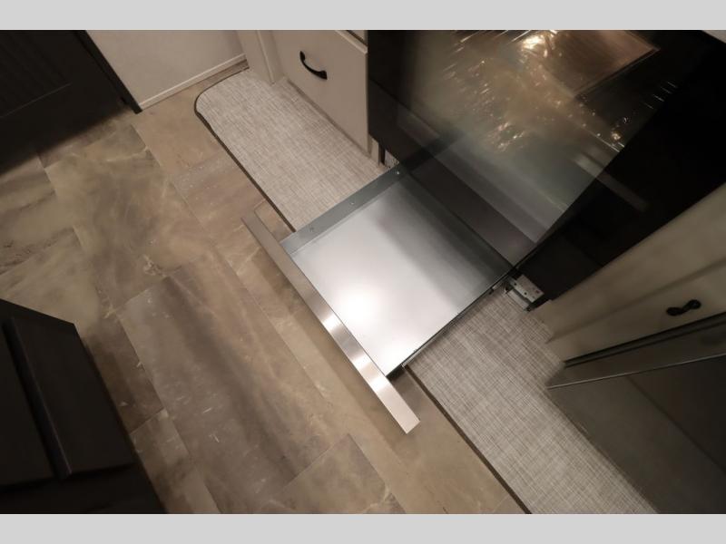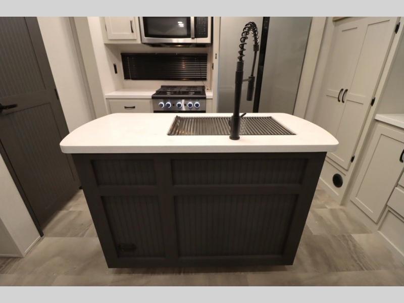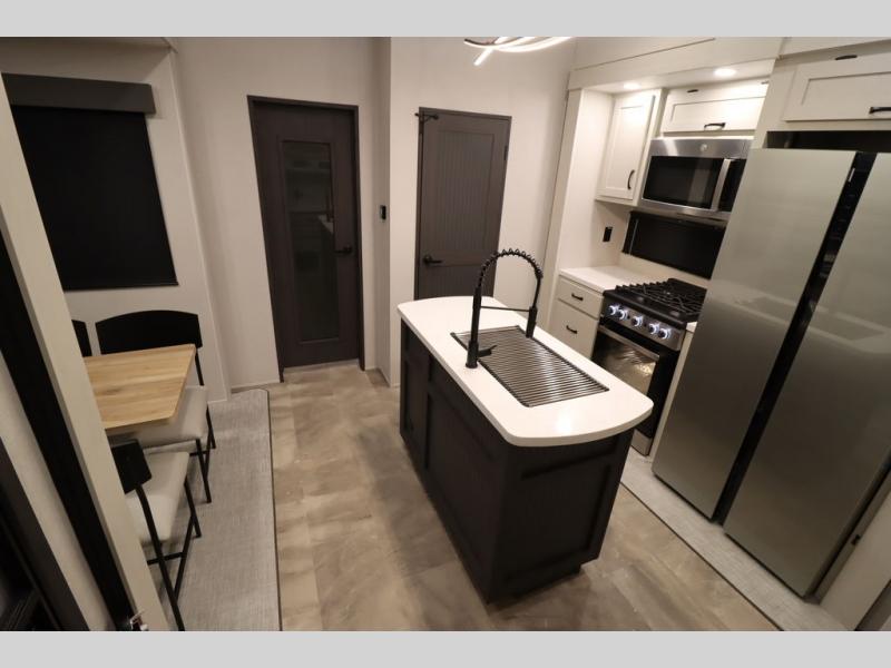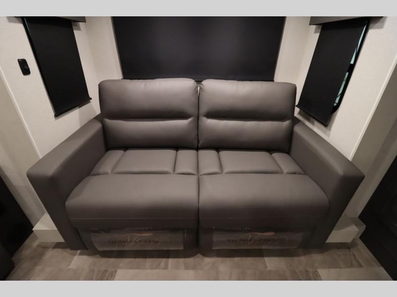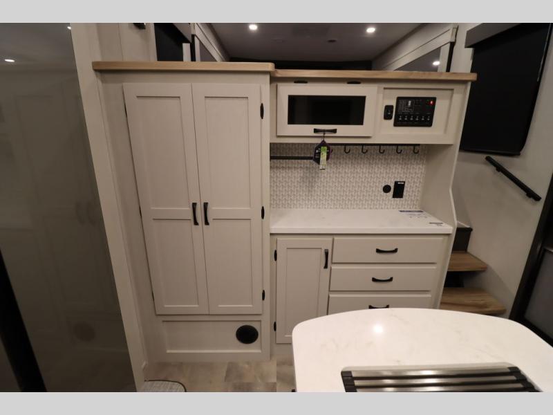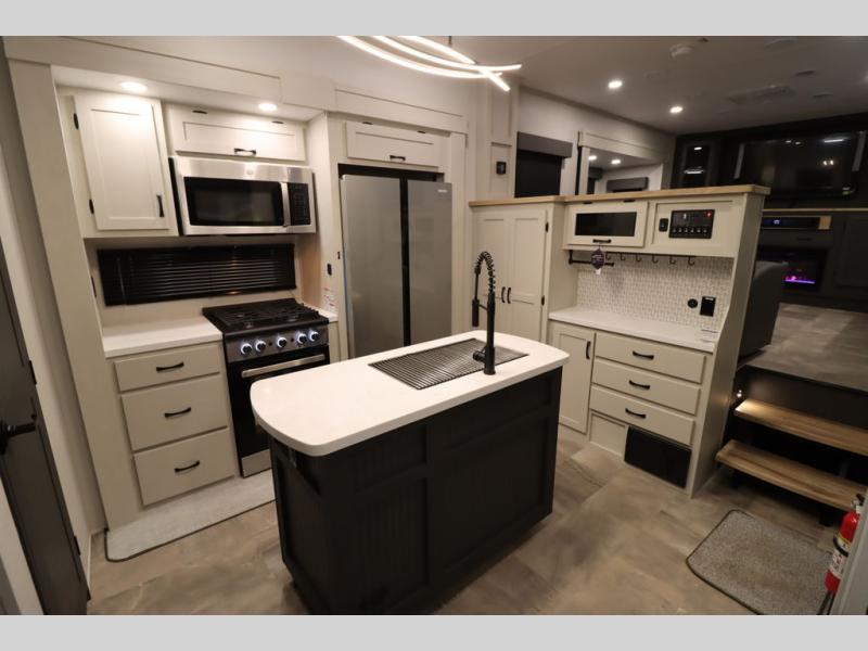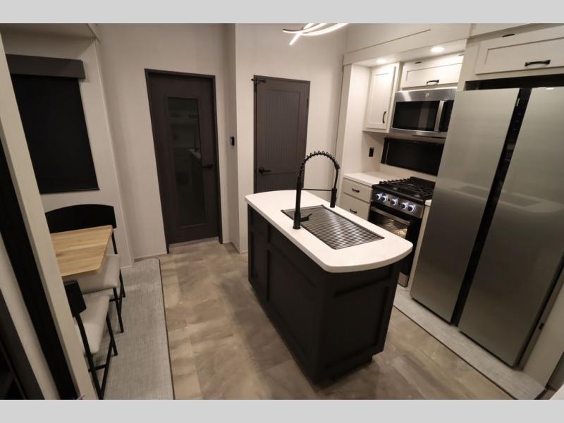 If you're looking for a luxury fifth wheel with more space and a larger sleeping capacity, you've found it! There are an impressive five slides, including dual opposing slides in the front living area and kitchen so you can really stretch out. Everyone will love to gather in the front living area on the two tri-fold sofas and theatre seating, and this room can become your guests' bedroom at night. The little ones will love to play a game at the free-standing table while the chef cooks dinner on the residential cooktop with a stainless steel oven. You'll also find a pantry here for dry goods and a 12V refrigerator for perishables. The feature that really stands out in this model is the master suite, take a look! A king bed slide and you'll have a dresser and a wardrobe for your clothes, plus access to the full bathroom. The spacious full rear bath includes a large shower with a seat, a large dual sink vanity, and a wardrobe with washer and dryer prep. And we didn't even mention the outside refrigerator that will be perfect for cold drinks under the 14' power awning!