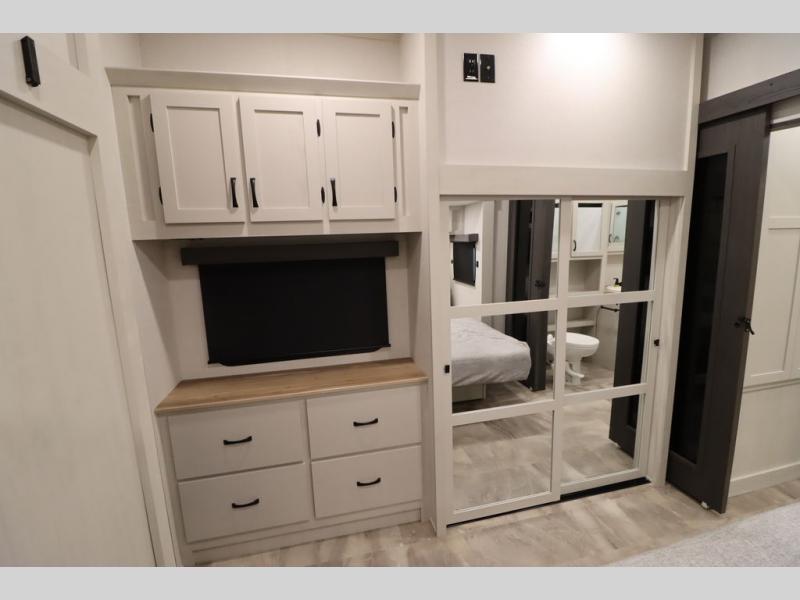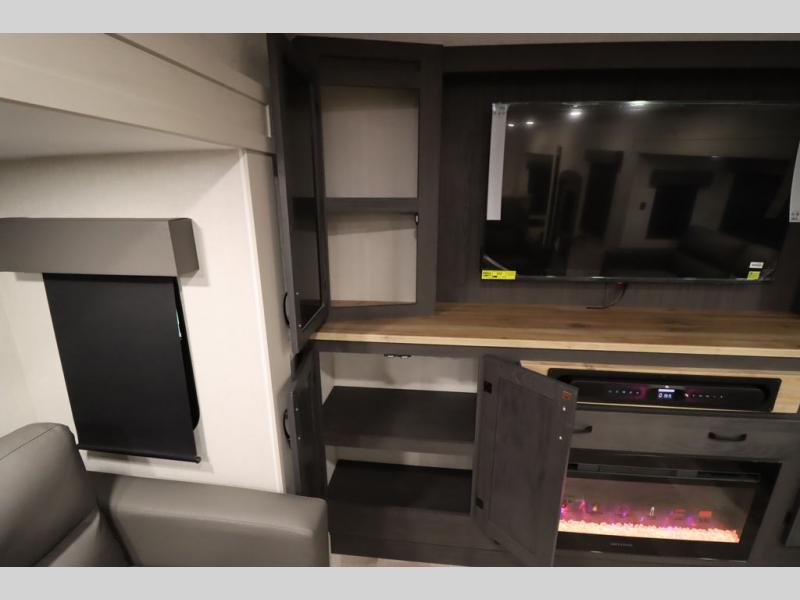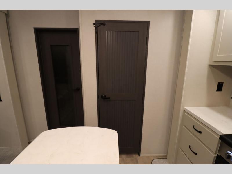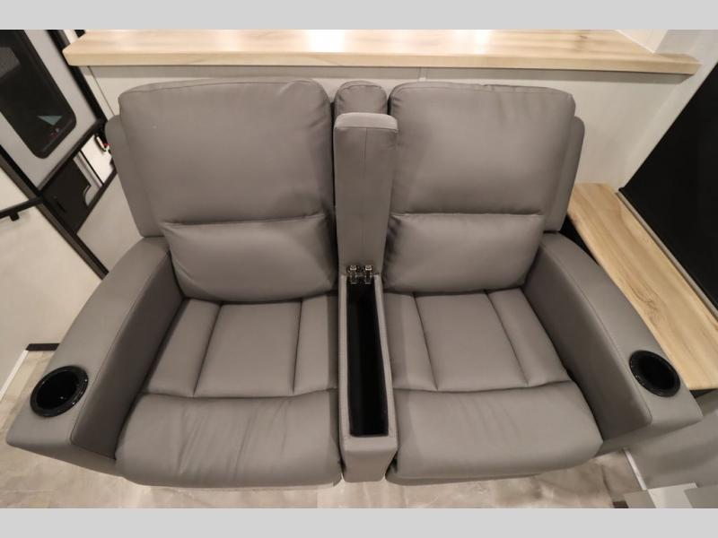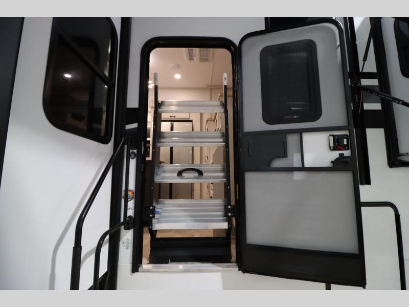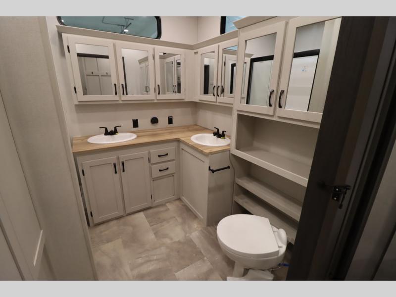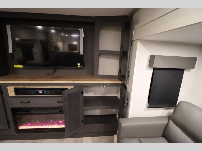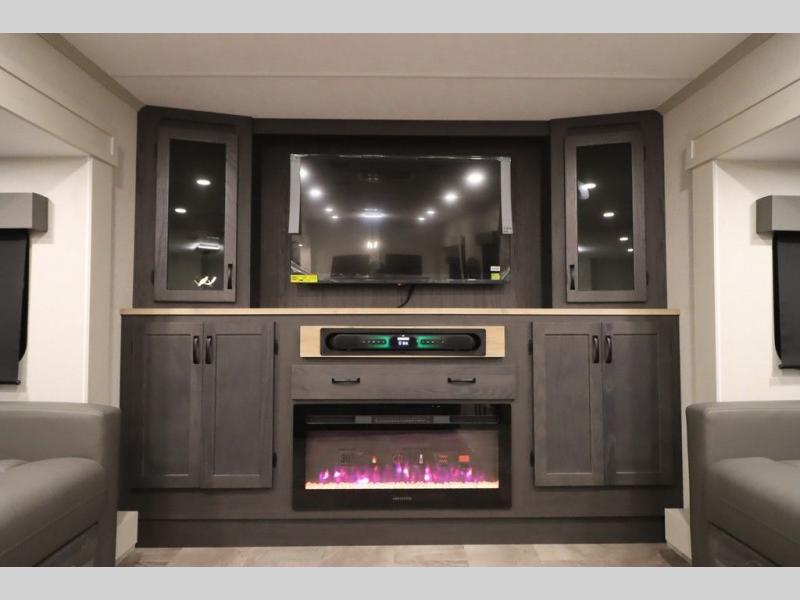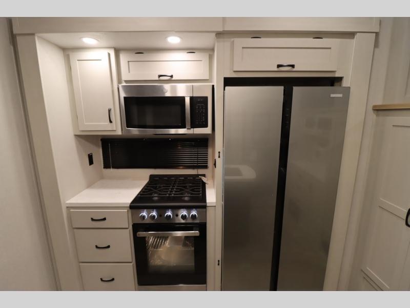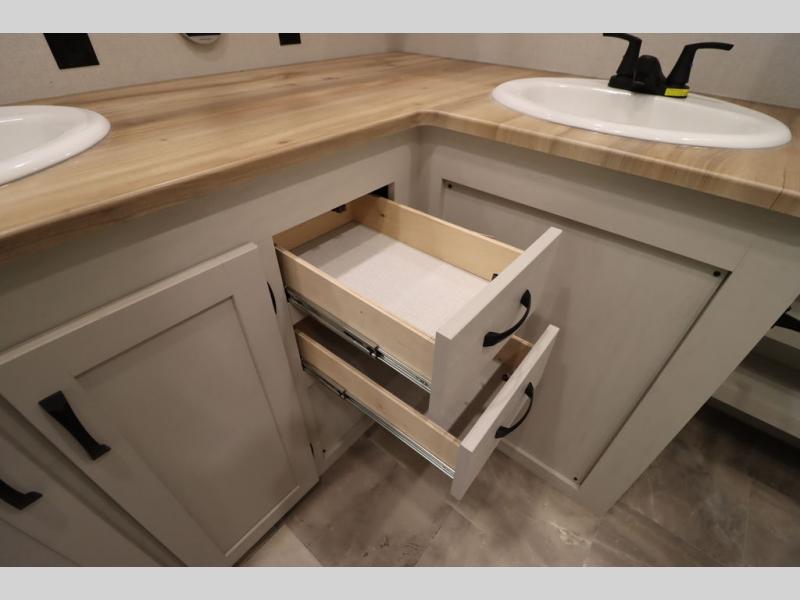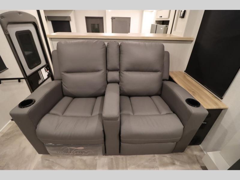 If you're looking for a luxury fifth wheel with more space and a larger sleeping capacity, you've found it! There are an impressive five slides, including dual opposing slides in the front living area and kitchen so you can really stretch out. Everyone will love to gather in the front living area on the two tri-fold sofas and theatre seating, and this room can become your guests' bedroom at night. The little ones will love to play a game at the free-standing table while the chef cooks dinner on the residential cooktop with a stainless steel oven. You'll also find a pantry here for dry goods and a 12V refrigerator for perishables. The feature that really stands out in this model is the master suite, take a look! A king bed slide and you'll have a dresser and a wardrobe for your clothes, plus access to the full bathroom. The spacious full rear bath includes a large shower with a seat, a large dual sink vanity, and a wardrobe with washer and dryer prep. And we didn't even mention the outside refrigerator that will be perfect for cold drinks under the 14' power awning!