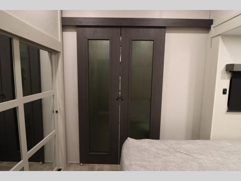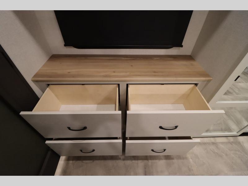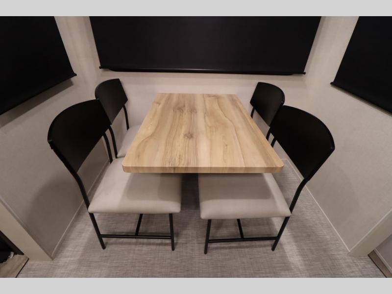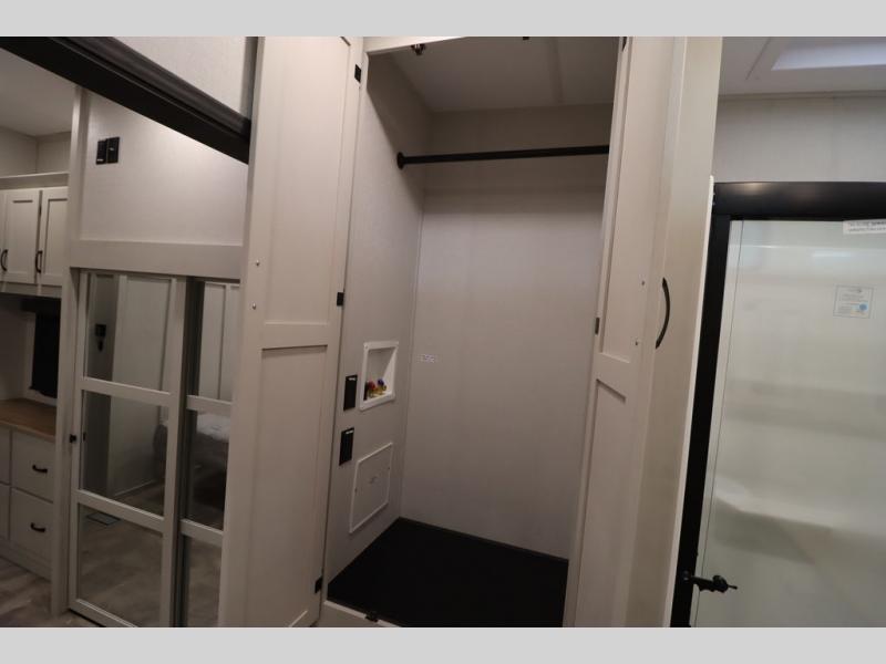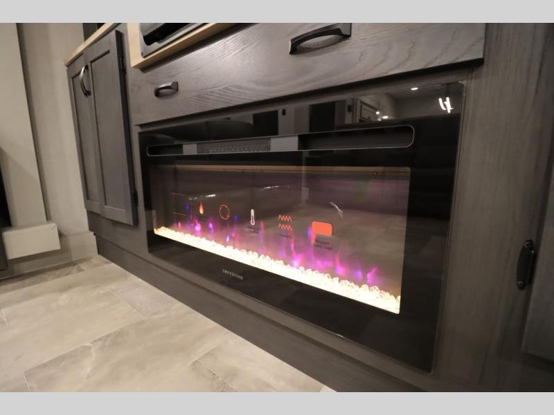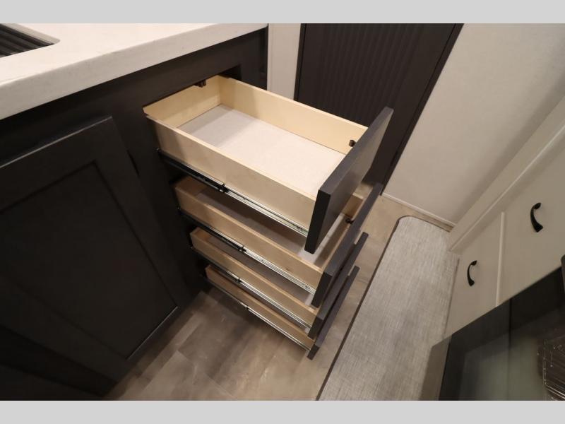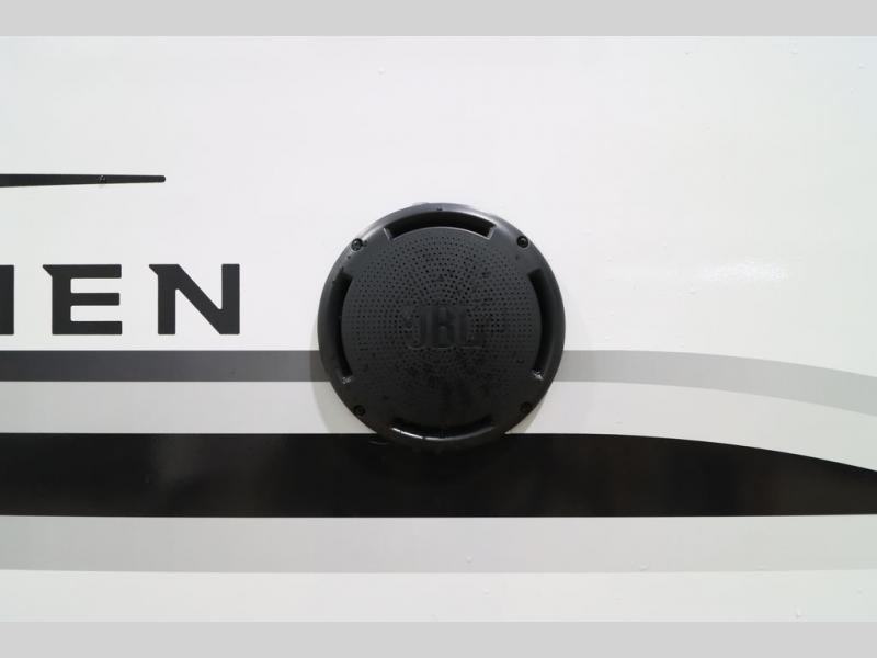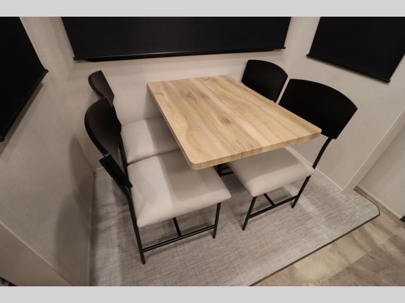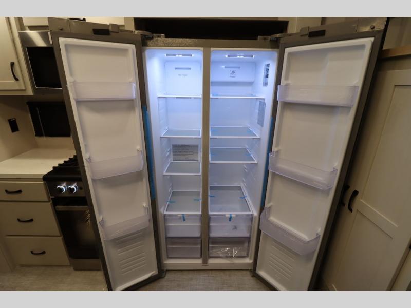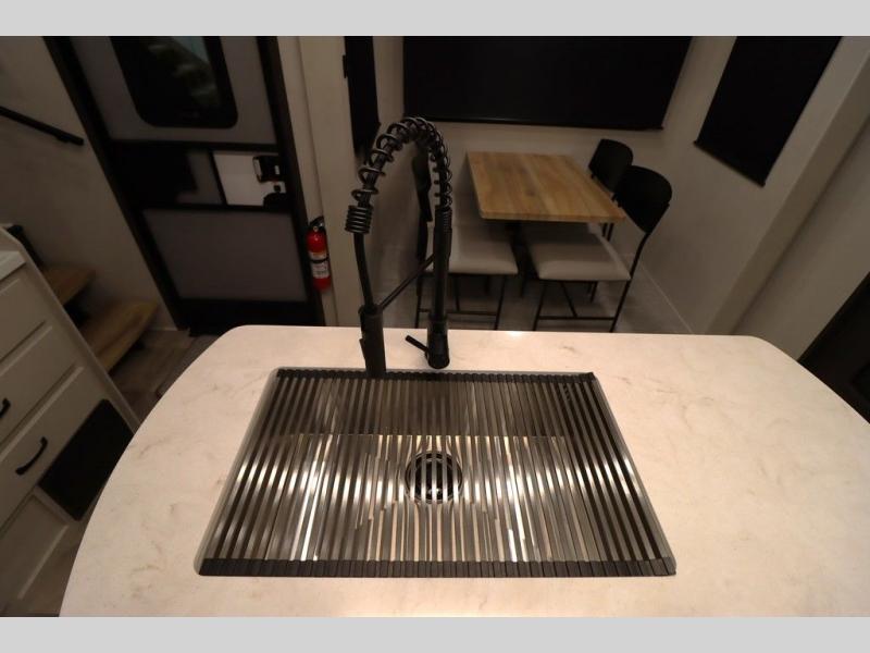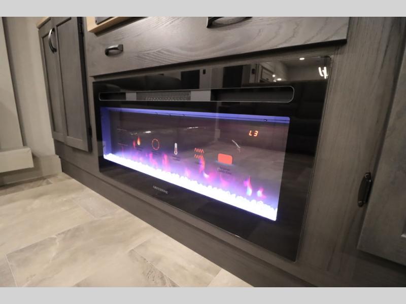 If you're looking for a luxury fifth wheel with more space and a larger sleeping capacity, you've found it! There are an impressive five slides, including dual opposing slides in the front living area and kitchen so you can really stretch out. Everyone will love to gather in the front living area on the two tri-fold sofas and theatre seating, and this room can become your guests' bedroom at night. The little ones will love to play a game at the free-standing table while the chef cooks dinner on the residential cooktop with a stainless steel oven. You'll also find a pantry here for dry goods and a 12V refrigerator for perishables. The feature that really stands out in this model is the master suite, take a look! A king bed slide and you'll have a dresser and a wardrobe for your clothes, plus access to the full bathroom. The spacious full rear bath includes a large shower with a seat, a large dual sink vanity, and a wardrobe with washer and dryer prep. And we didn't even mention the outside refrigerator that will be perfect for cold drinks under the 14' power awning!