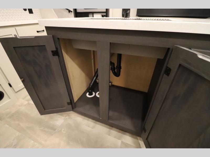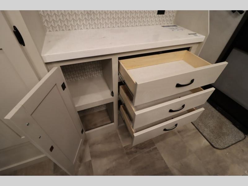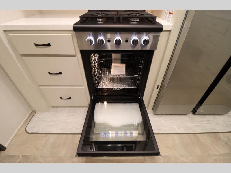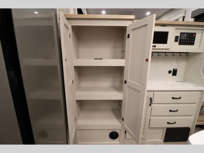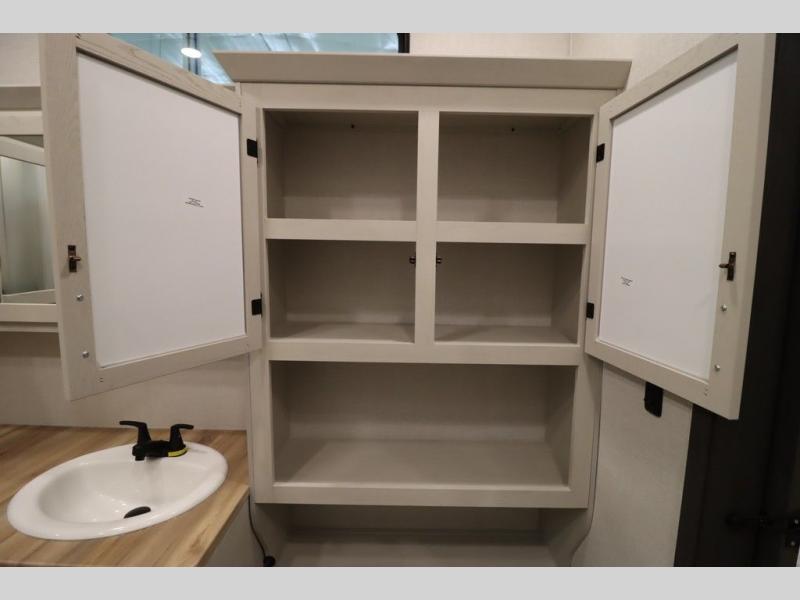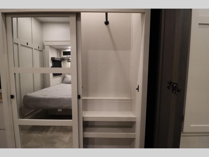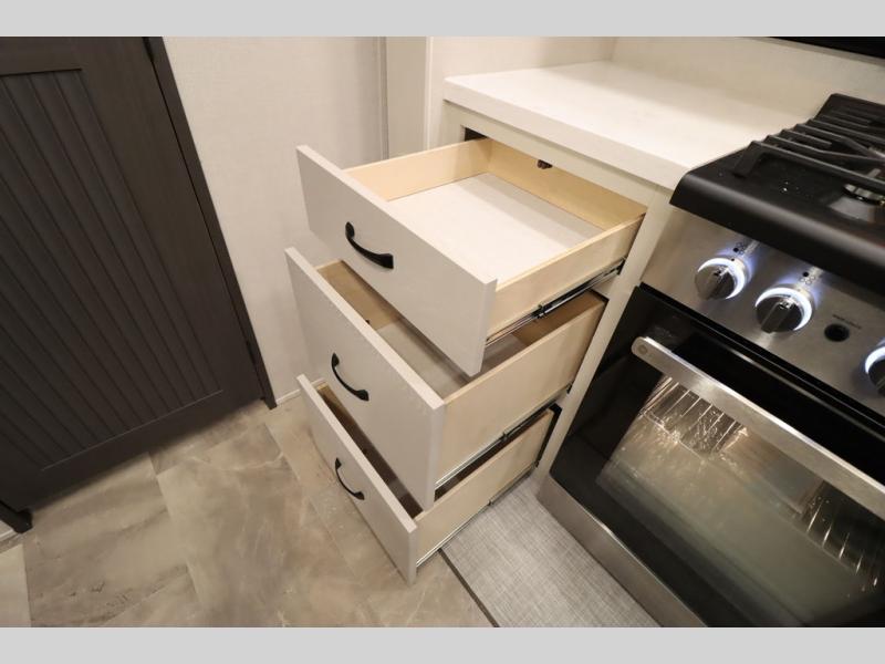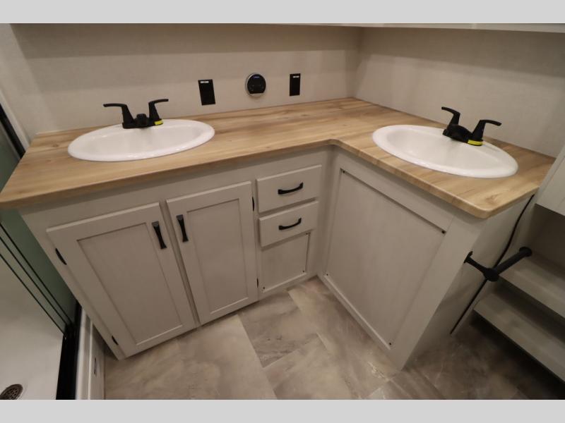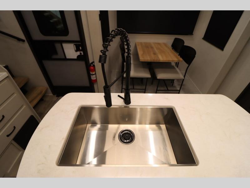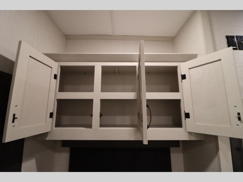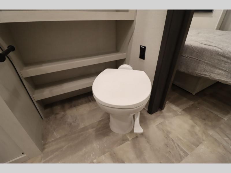 If you're looking for a luxury fifth wheel with more space and a larger sleeping capacity, you've found it! There are an impressive five slides, including dual opposing slides in the front living area and kitchen so you can really stretch out. Everyone will love to gather in the front living area on the two tri-fold sofas and theatre seating, and this room can become your guests' bedroom at night. The little ones will love to play a game at the free-standing table while the chef cooks dinner on the residential cooktop with a stainless steel oven. You'll also find a pantry here for dry goods and a 12V refrigerator for perishables. The feature that really stands out in this model is the master suite, take a look! A king bed slide and you'll have a dresser and a wardrobe for your clothes, plus access to the full bathroom. The spacious full rear bath includes a large shower with a seat, a large dual sink vanity, and a wardrobe with washer and dryer prep. And we didn't even mention the outside refrigerator that will be perfect for cold drinks under the 14' power awning!