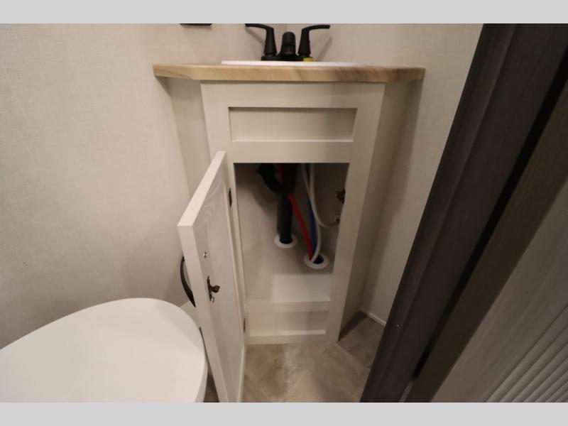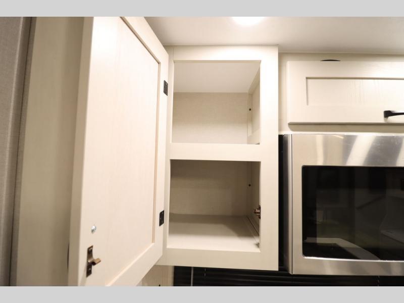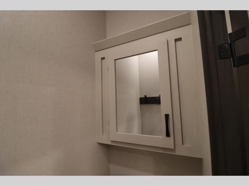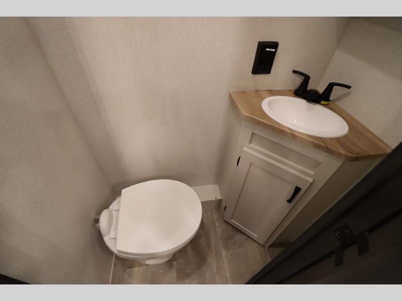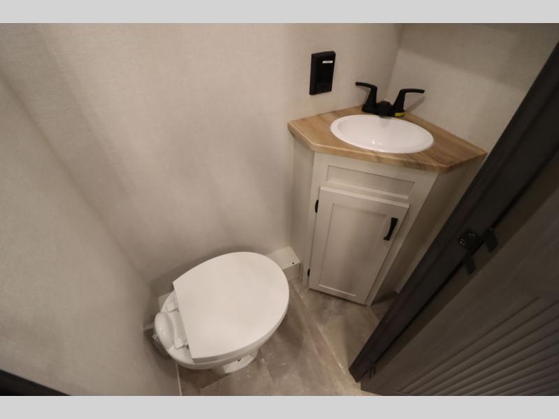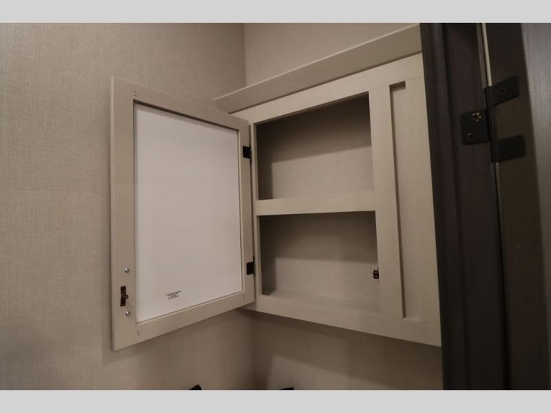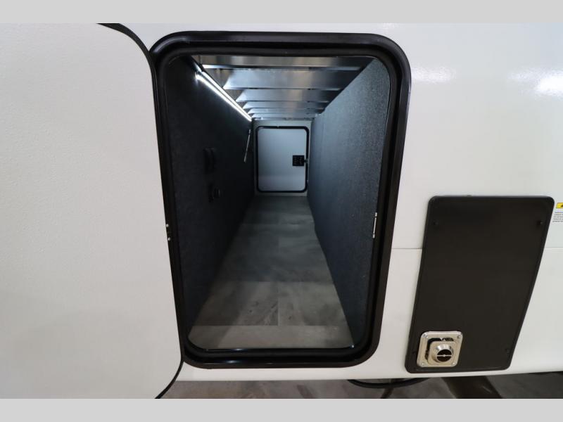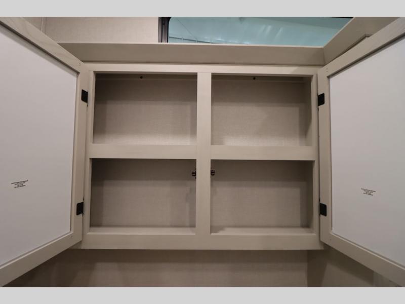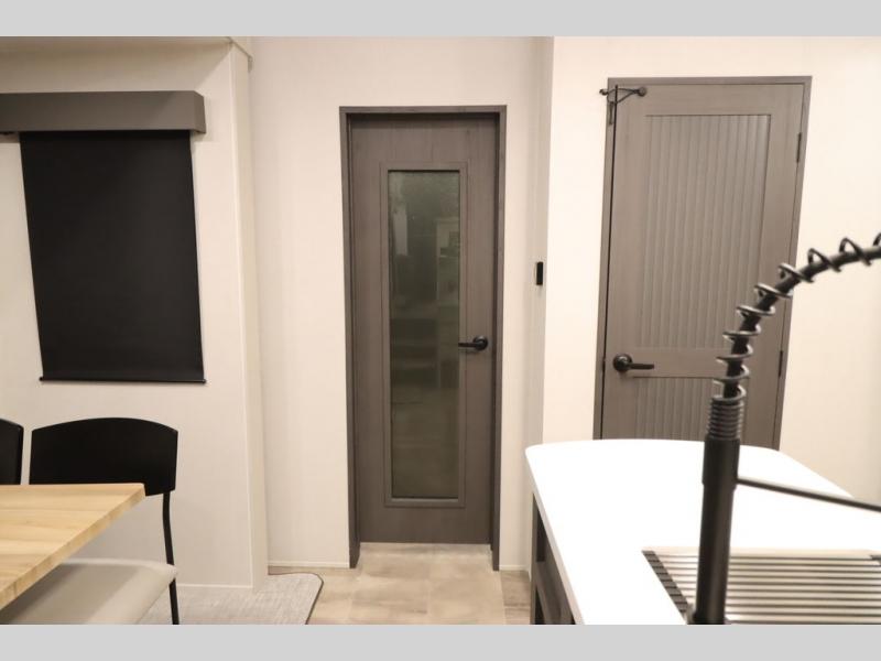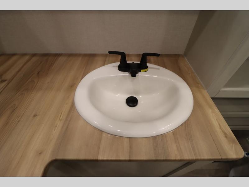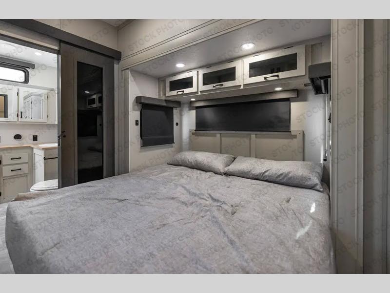 If you're looking for a luxury fifth wheel with more space and a larger sleeping capacity, you've found it! There are an impressive five slides, including dual opposing slides in the front living area and kitchen so you can really stretch out. Everyone will love to gather in the front living area on the two tri-fold sofas and theatre seating, and this room can become your guests' bedroom at night. The little ones will love to play a game at the free-standing table while the chef cooks dinner on the residential cooktop with a stainless steel oven. You'll also find a pantry here for dry goods and a 12V refrigerator for perishables. The feature that really stands out in this model is the master suite, take a look! A king bed slide and you'll have a dresser and a wardrobe for your clothes, plus access to the full bathroom. The spacious full rear bath includes a large shower with a seat, a large dual sink vanity, and a wardrobe with washer and dryer prep. And we didn't even mention the outside refrigerator that will be perfect for cold drinks under the 14' power awning!
