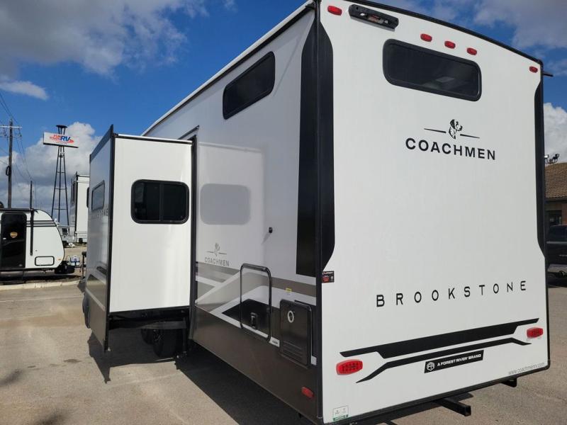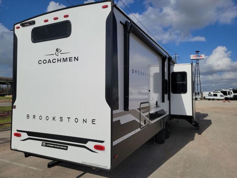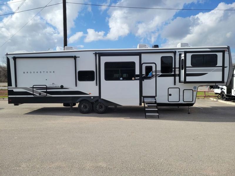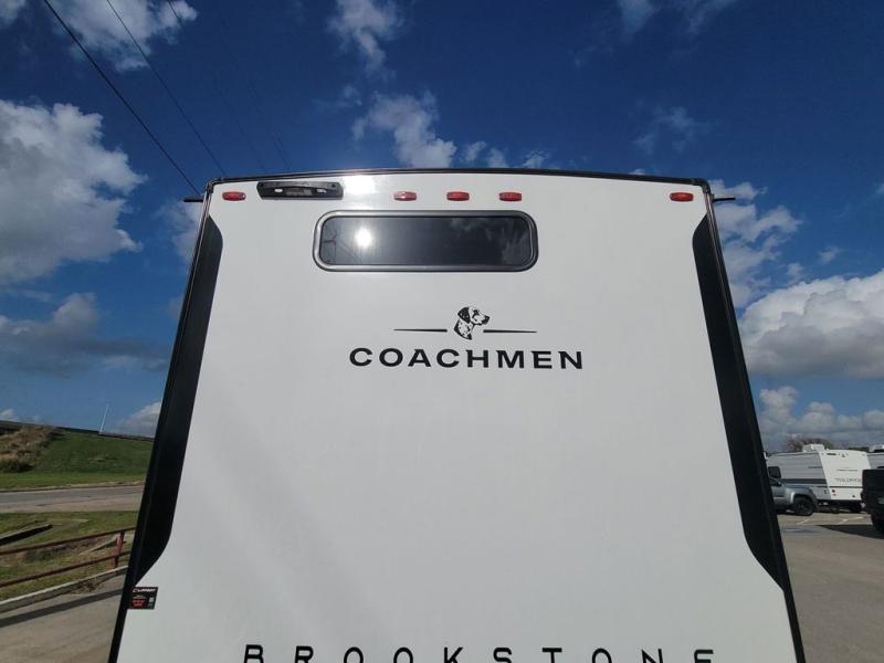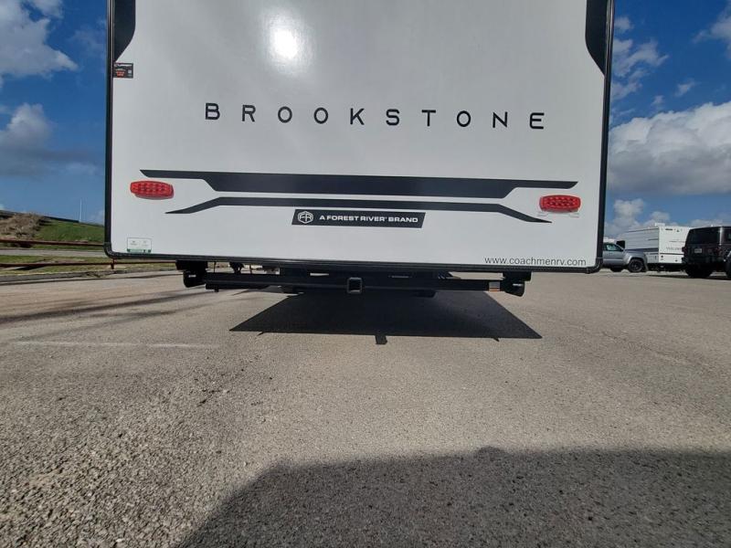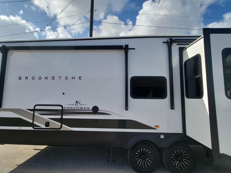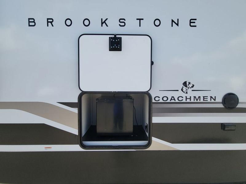he Brookstone fifth wheels by Coachmen are coming to you with wide-body comfort, home-like amenities, and unique designs for a truly luxurious RV. The Weather Shield+ consists of a 6X double Azdel aluminum cage sidewall system, a Radiant Pro weather barrier system and more, all built to keep you in your fifth wheel comfortable and capable in varying weather. Head inside to find solid surface countertops in the kitchen, an 4K Smart LED TV in the living room, slow rise blackout roller night shades, and the list of comforts goes on! The Brookstone also includes 6-point electric auto-leveling, four step MORryde StepAbove main entry, an electric awning with LED lights, and many more exterior conveniences!
