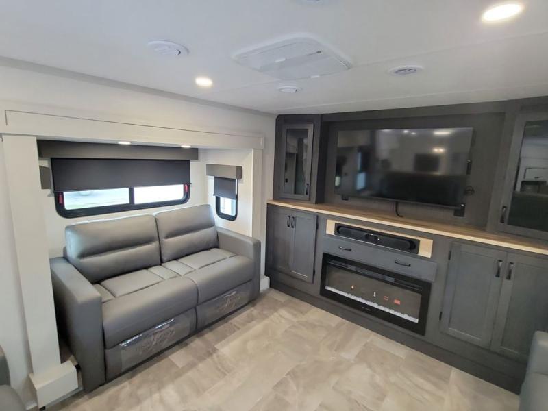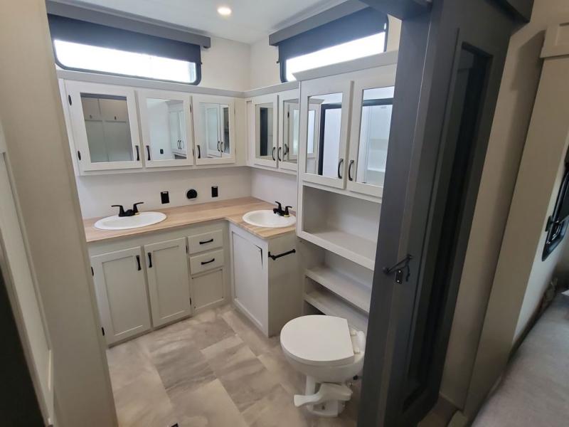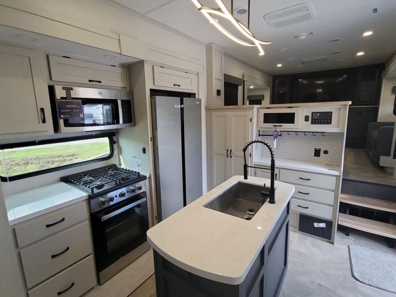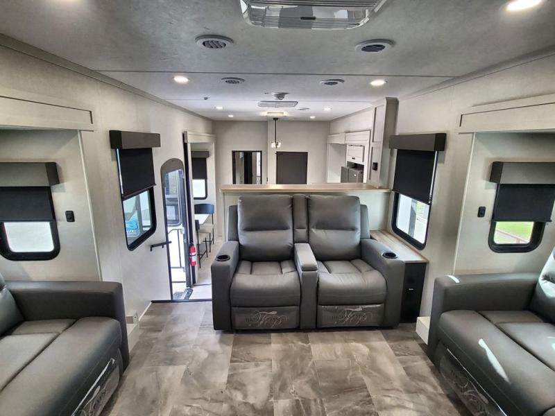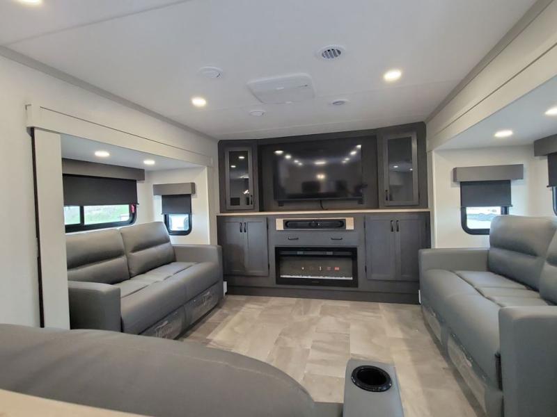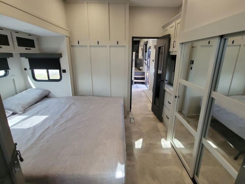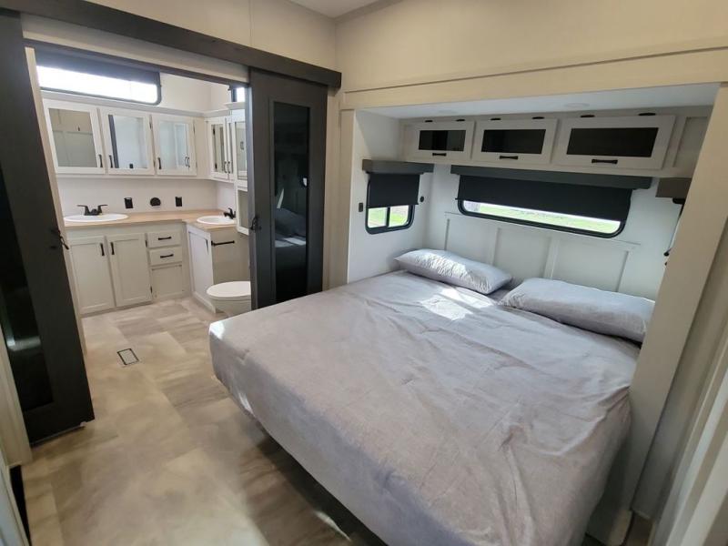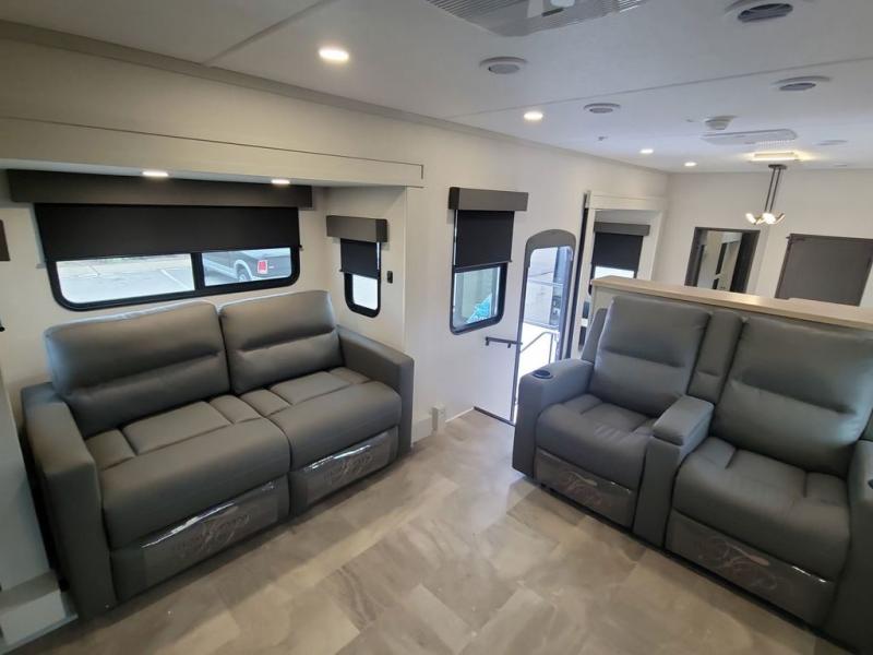 If you're looking for a luxury fifth wheel with more space and a larger sleeping capacity, you've found it! There are an impressive five slides, including dual opposing slides in the front living area and kitchen so you can really stretch out. Everyone will love to gather in the front living area on the two tri-fold sofas and theatre seating, and this room can become your guests' bedroom at night. The little ones will love to play a game at the free-standing table while the chef cooks dinner on the residential cooktop with a stainless steel oven. You'll also find a pantry here for dry goods and a 12V refrigerator for perishables. The feature that really stands out in this model is the master suite, take a look! A king bed slide and you'll have a dresser and a wardrobe for your clothes, plus access to the full bathroom. The spacious full rear bath includes a large shower with a seat, a large dual sink vanity, and a wardrobe with washer and dryer prep. And we didn't even mention the outside refrigerator that will be perfect for cold drinks under the 14' power awning!