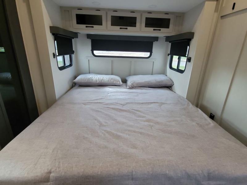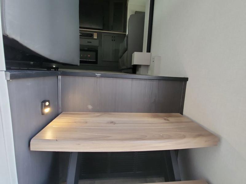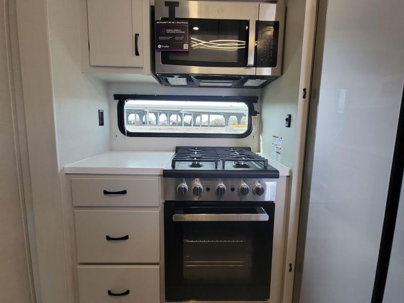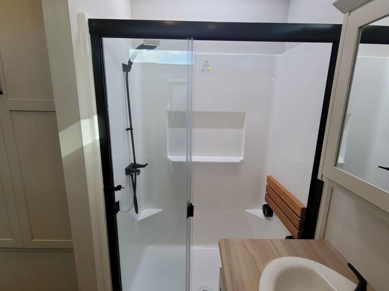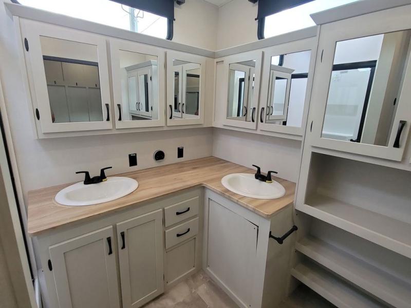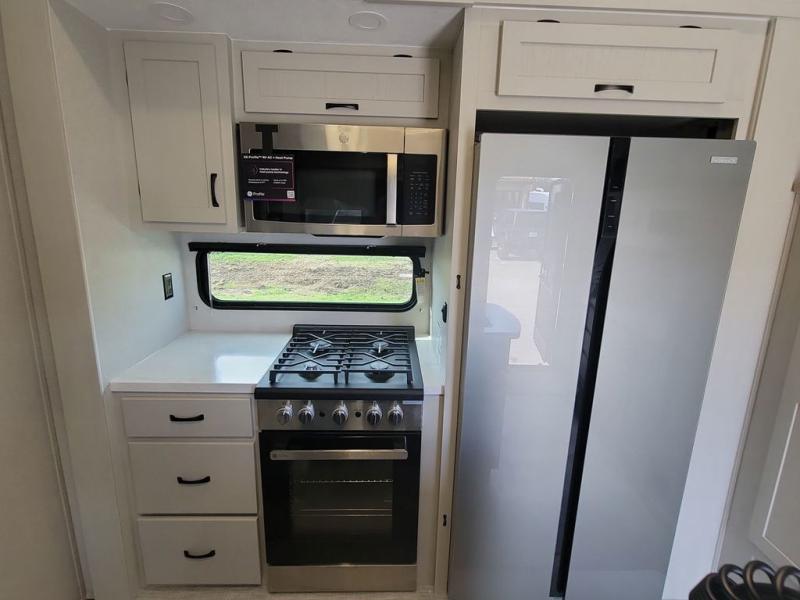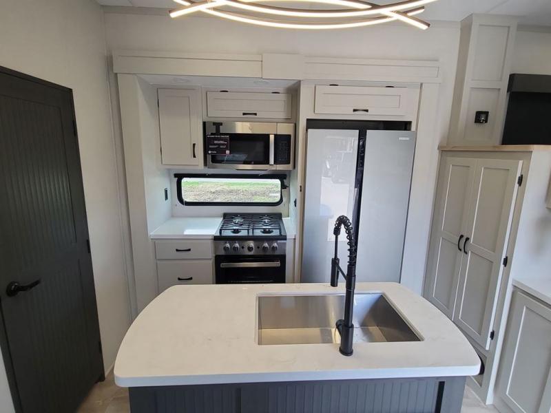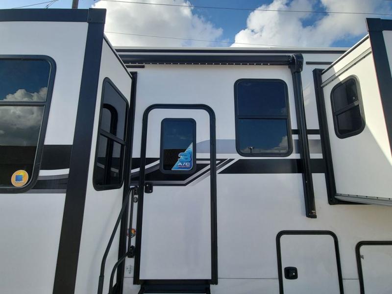 If you're looking for a luxury fifth wheel with more space and a larger sleeping capacity, you've found it! There are an impressive five slides, including dual opposing slides in the front living area and kitchen so you can really stretch out. Everyone will love to gather in the front living area on the two tri-fold sofas and theatre seating, and this room can become your guests' bedroom at night. The little ones will love to play a game at the free-standing table while the chef cooks dinner on the residential cooktop with a stainless steel oven. You'll also find a pantry here for dry goods and a 12V refrigerator for perishables. The feature that really stands out in this model is the master suite, take a look! A king bed slide and you'll have a dresser and a wardrobe for your clothes, plus access to the full bathroom. The spacious full rear bath includes a large shower with a seat, a large dual sink vanity, and a wardrobe with washer and dryer prep. And we didn't even mention the outside refrigerator that will be perfect for cold drinks under the 14' power awning!