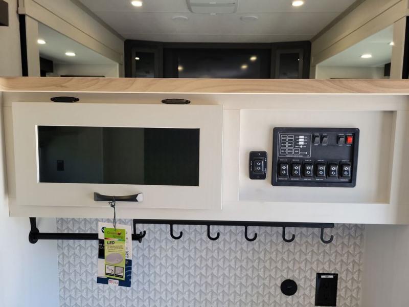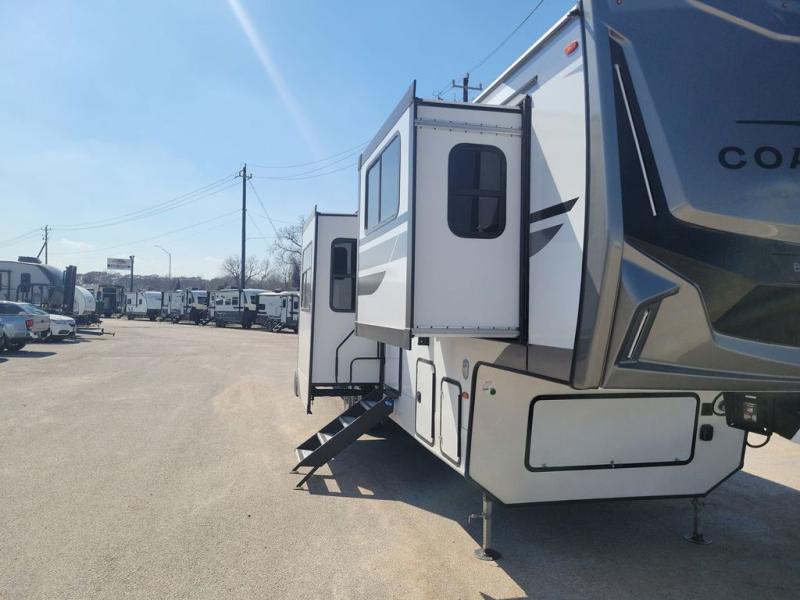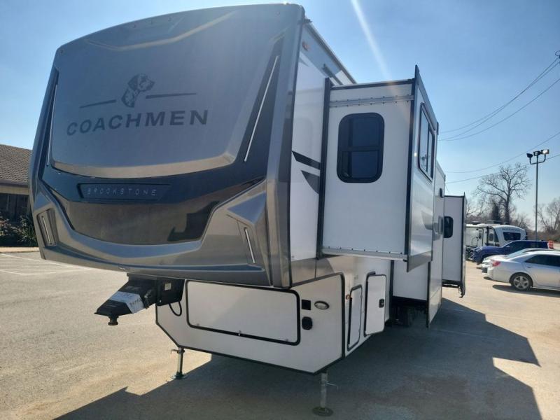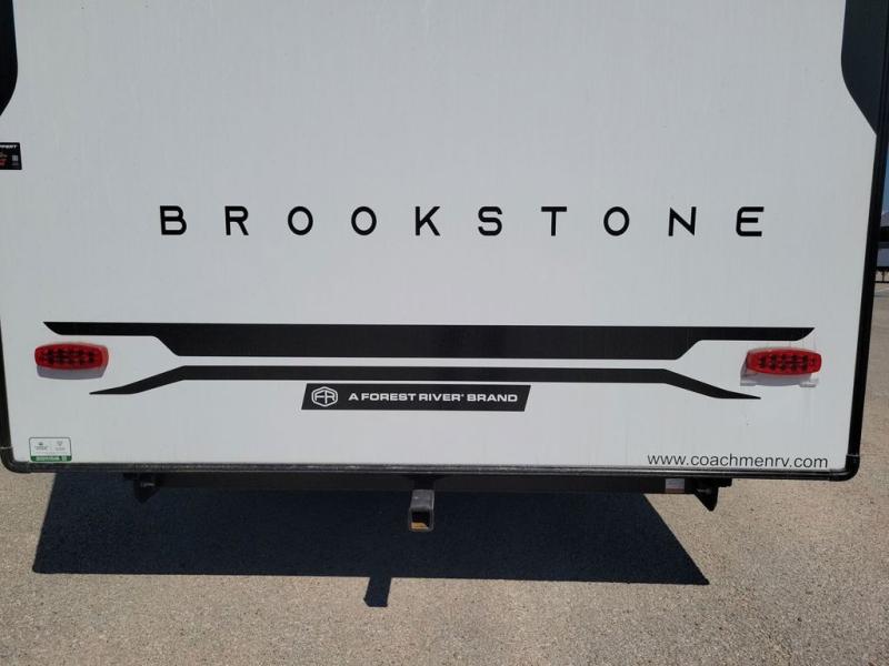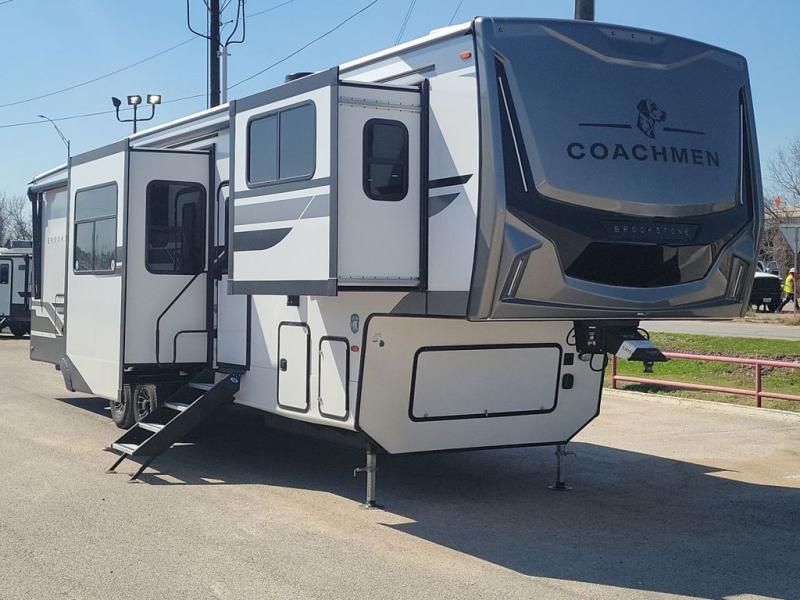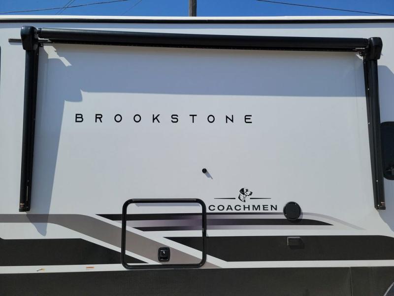 he Brookstone fifth wheels by Coachmen are coming to you with wide-body comfort, home-like amenities, and unique designs for a truly luxurious RV. The Weather Shield+ consists of a 6X double Azdel aluminum cage sidewall system, a Radiant Pro weather barrier system and more, all built to keep you in your fifth wheel comfortable and capable in varying weather. Head inside to find solid surface countertops in the kitchen, an 4K Smart LED TV in the living room, slow rise blackout roller night shades, and the list of comforts goes on! The Brookstone also includes 6-point electric auto-leveling, four step MORryde StepAbove main entry, an electric awning with LED lights, and many more exterior conveniences!