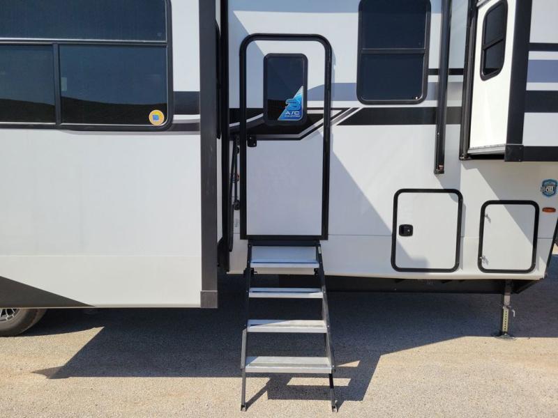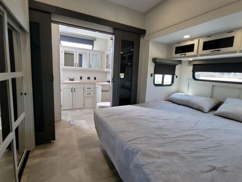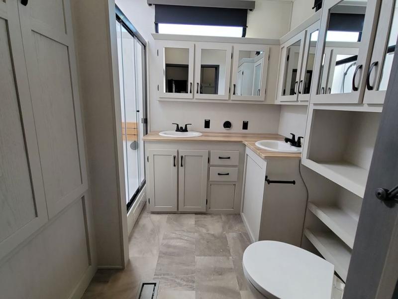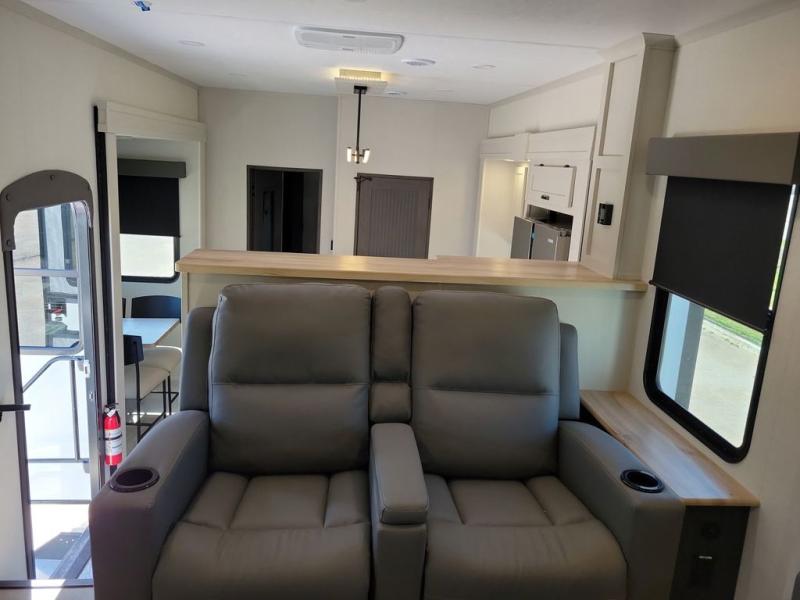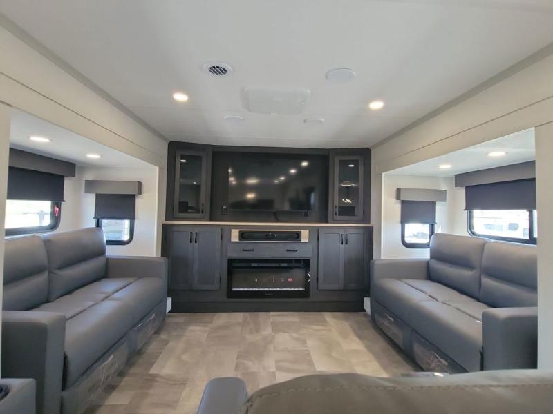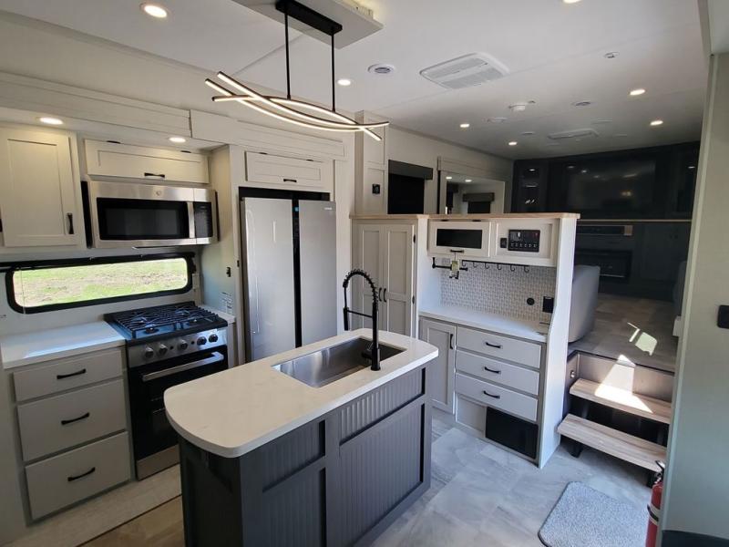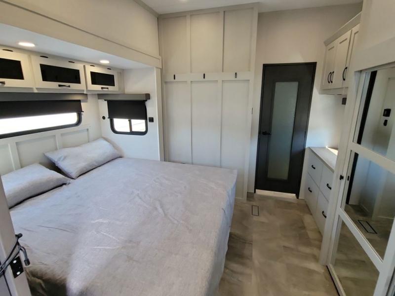 If you're looking for a luxury fifth wheel with more space and a larger sleeping capacity, you've found it! There are an impressive five slides, including dual opposing slides in the front living area and kitchen so you can really stretch out. Everyone will love to gather in the front living area on the two tri-fold sofas and theatre seating, and this room can become your guests' bedroom at night. The little ones will love to play a game at the free-standing table while the chef cooks dinner on the residential cooktop with a stainless steel oven. You'll also find a pantry here for dry goods and a 12V refrigerator for perishables. The feature that really stands out in this model is the master suite, take a look! A king bed slide and you'll have a dresser and a wardrobe for your clothes, plus access to the full bathroom. The spacious full rear bath includes a large shower with a seat, a large dual sink vanity, and a wardrobe with washer and dryer prep. And we didn't even mention the outside refrigerator that will be perfect for cold drinks under the 14' power awning!