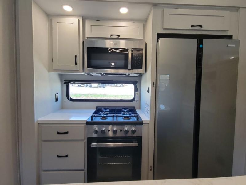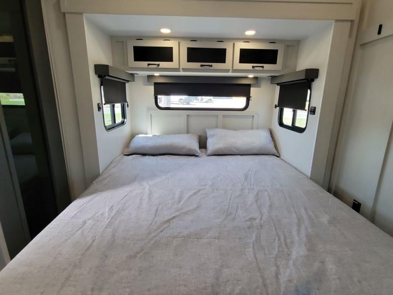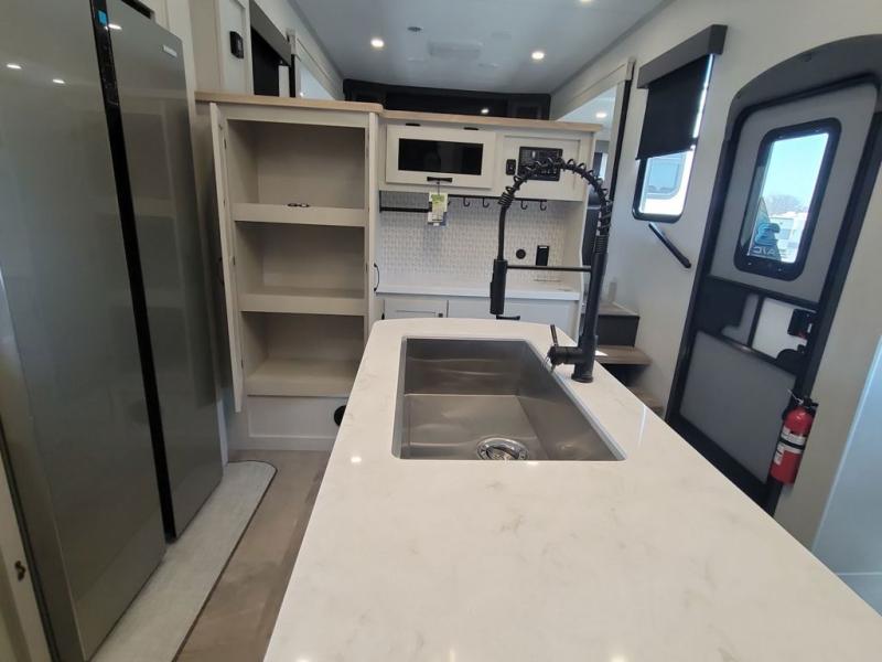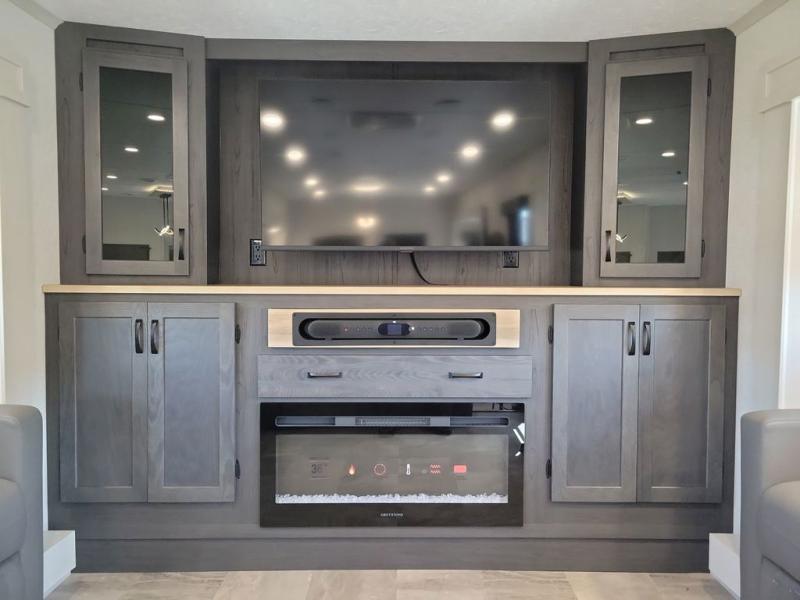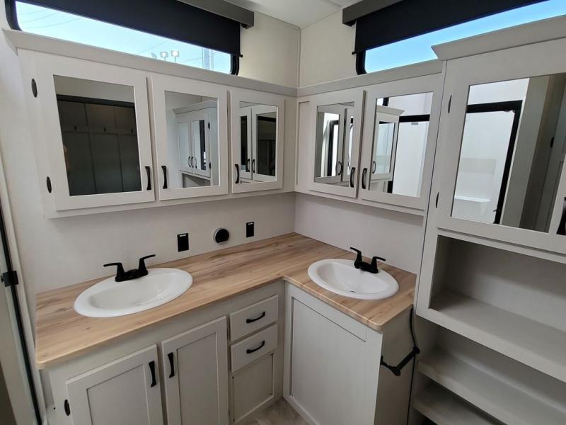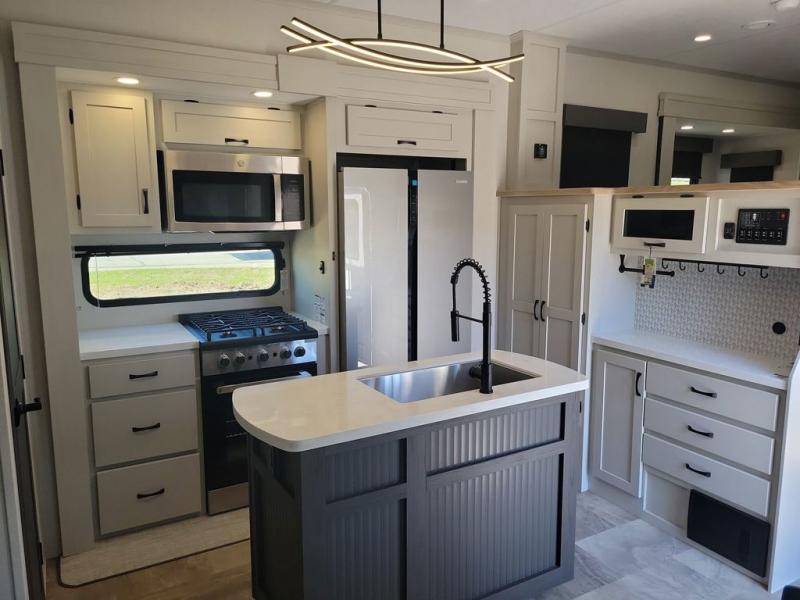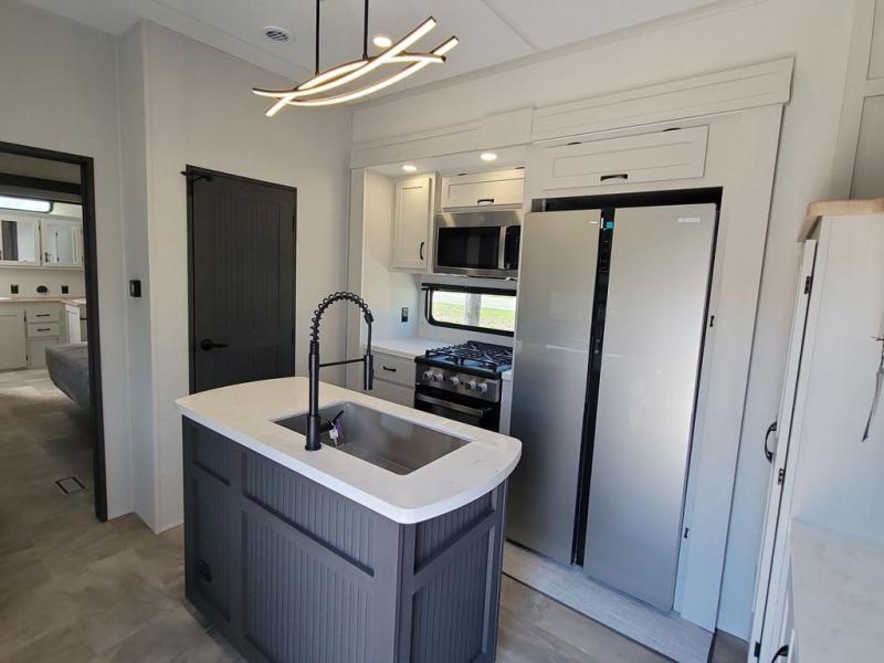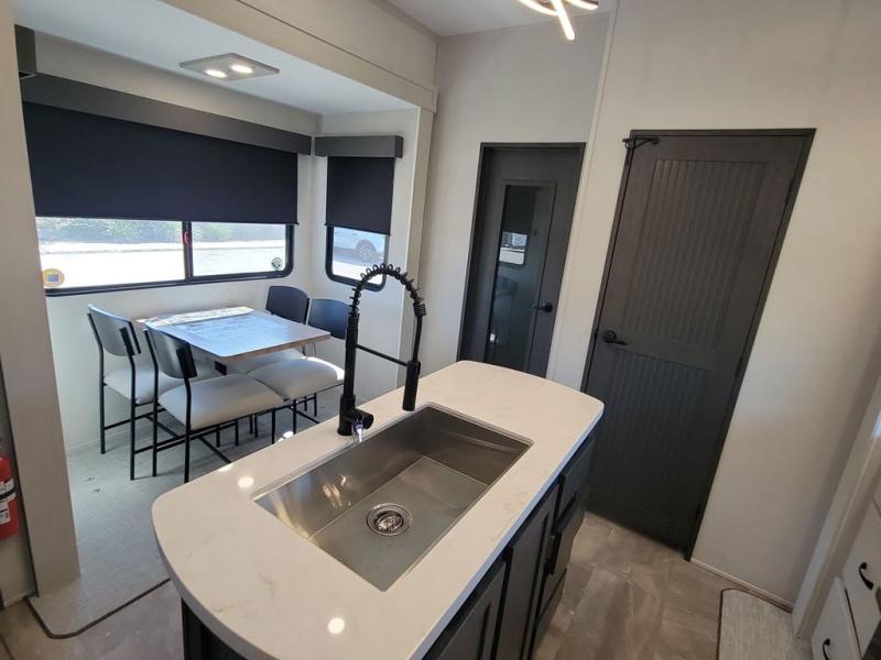 If you're looking for a luxury fifth wheel with more space and a larger sleeping capacity, you've found it! There are an impressive five slides, including dual opposing slides in the front living area and kitchen so you can really stretch out. Everyone will love to gather in the front living area on the two tri-fold sofas and theatre seating, and this room can become your guests' bedroom at night. The little ones will love to play a game at the free-standing table while the chef cooks dinner on the residential cooktop with a stainless steel oven. You'll also find a pantry here for dry goods and a 12V refrigerator for perishables. The feature that really stands out in this model is the master suite, take a look! A king bed slide and you'll have a dresser and a wardrobe for your clothes, plus access to the full bathroom. The spacious full rear bath includes a large shower with a seat, a large dual sink vanity, and a wardrobe with washer and dryer prep. And we didn't even mention the outside refrigerator that will be perfect for cold drinks under the 14' power awning!