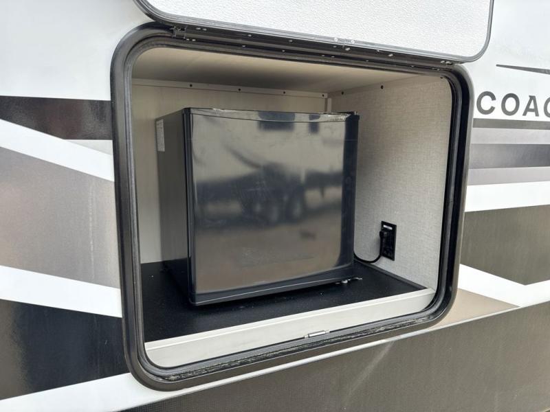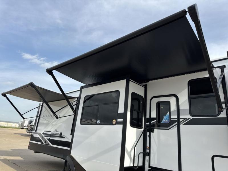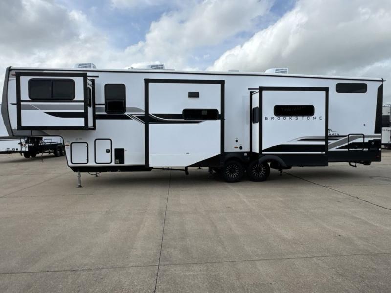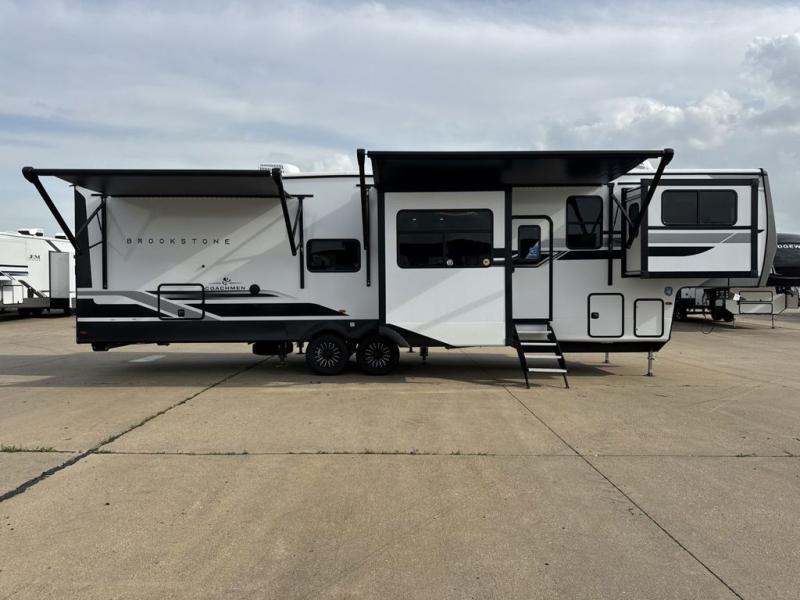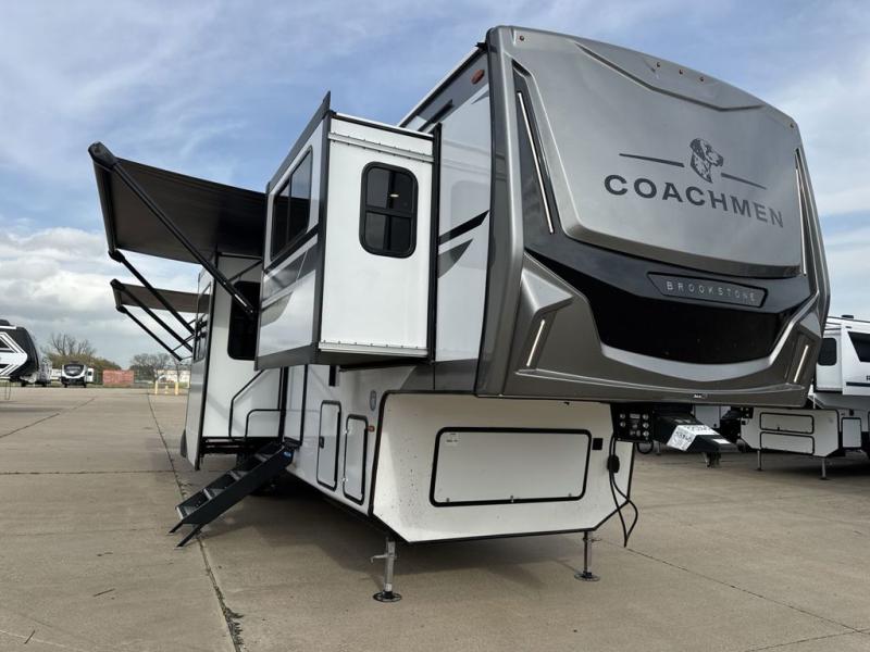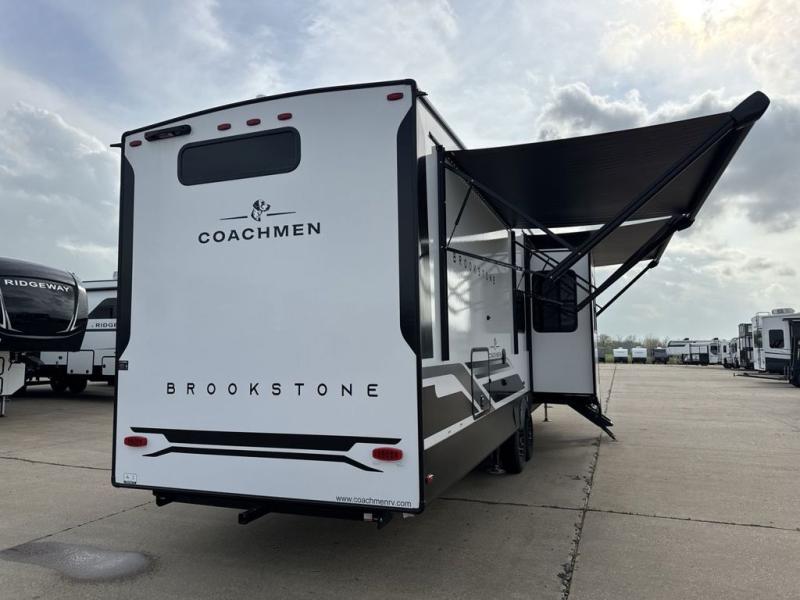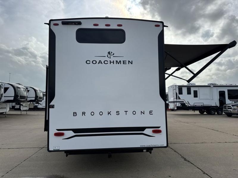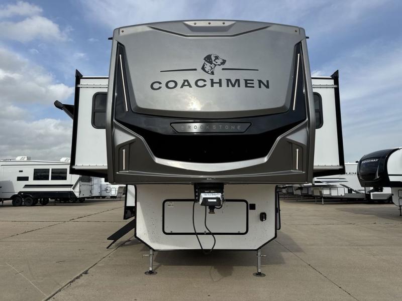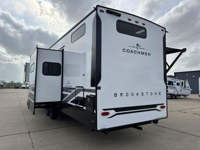 he Brookstone fifth wheels by Coachmen are coming to you with wide-body comfort, home-like amenities, and unique designs for a truly luxurious RV. The Weather Shield+ consists of a 6X double Azdel aluminum cage sidewall system, a Radiant Pro weather barrier system and more, all built to keep you in your fifth wheel comfortable and capable in varying weather. Head inside to find solid surface countertops in the kitchen, an 4K Smart LED TV in the living room, slow rise blackout roller night shades, and the list of comforts goes on! The Brookstone also includes 6-point electric auto-leveling, four step MORryde StepAbove main entry, an electric awning with LED lights, and many more exterior conveniences!