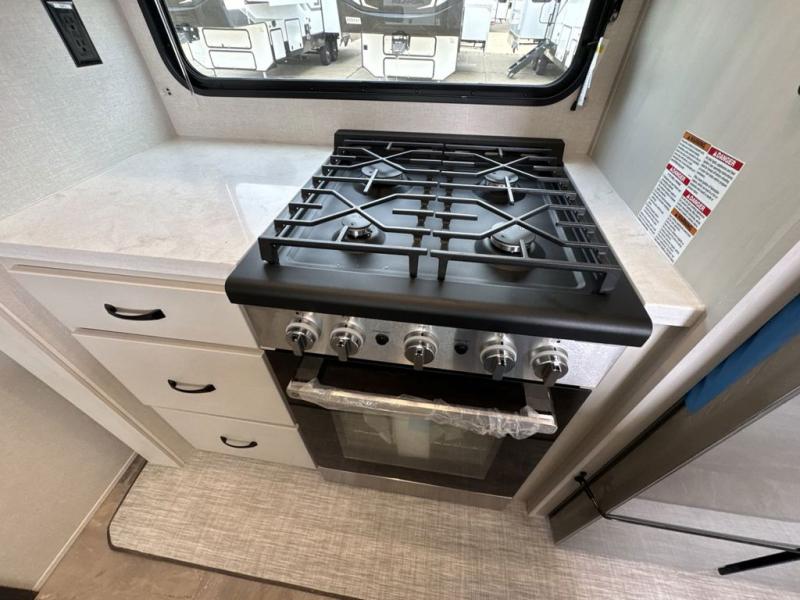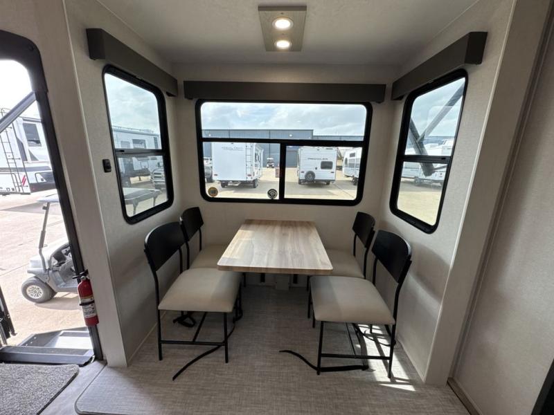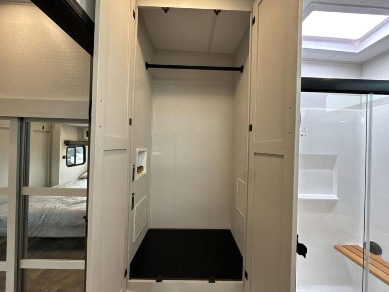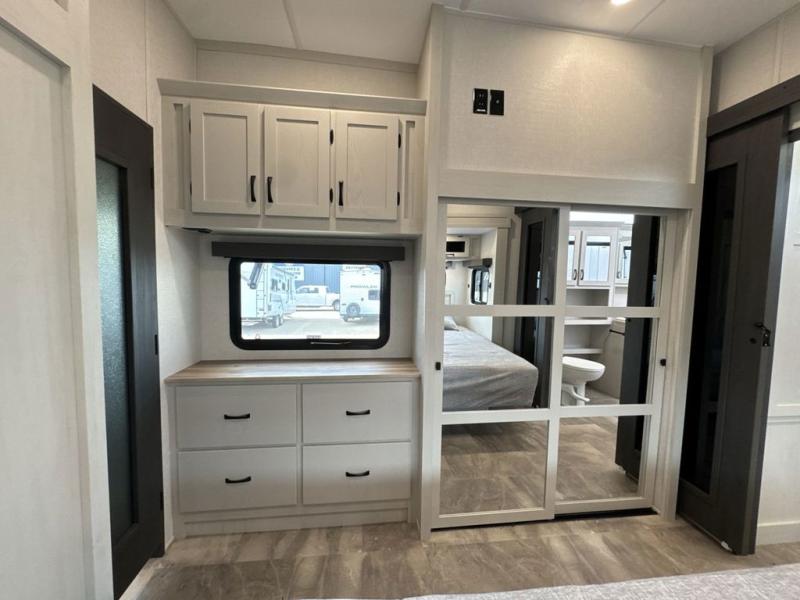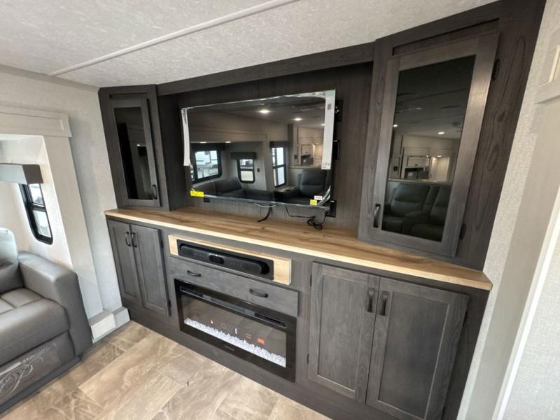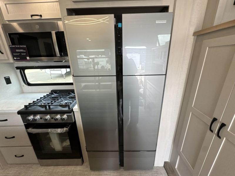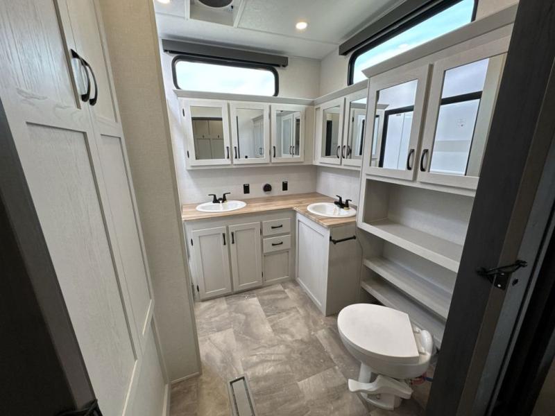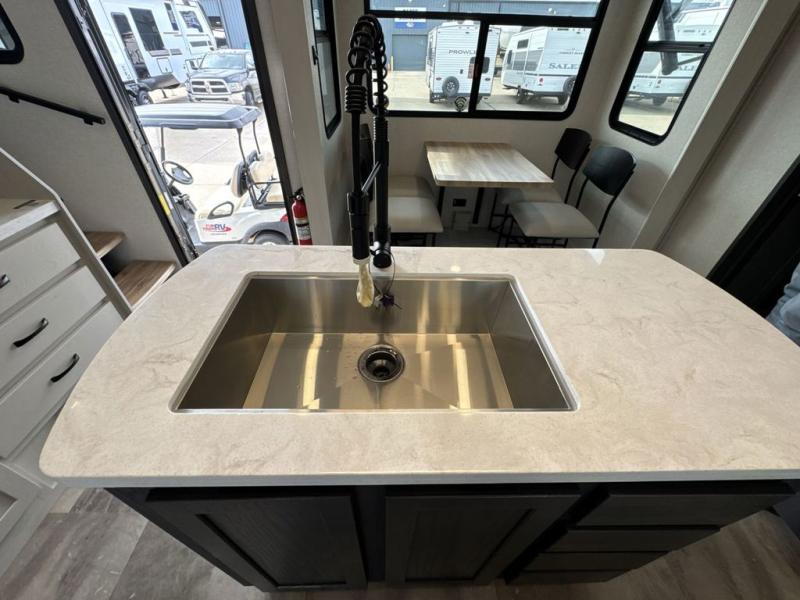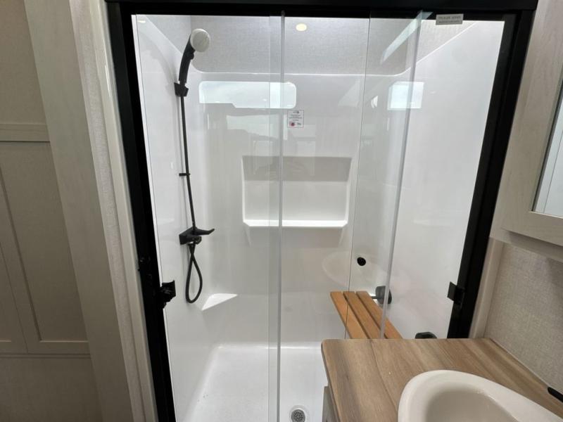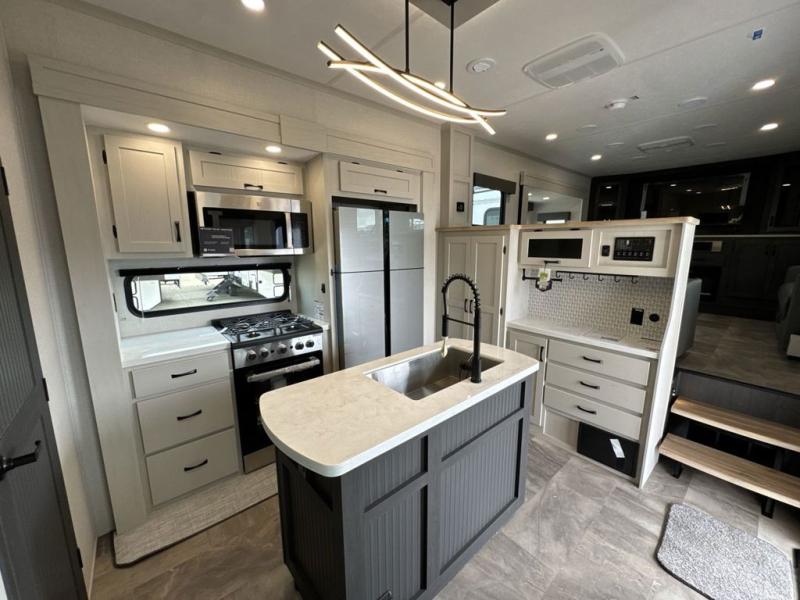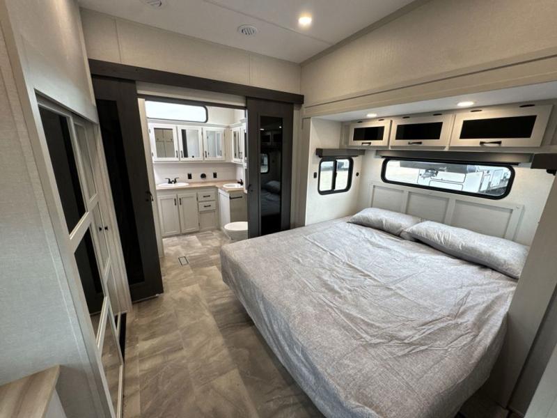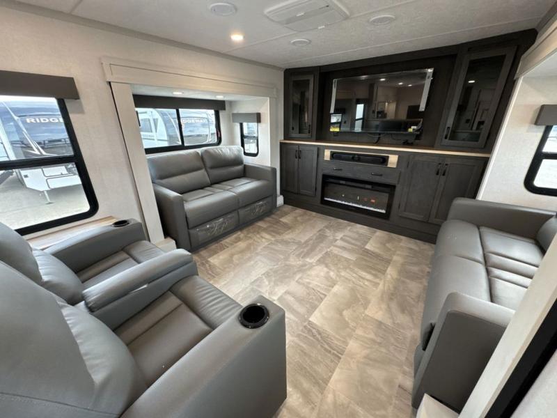 If you're looking for a luxury fifth wheel with more space and a larger sleeping capacity, you've found it! There are an impressive five slides, including dual opposing slides in the front living area and kitchen so you can really stretch out. Everyone will love to gather in the front living area on the two tri-fold sofas and theatre seating, and this room can become your guests' bedroom at night. The little ones will love to play a game at the free-standing table while the chef cooks dinner on the residential cooktop with a stainless steel oven. You'll also find a pantry here for dry goods and a 12V refrigerator for perishables. The feature that really stands out in this model is the master suite, take a look! A king bed slide and you'll have a dresser and a wardrobe for your clothes, plus access to the full bathroom. The spacious full rear bath includes a large shower with a seat, a large dual sink vanity, and a wardrobe with washer and dryer prep. And we didn't even mention the outside refrigerator that will be perfect for cold drinks under the 14' power awning!