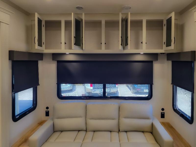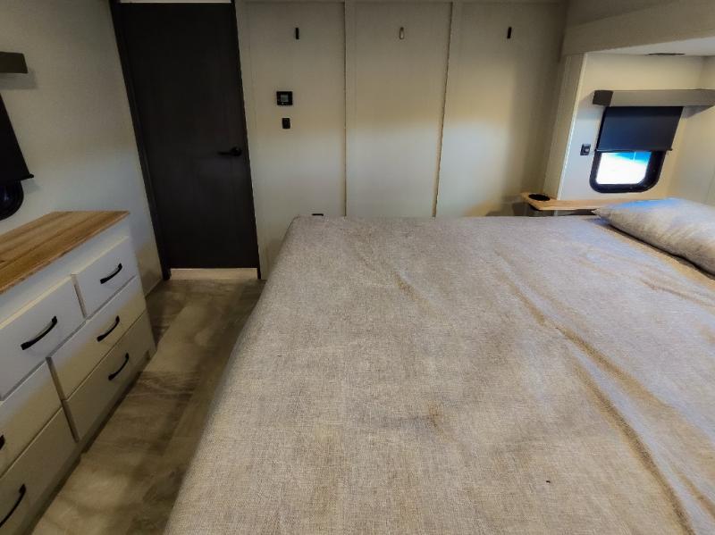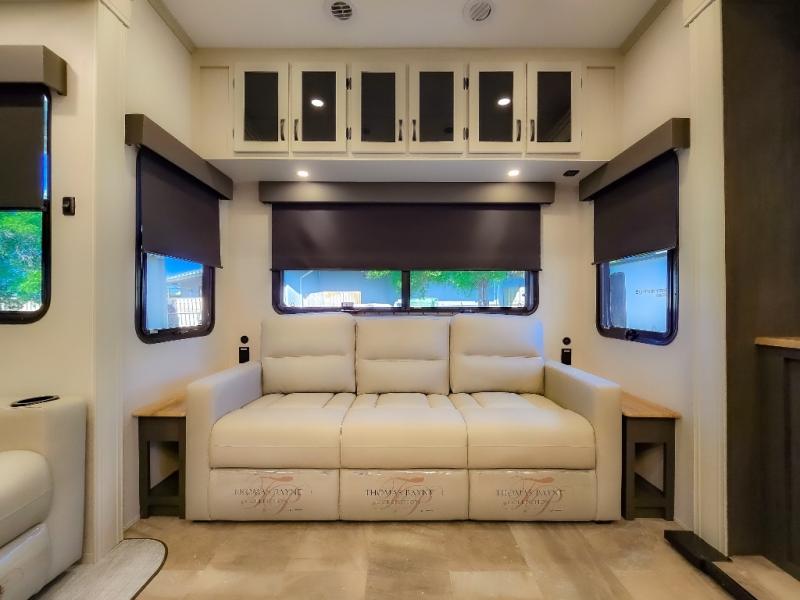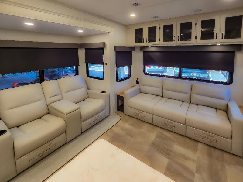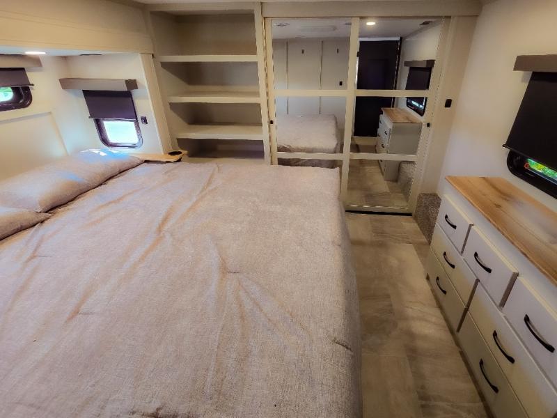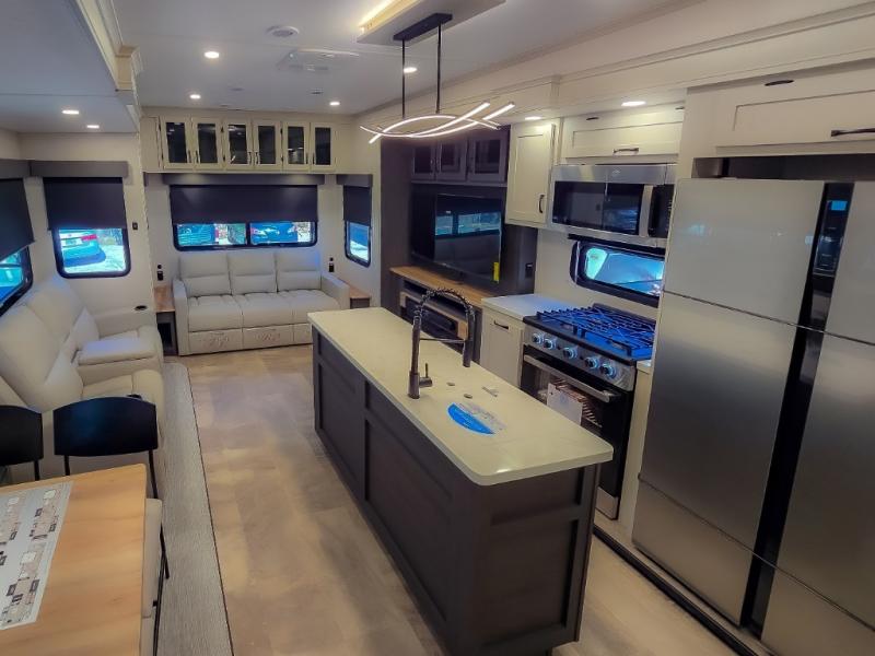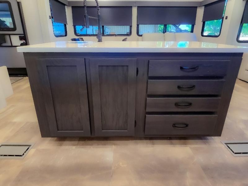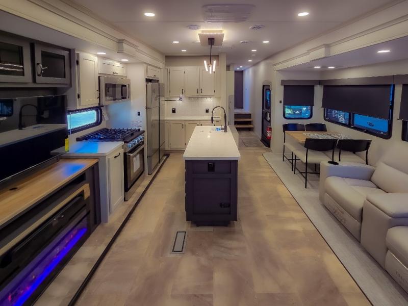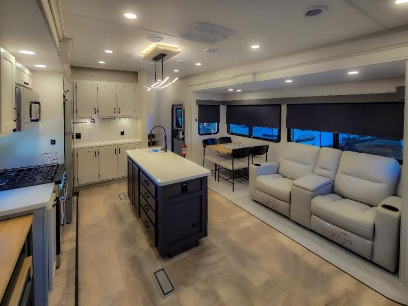 The rear living room is the perfect place to unwind, featuring a 78” trifold sofa, theater seating, overhead cabinets, and an entertainment center. Whether you're watching a movie, reading a book, or simply enjoying the company of loved ones, this room has everything you need to relax and recharge. The spacious kitchen is fitted with a kitchen island, refrigerator, microwave, free-standing table, hutch, and overhead cabinets. Perfect for preparing your favorite meals and enjoy with family. With a convenient coat bench, desk with flip-up storage, washer, and dryer, you'll have everything you need to stay organized and comfortable on the go. The full bathroom is an enormous oasis with a linen closet for added convenience. Also with a front bedroom featuring a king bed, dresser, shelves, and wardrobe, you'll have the perfect place to rest and recharge after a long day of adventure, also plenty of space for storing all your belongings and staying organized on the road.