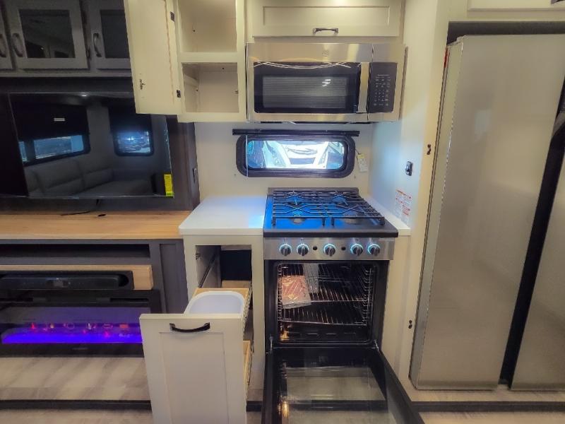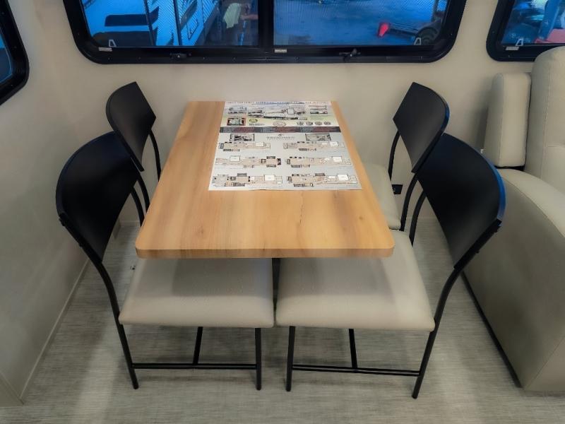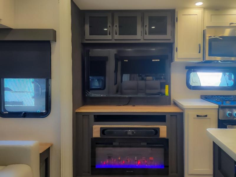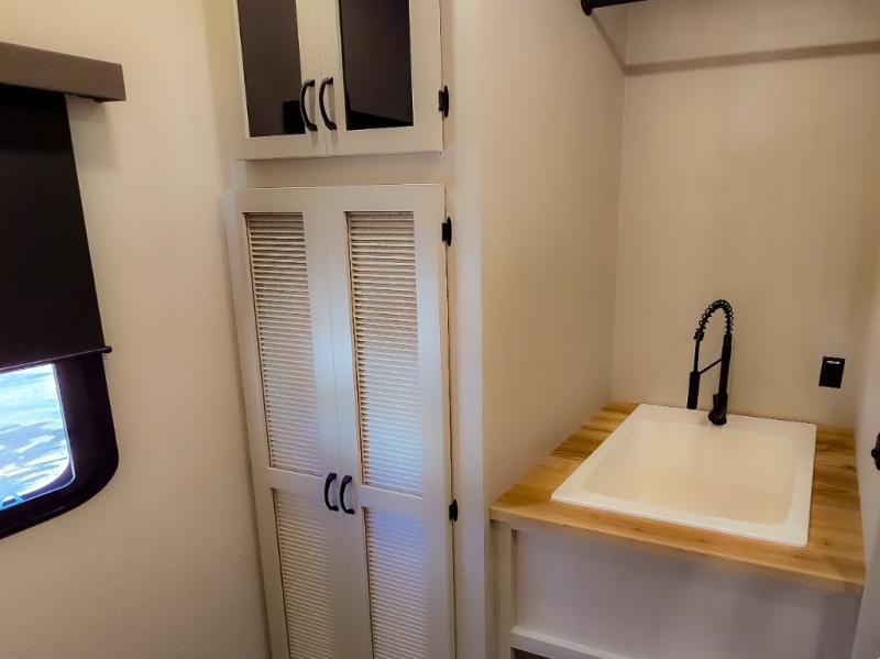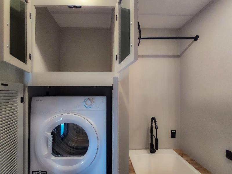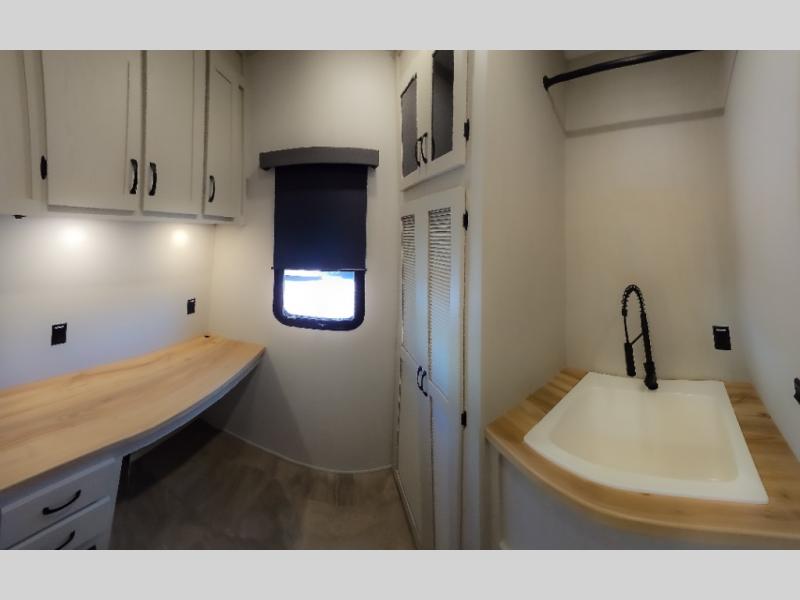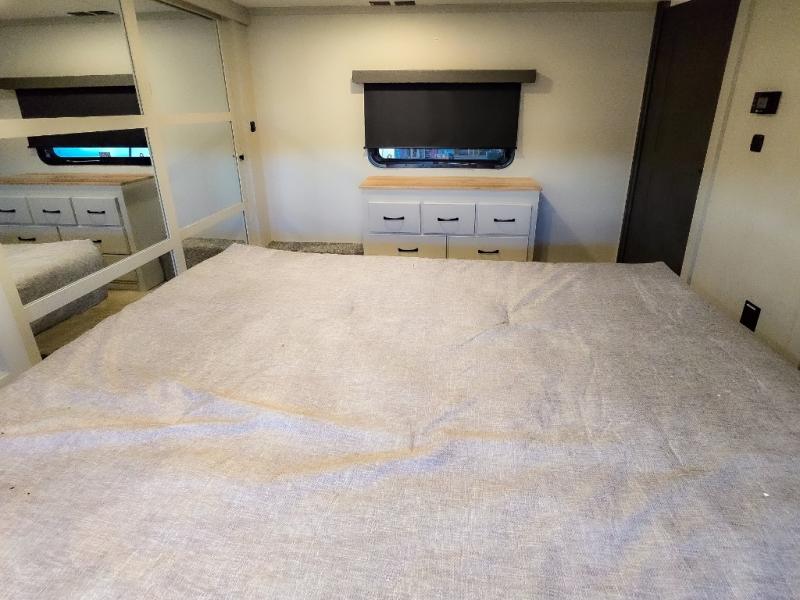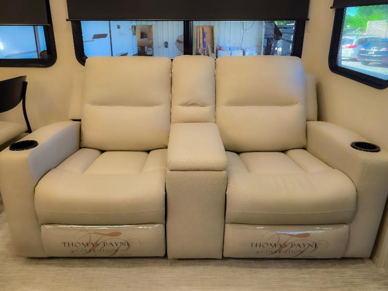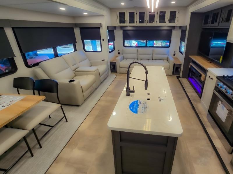 The rear living room is the perfect place to unwind, featuring a 78” trifold sofa, theater seating, overhead cabinets, and an entertainment center. Whether you're watching a movie, reading a book, or simply enjoying the company of loved ones, this room has everything you need to relax and recharge. The spacious kitchen is fitted with a kitchen island, refrigerator, microwave, free-standing table, hutch, and overhead cabinets. Perfect for preparing your favorite meals and enjoy with family. With a convenient coat bench, desk with flip-up storage, washer, and dryer, you'll have everything you need to stay organized and comfortable on the go. The full bathroom is an enormous oasis with a linen closet for added convenience. Also with a front bedroom featuring a king bed, dresser, shelves, and wardrobe, you'll have the perfect place to rest and recharge after a long day of adventure, also plenty of space for storing all your belongings and staying organized on the road.