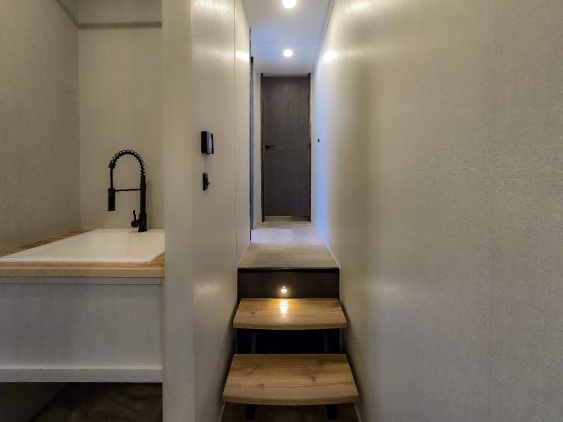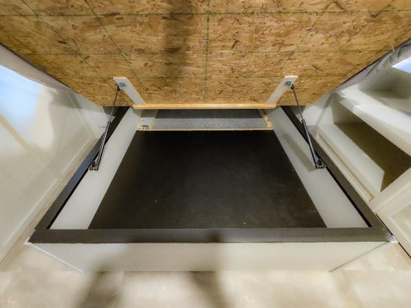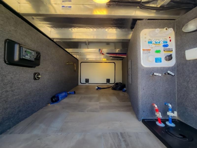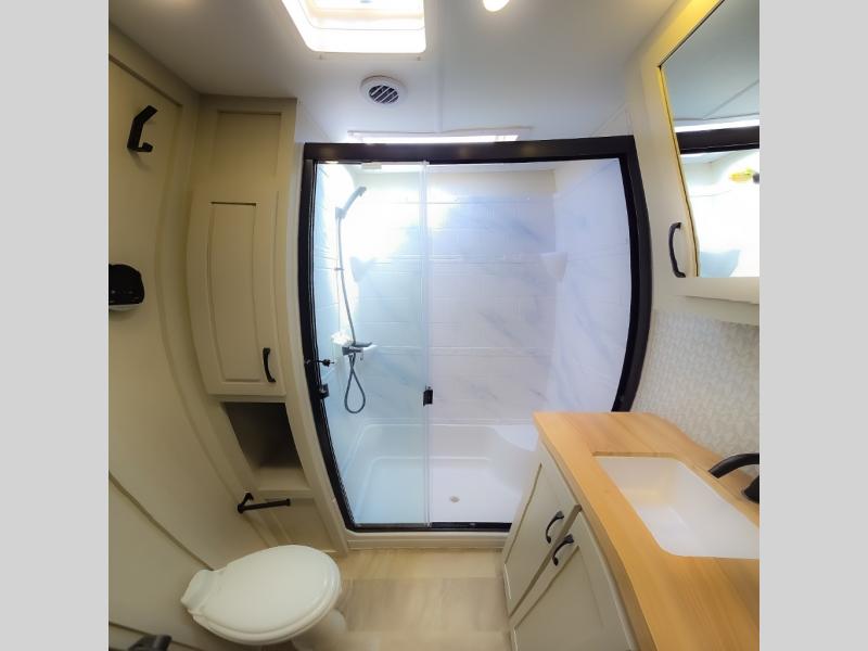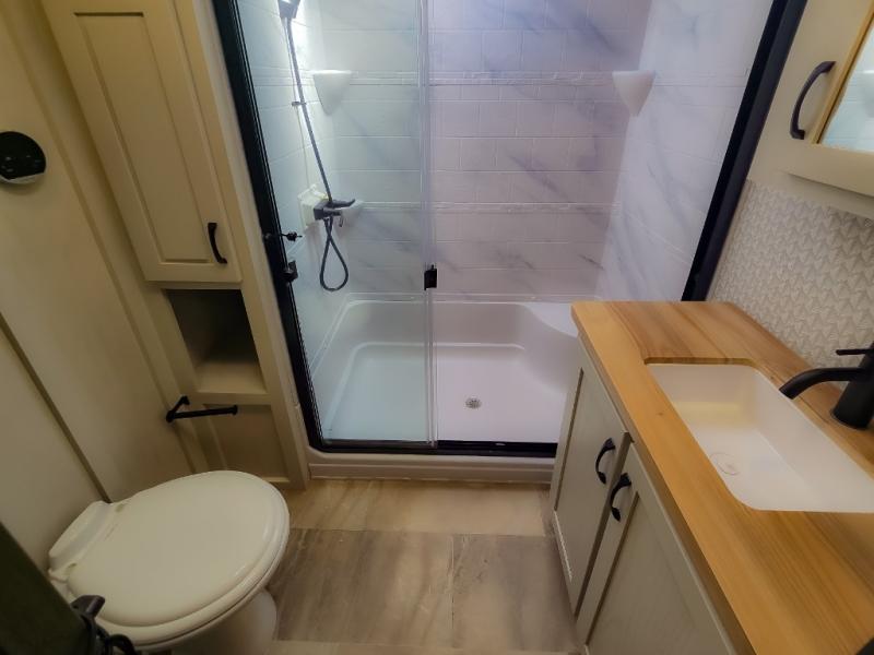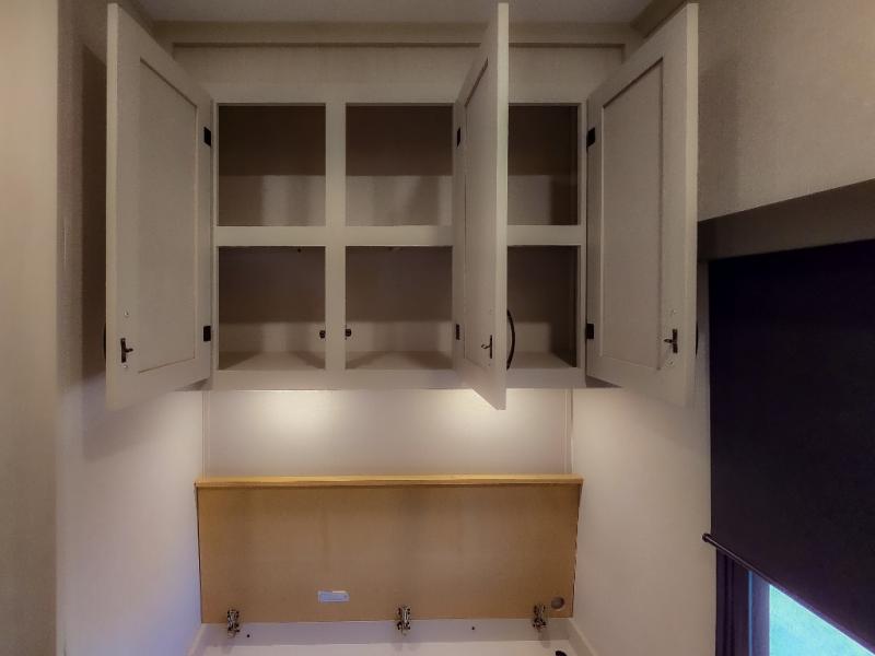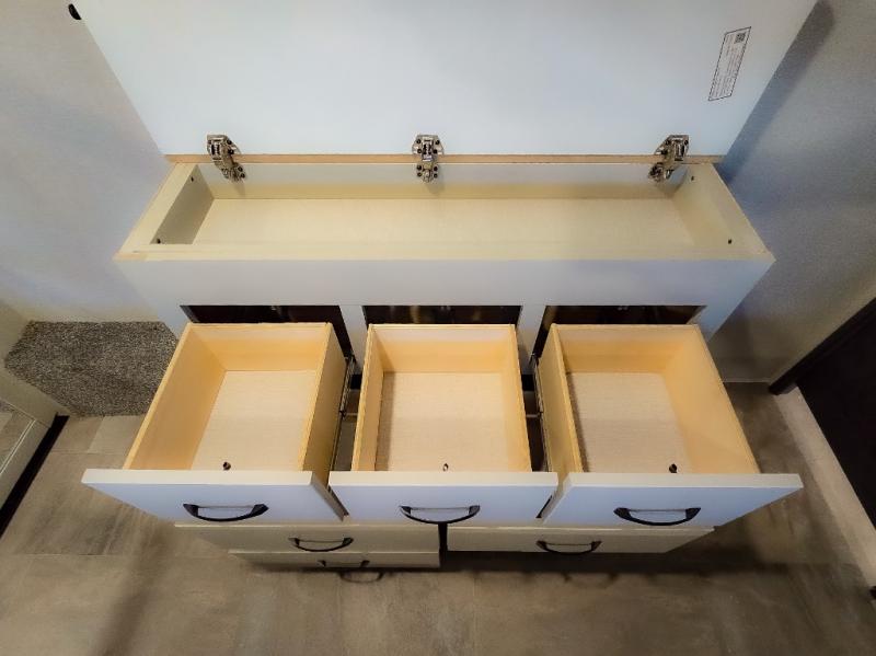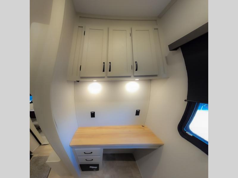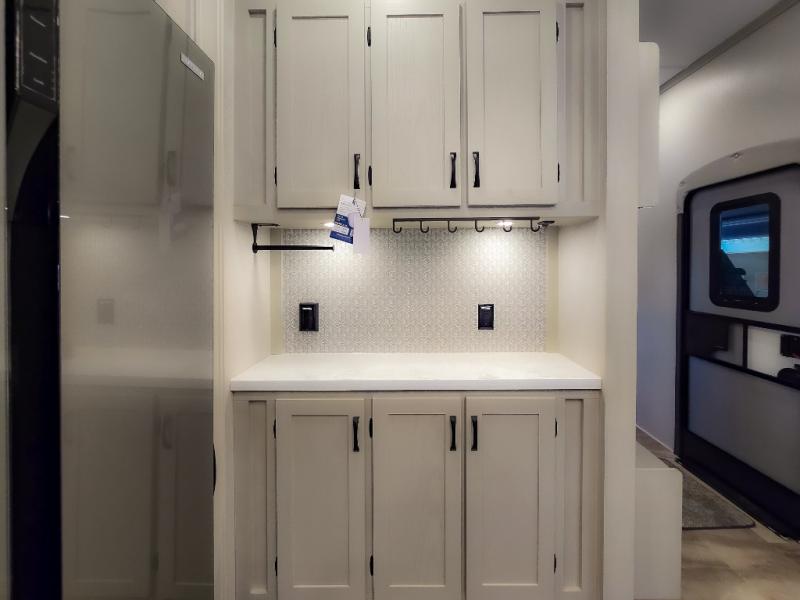 The rear living room is the perfect place to unwind, featuring a 78” trifold sofa, theater seating, overhead cabinets, and an entertainment center. Whether you're watching a movie, reading a book, or simply enjoying the company of loved ones, this room has everything you need to relax and recharge. The spacious kitchen is fitted with a kitchen island, refrigerator, microwave, free-standing table, hutch, and overhead cabinets. Perfect for preparing your favorite meals and enjoy with family. With a convenient coat bench, desk with flip-up storage, washer, and dryer, you'll have everything you need to stay organized and comfortable on the go. The full bathroom is an enormous oasis with a linen closet for added convenience. Also with a front bedroom featuring a king bed, dresser, shelves, and wardrobe, you'll have the perfect place to rest and recharge after a long day of adventure, also plenty of space for storing all your belongings and staying organized on the road.