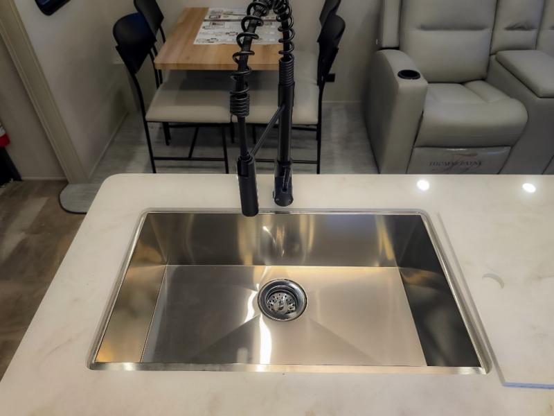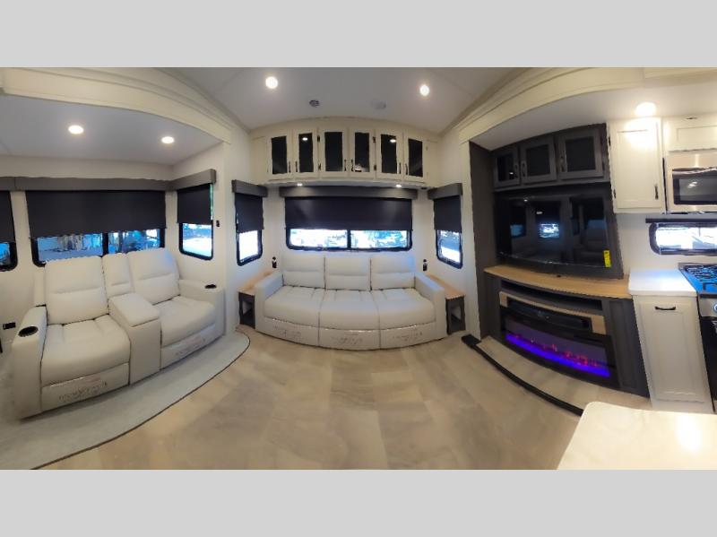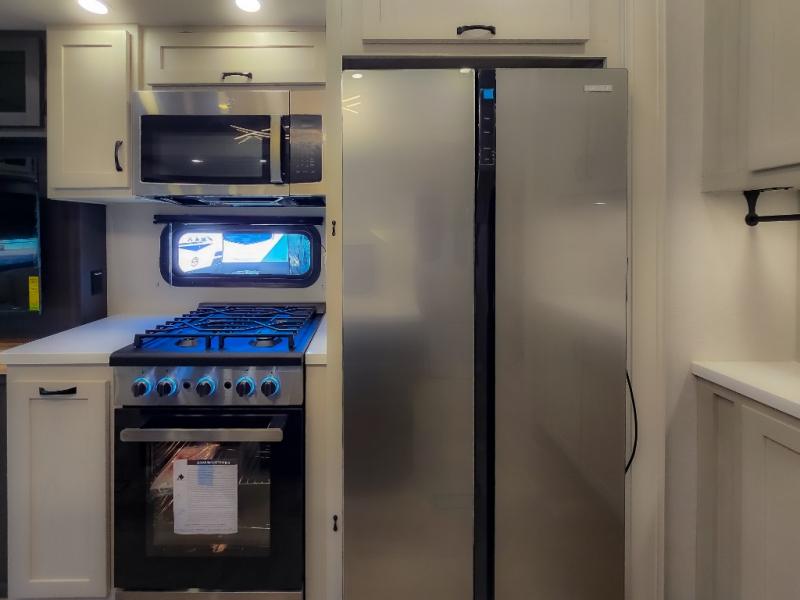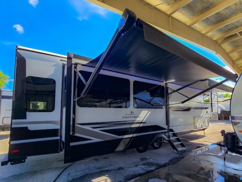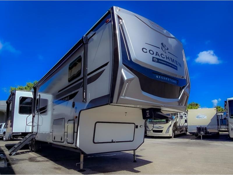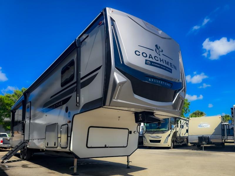 The Brookstone fifth wheels by Coachmen are coming to you with wide-body comfort, home-like amenities, and unique designs for a truly luxurious RV. The Weather Shield+ consists of a 6X double Azdel aluminum cage sidewall system, a Radiant Pro weather barrier system, and more that will help you extend your camping season or go full-time. Head inside to find solid surface countertops in the kitchen, an 4K Smart LED TV in the living room, slow rise roller night shades, and the list of comforts goes on! The Brookstone also includes 6-point electric auto-leveling, four Solid Step entry steps, an electric awning with LED lights, and many more exterior conveniences!
