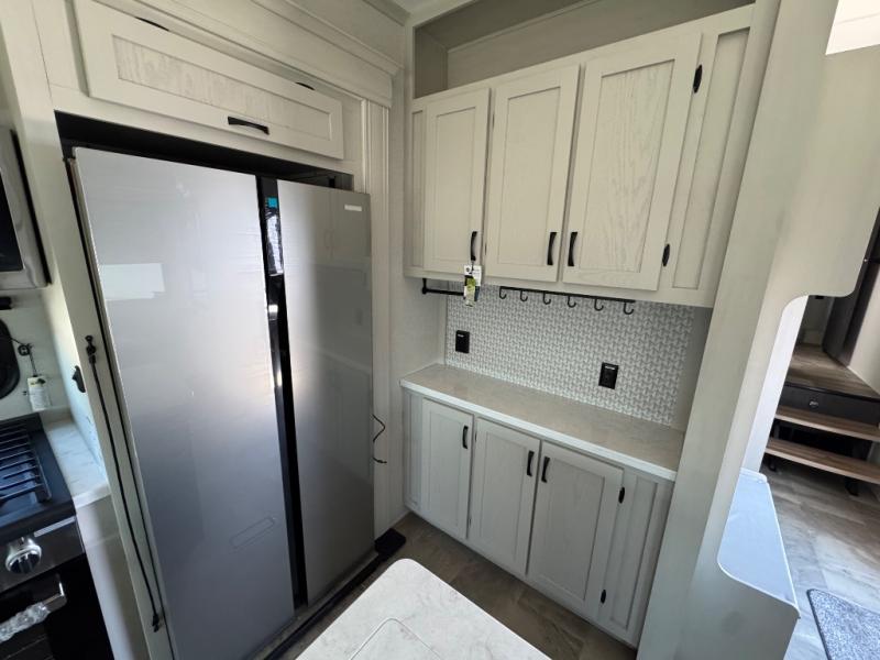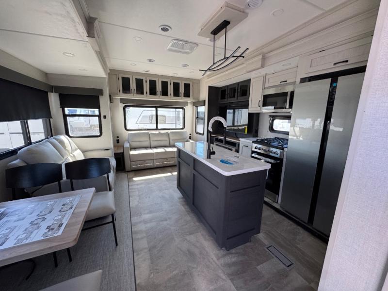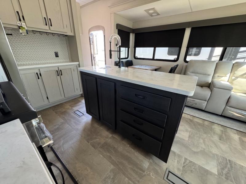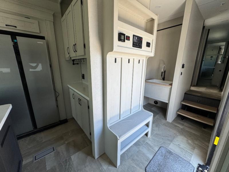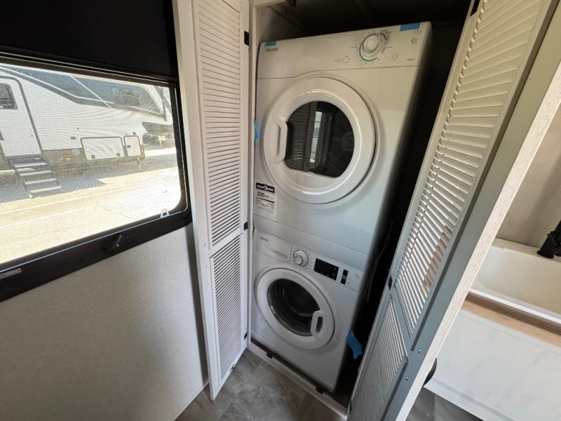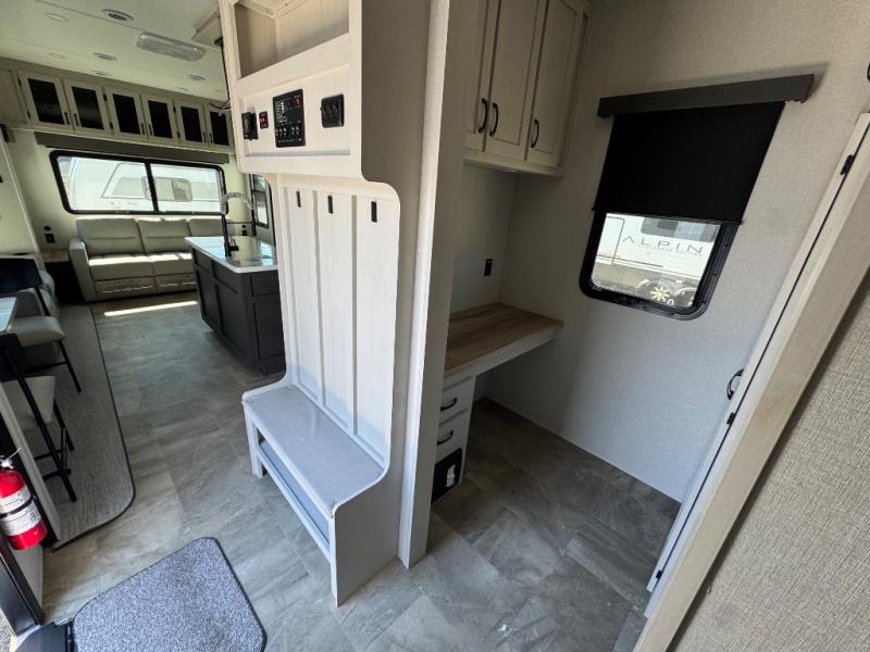 The rear living room is the perfect place to unwind, featuring a 78” trifold sofa, theater seating, overhead cabinets, and an entertainment center. Whether you're watching a movie, reading a book, or simply enjoying the company of loved ones, this room has everything you need to relax and recharge. The spacious kitchen is fitted with a kitchen island, refrigerator, microwave, free-standing table, hutch, and overhead cabinets. Perfect for preparing your favorite meals and enjoy with family. With a convenient coat bench, desk with flip-up storage, washer, and dryer, you'll have everything you need to stay organized and comfortable on the go. The full bathroom is an enormous oasis with a linen closet for added convenience. Also with a front bedroom featuring a king bed, dresser, shelves, and wardrobe, you'll have the perfect place to rest and recharge after a long day of adventure, also plenty of space for storing all your belongings and staying organized on the road.
