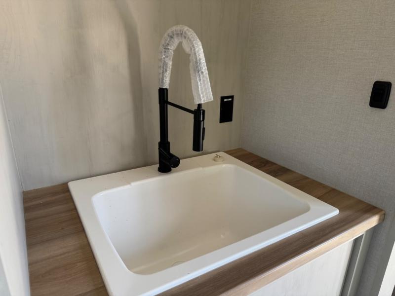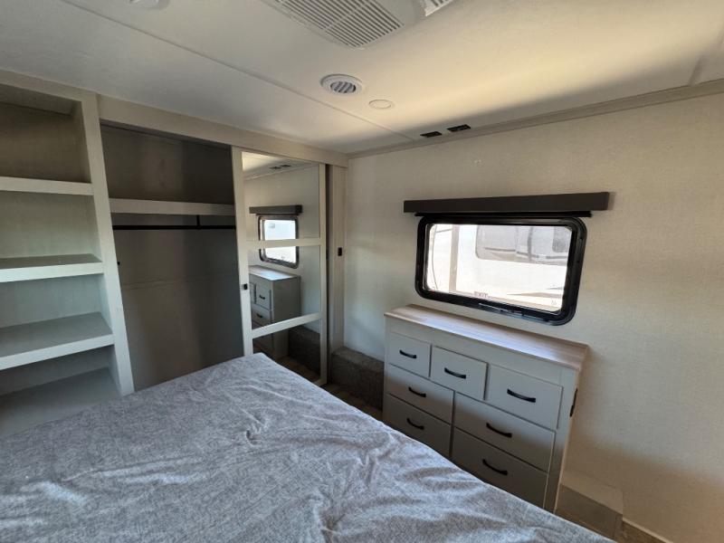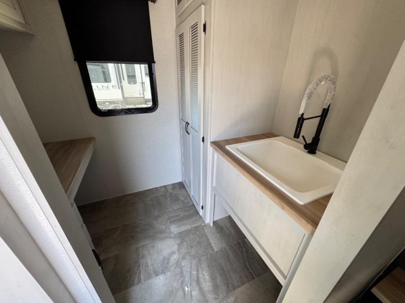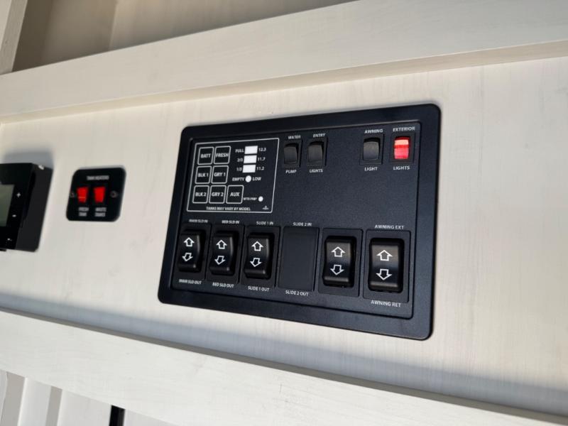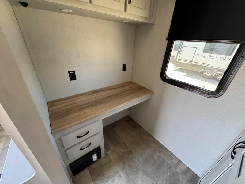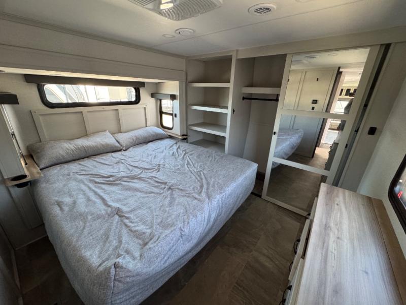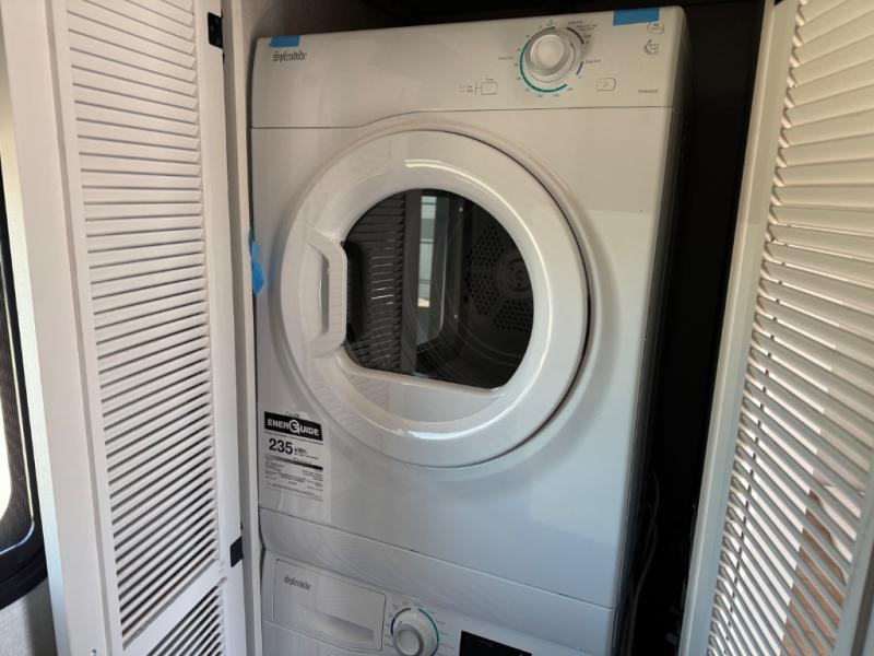 The rear living room is the perfect place to unwind, featuring a 78” trifold sofa, theater seating, overhead cabinets, and an entertainment center. Whether you're watching a movie, reading a book, or simply enjoying the company of loved ones, this room has everything you need to relax and recharge. The spacious kitchen is fitted with a kitchen island, refrigerator, microwave, free-standing table, hutch, and overhead cabinets. Perfect for preparing your favorite meals and enjoy with family. With a convenient coat bench, desk with flip-up storage, washer, and dryer, you'll have everything you need to stay organized and comfortable on the go. The full bathroom is an enormous oasis with a linen closet for added convenience. Also with a front bedroom featuring a king bed, dresser, shelves, and wardrobe, you'll have the perfect place to rest and recharge after a long day of adventure, also plenty of space for storing all your belongings and staying organized on the road.