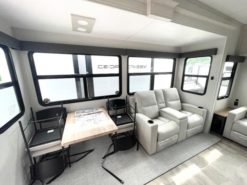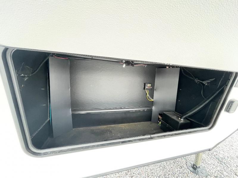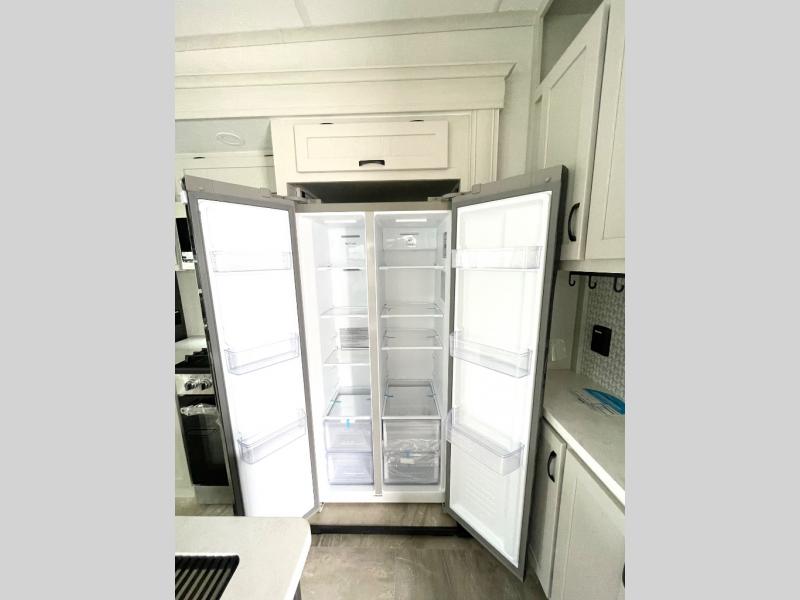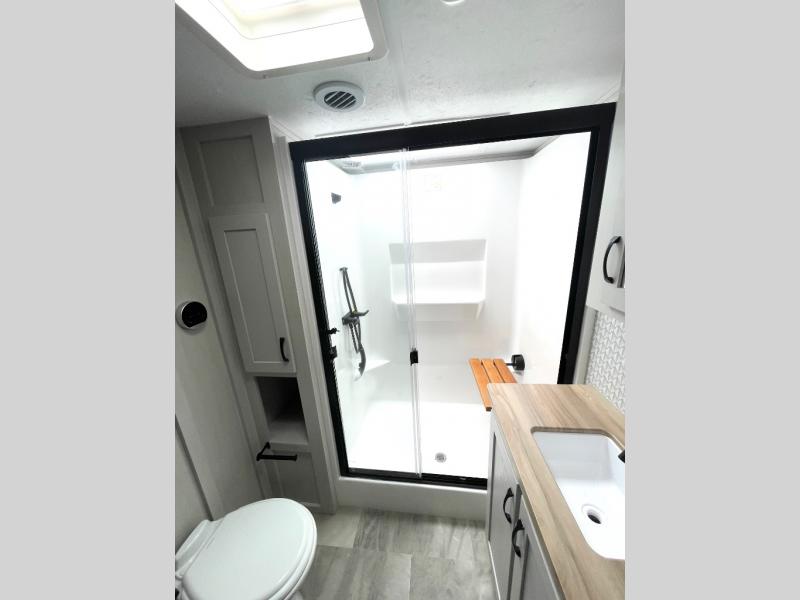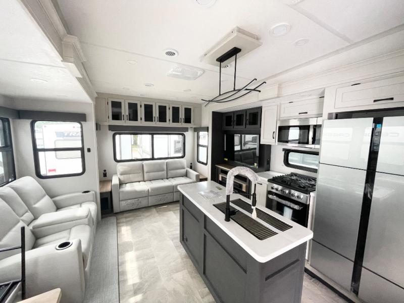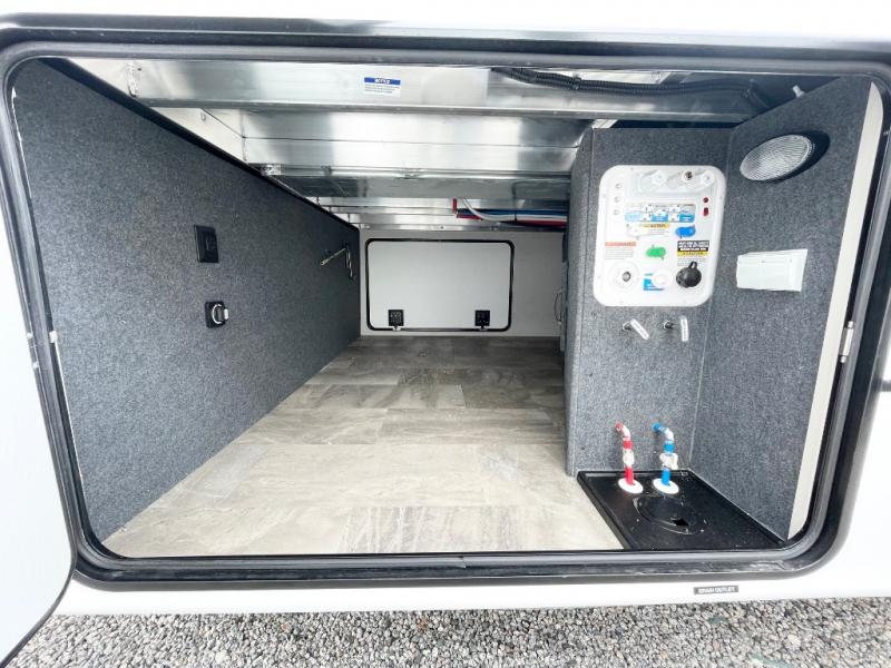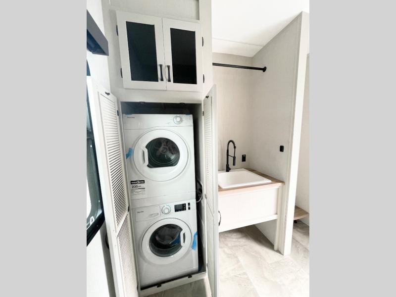 The rear living room is the perfect place to unwind, featuring a 78” trifold sofa, theater seating, overhead cabinets, and an entertainment center. Whether you're watching a movie, reading a book, or simply enjoying the company of loved ones, this room has everything you need to relax and recharge. The spacious kitchen is fitted with a kitchen island, refrigerator, microwave, free-standing table, hutch, and overhead cabinets. Perfect for preparing your favorite meals and enjoy with family. With a convenient coat bench, desk with flip-up storage, washer, and dryer, you'll have everything you need to stay organized and comfortable on the go. The full bathroom is an enormous oasis with a linen closet for added convenience. Also with a front bedroom featuring a king bed, dresser, shelves, and wardrobe, you'll have the perfect place to rest and recharge after a long day of adventure, also plenty of space for storing all your belongings and staying organized on the road.