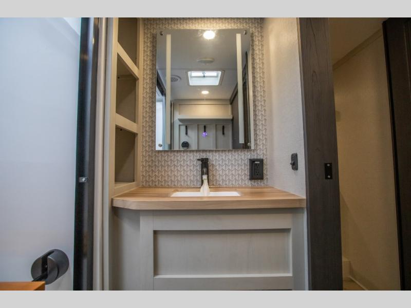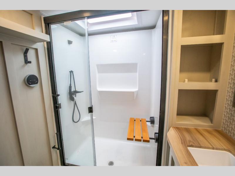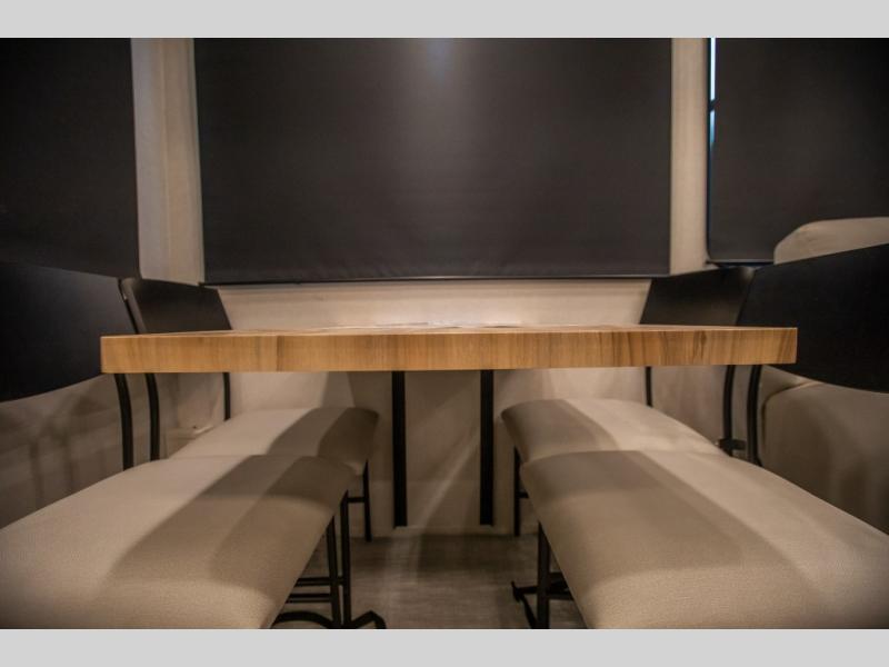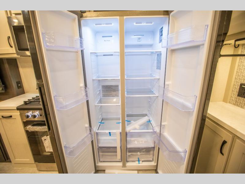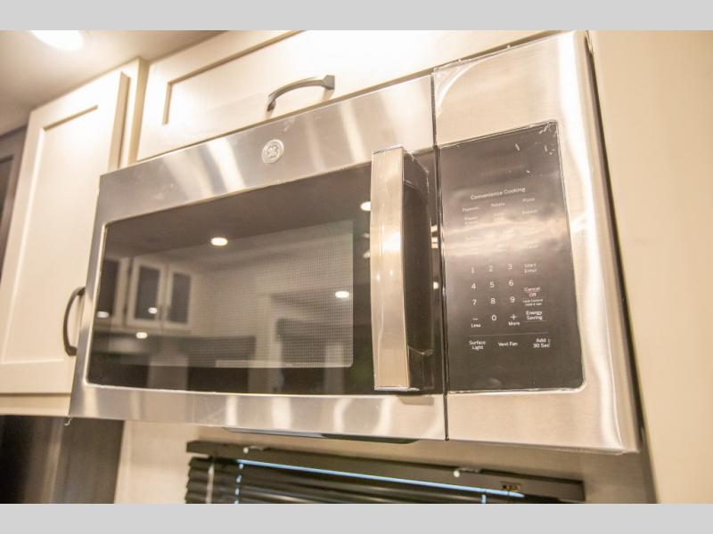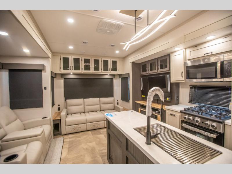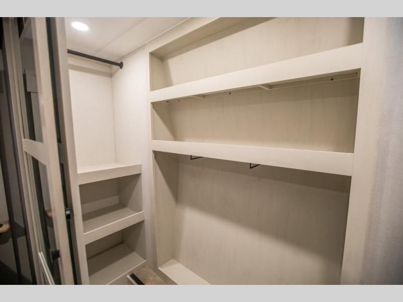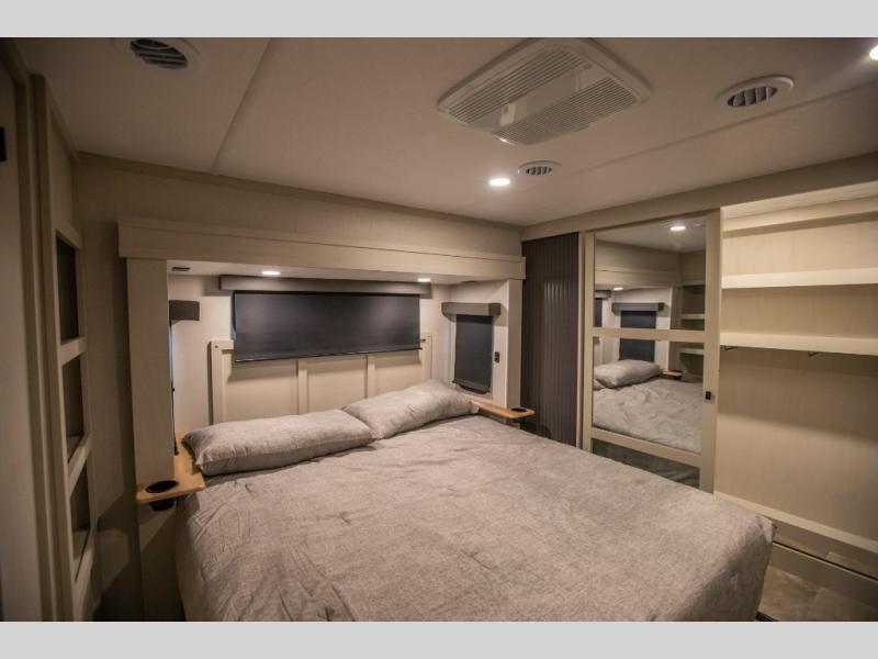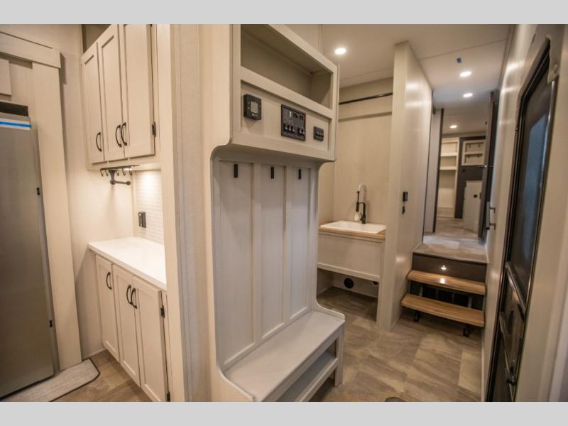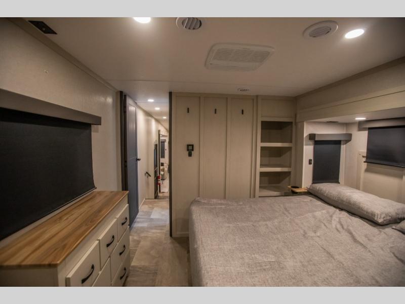 The rear living room is the perfect place to unwind, featuring a 78” trifold sofa, theater seating, overhead cabinets, and an entertainment center. Whether you're watching a movie, reading a book, or simply enjoying the company of loved ones, this room has everything you need to relax and recharge. The spacious kitchen is fitted with a kitchen island, refrigerator, microwave, free-standing table, hutch, and overhead cabinets. Perfect for preparing your favorite meals and enjoy with family. With a convenient coat bench, desk with flip-up storage, washer, and dryer, you'll have everything you need to stay organized and comfortable on the go. The full bathroom is an enormous oasis with a linen closet for added convenience. Also with a front bedroom featuring a king bed, dresser, shelves, and wardrobe, you'll have the perfect place to rest and recharge after a long day of adventure, also plenty of space for storing all your belongings and staying organized on the road.