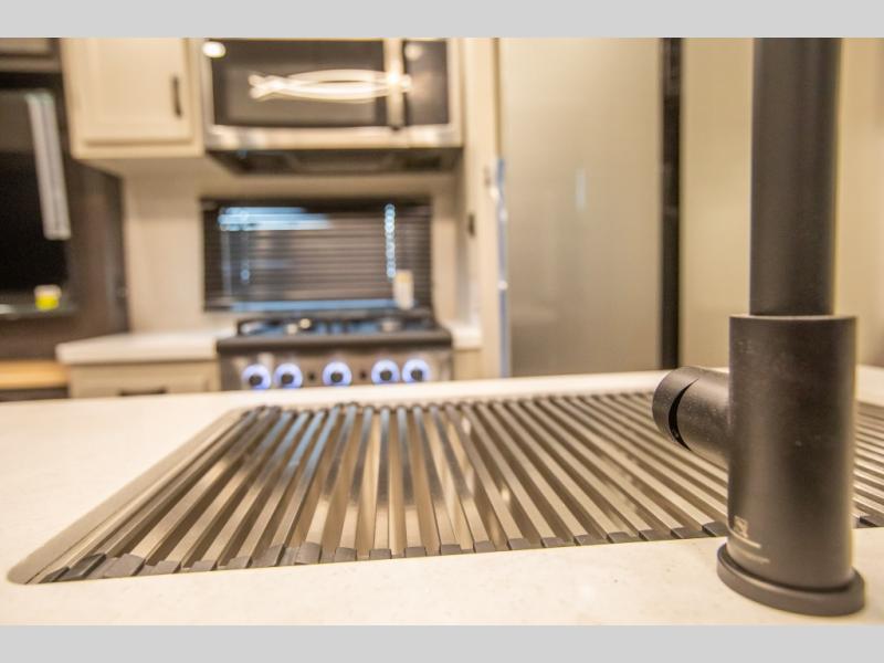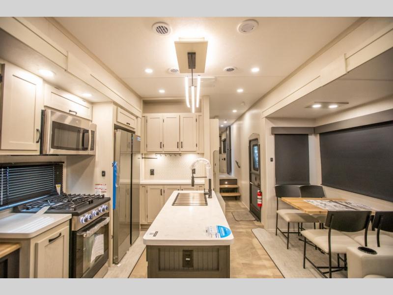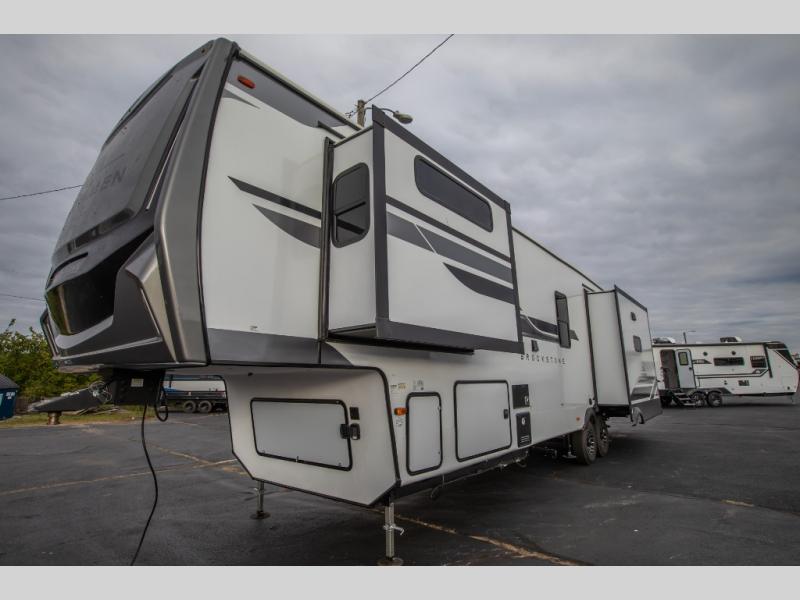 The Brookstone fifth wheels by Coachmen are coming to you with wide-body comfort, home-like amenities, and unique designs for a truly luxurious RV. The Weather Shield+ consists of a 6X double Azdel aluminum cage sidewall system, a Radiant Pro weather barrier system, and more that will help you extend your camping season or go full-time. Head inside to find solid surface countertops in the kitchen, an 4K Smart LED TV in the living room, slow rise roller night shades, and the list of comforts goes on! The Brookstone also includes 6-point electric auto-leveling, four Solid Step entry steps, an electric awning with LED lights, and many more exterior conveniences!