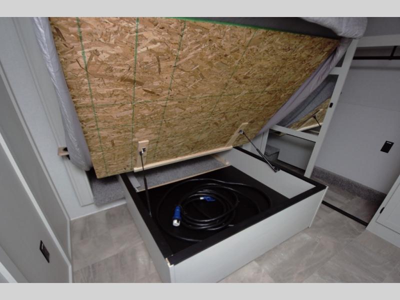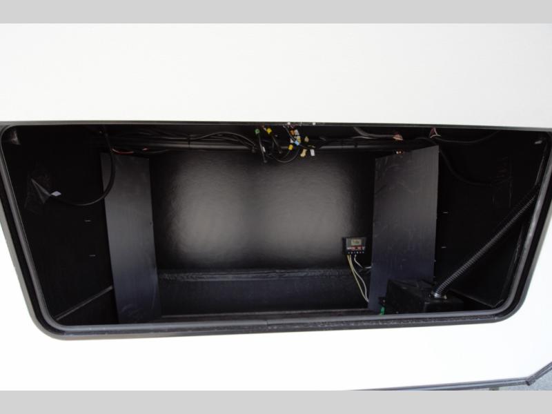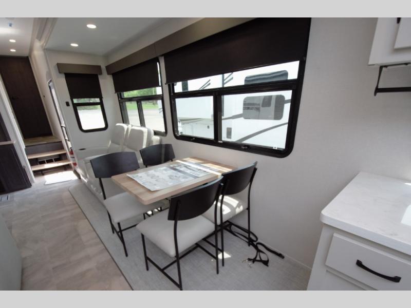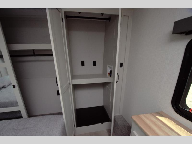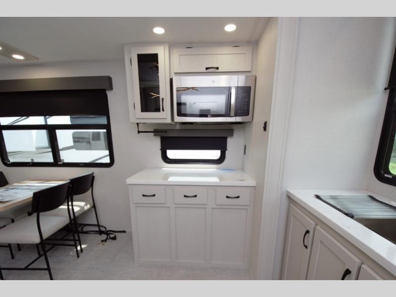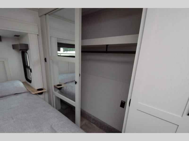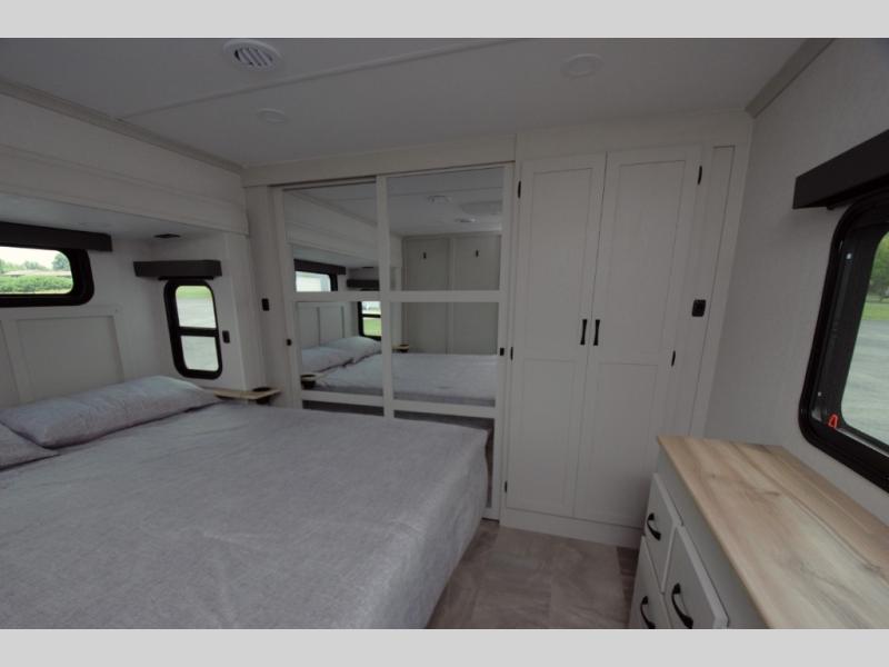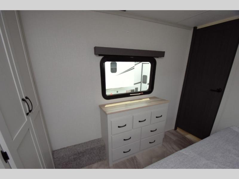 In the front bedroom, enjoy a king bed slide out, a full wall wardrobe, and a large dresser. This space is designed to feel just like home, whether you are on a weekend getaway or full time RVing.