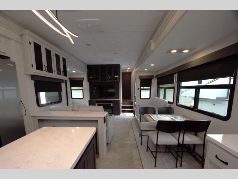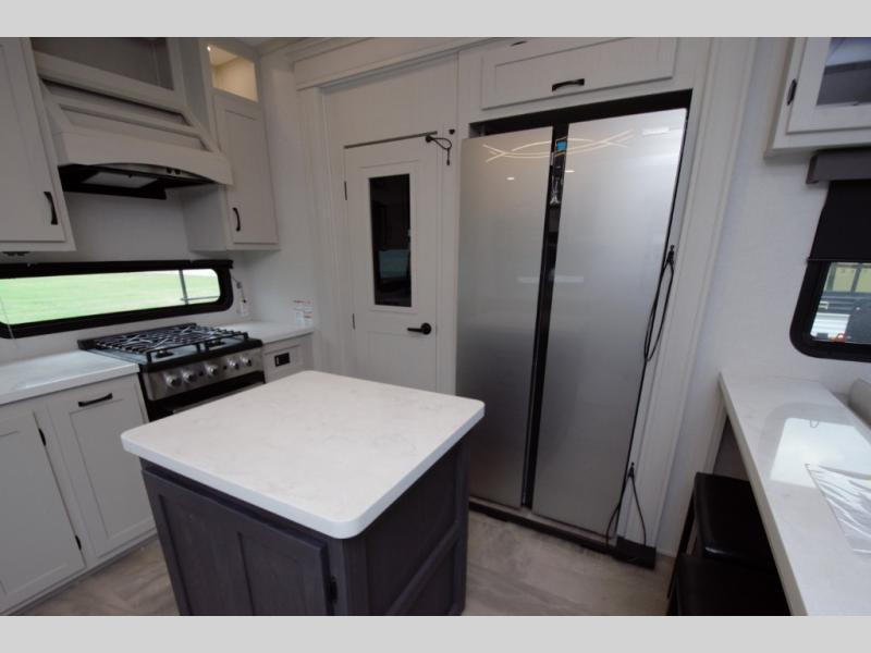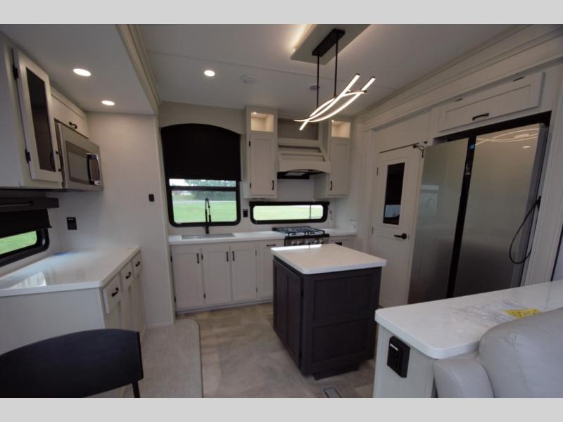 Experience residential comfort and luxury in the Coachmen Brookstone 374RK fifth wheel. This RV features a rear kitchen layout with ample counter space, a large island, a hutch for extra storage, and a pantry to store all your essentials.