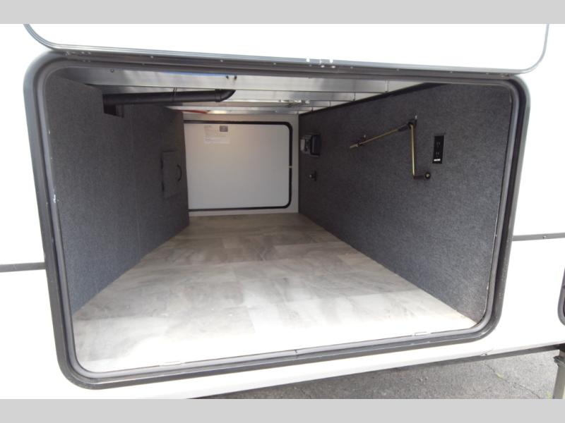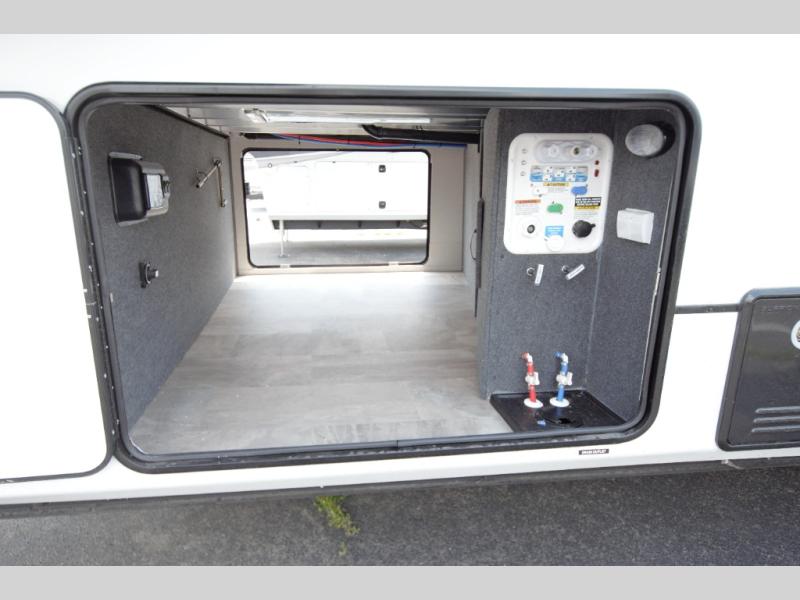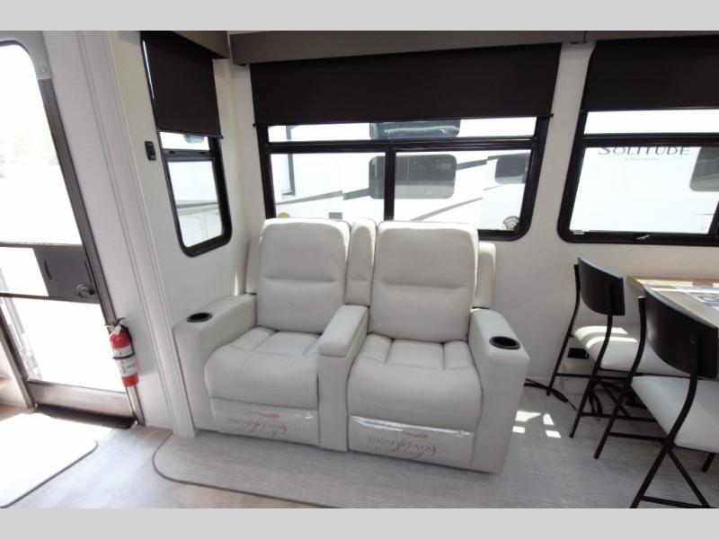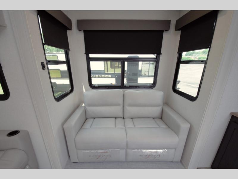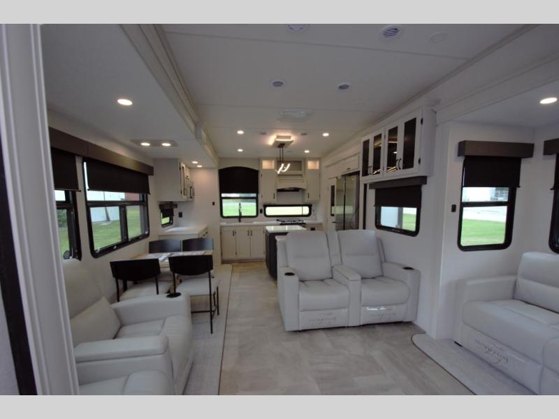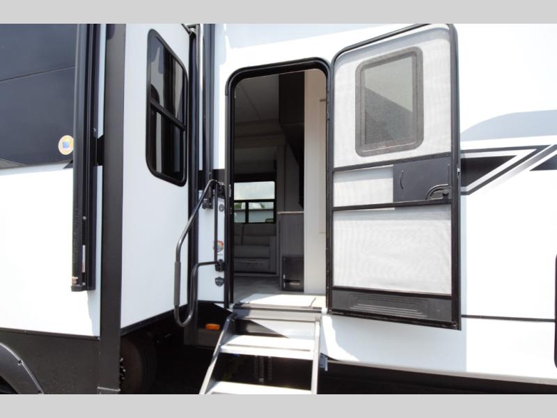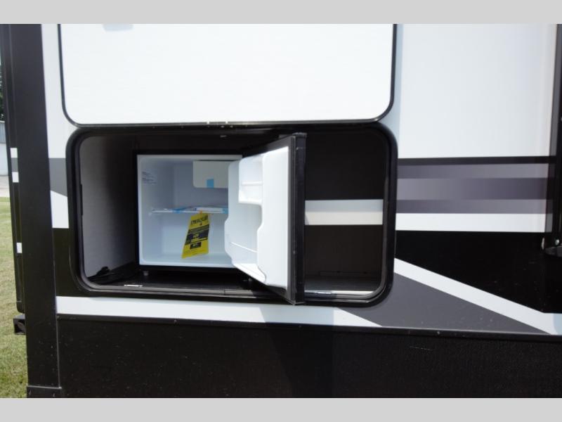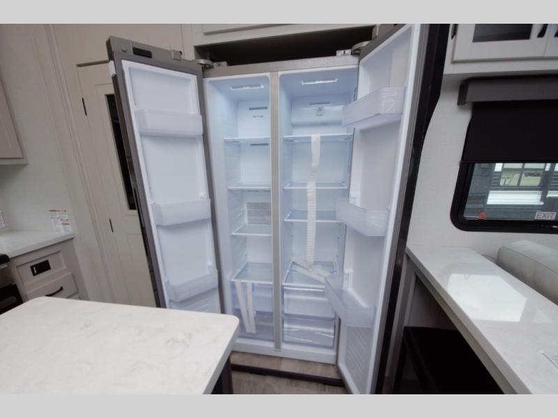 Relax in the main living area with theater seating and a tri fold sofa, or enjoy the outdoors under two power awnings. Entertain guests with the exterior refrigerator and create memorable moments around your campsite.