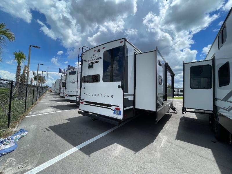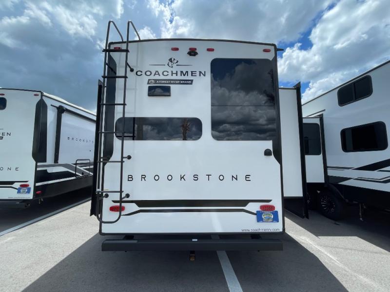 The Brookstone fifth wheels by Coachmen are coming to you with wide-body comfort, home-like amenities, and unique designs for a truly luxurious RV. The Weather Shield+ consists of a 6X double Azdel aluminum cage sidewall system, a Radiant Pro weather barrier system, and more that will help you extend your camping season or go full-time. Head inside to find solid surface countertops in the kitchen, an 4K Smart LED TV in the living room, slow rise roller night shades, and the list of comforts goes on! The Brookstone also includes 6-point electric auto-leveling, four Solid Step entry steps, an electric awning with LED lights, and many more exterior conveniences!