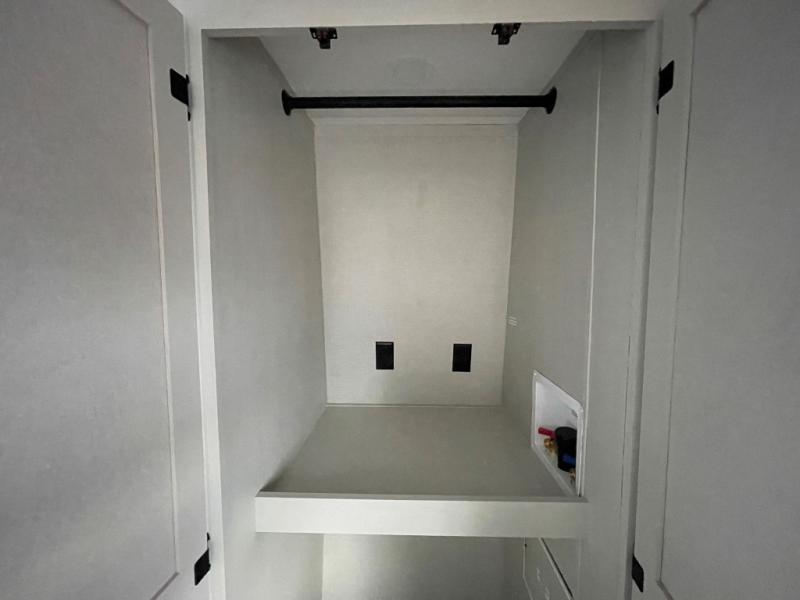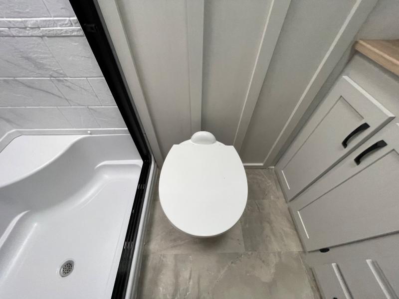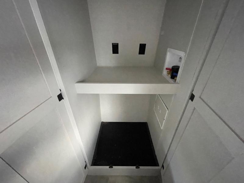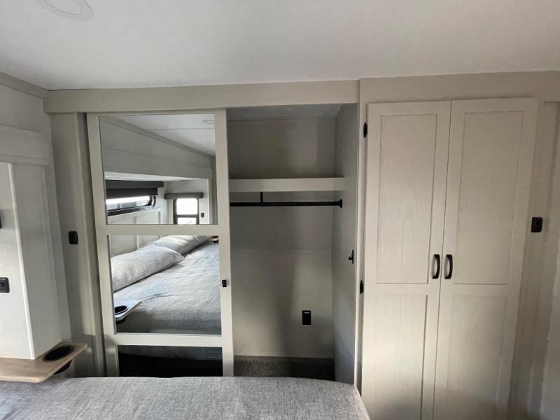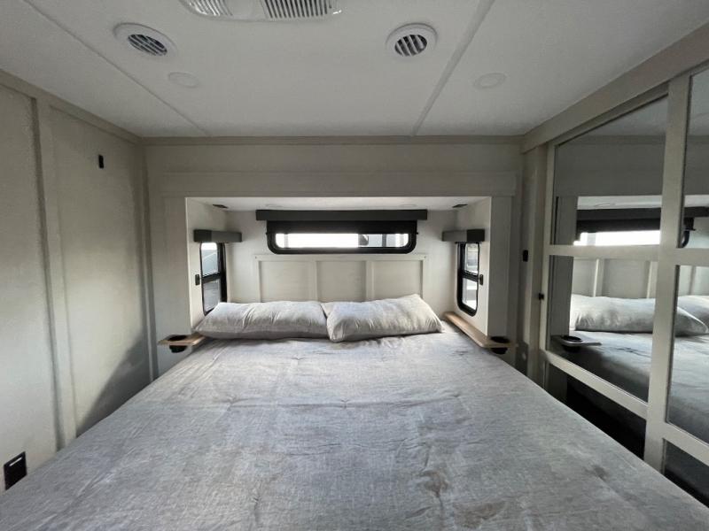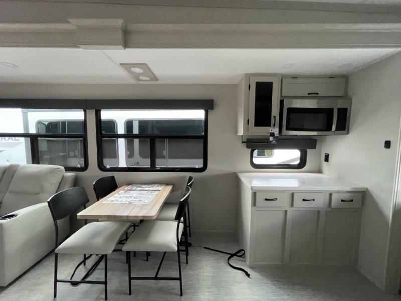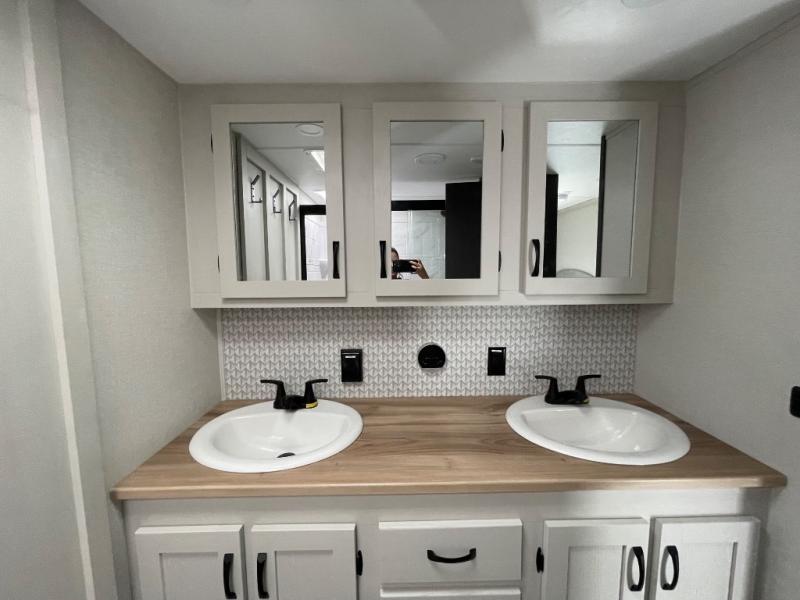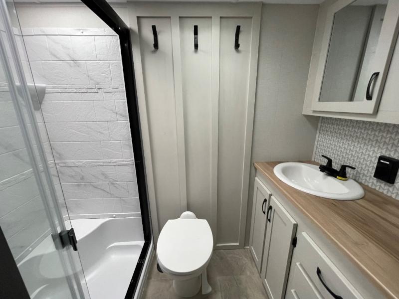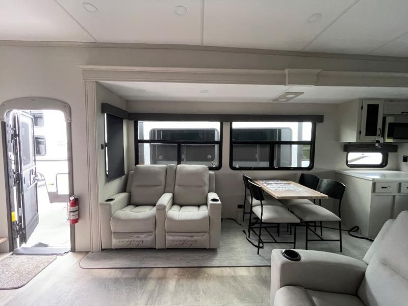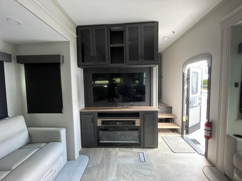 One look at this fifth wheel and you'll be sold. You'll find tons of counter space in the rear kitchen along with a kitchen island, a large pantry, and a hutch for even more storage. Visit in the main living area on the two theater seats and tri-fold sofa, or you may want to head outdoors under the two power awnings! There is even an outside refrigerator here to entertain guests. The spacious full bath will allow you to clean up after a day of adventuring, and here you'll find a full-size shower with sliding glass doors and a seat, plus a dual sink vanity. The front private bedroom will feel just like home with its king bed slide out, large wardrobe, and dresser to keep your clothes tidy.