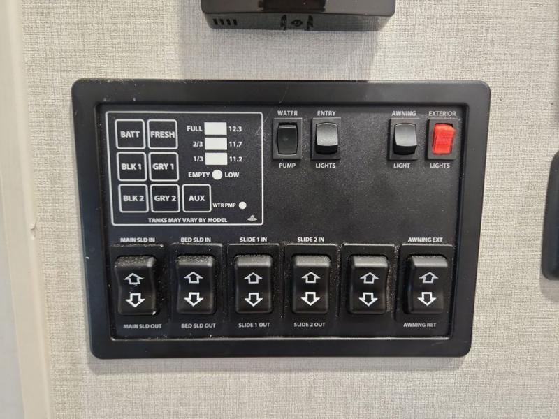 One look at this fifth wheel and you'll be sold. You'll find tons of counter space in the rear kitchen along with a kitchen island, a large pantry, and a hutch for even more storage. Visit in the main living area on the two theater seats and tri-fold sofa, or you may want to head outdoors under the two power awnings! There is even an outside refrigerator here to entertain guests. The spacious full bath will allow you to clean up after a day of adventuring, and here you'll find a full-size shower with sliding glass doors and a seat, plus a dual sink vanity. The front private bedroom will feel just like home with its king bed slide out, large wardrobe, and dresser to keep your clothes tidy.