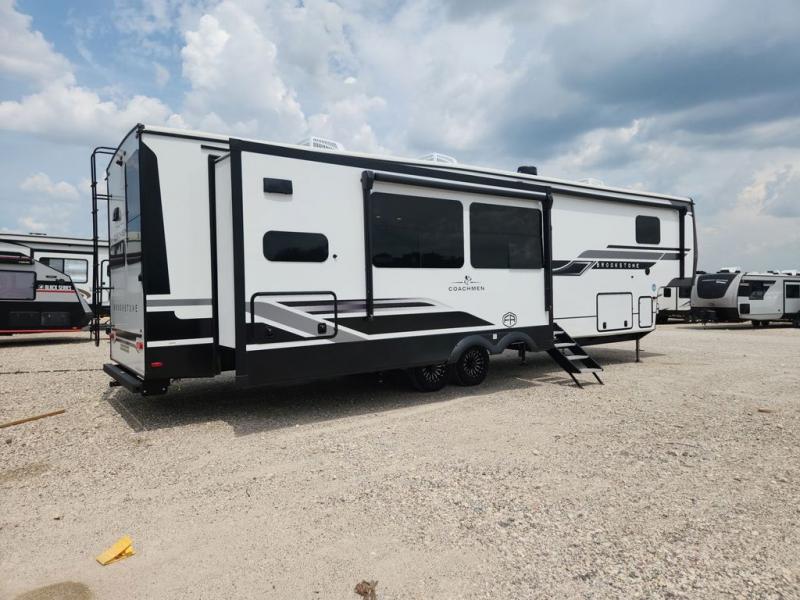 The Brookstone fifth wheels by Coachmen are coming to you with wide-body comfort, home-like amenities, and unique designs for a truly luxurious RV. The Weather Shield+ consists of a 6X double Azdel aluminum cage sidewall system, a Radiant Pro weather barrier system, and more that will help you extend your camping season or go full-time. Head inside to find solid surface countertops in the kitchen, an 4K Smart LED TV in the living room, slow rise roller night shades, and the list of comforts goes on! The Brookstone also includes 6-point electric auto-leveling, four Solid Step entry steps, an electric awning with LED lights, and many more exterior conveniences!