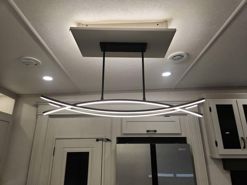 One look at this fifth wheel and you'll be sold. You'll find tons of counter space in the rear kitchen along with a kitchen island, a large pantry, and a hutch for even more storage. Visit in the main living area on the two theater seats and tri-fold sofa, or you may want to head outdoors under the two power awnings! There is even an outside refrigerator here to entertain guests. The spacious full bath will allow you to clean up after a day of adventuring, and here you'll find a full-size shower with sliding glass doors and a seat, plus a dual sink vanity. The front private bedroom will feel just like home with its king bed slide out, large wardrobe, and dresser to keep your clothes tidy.