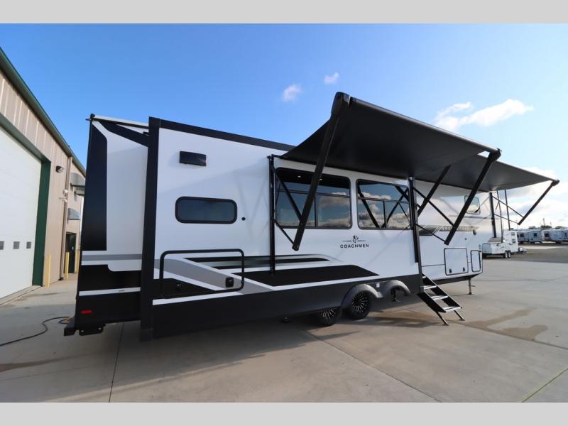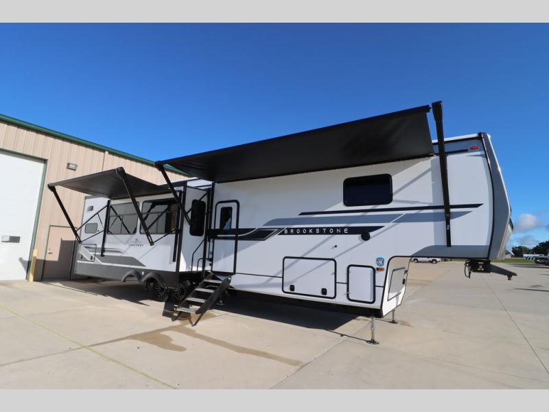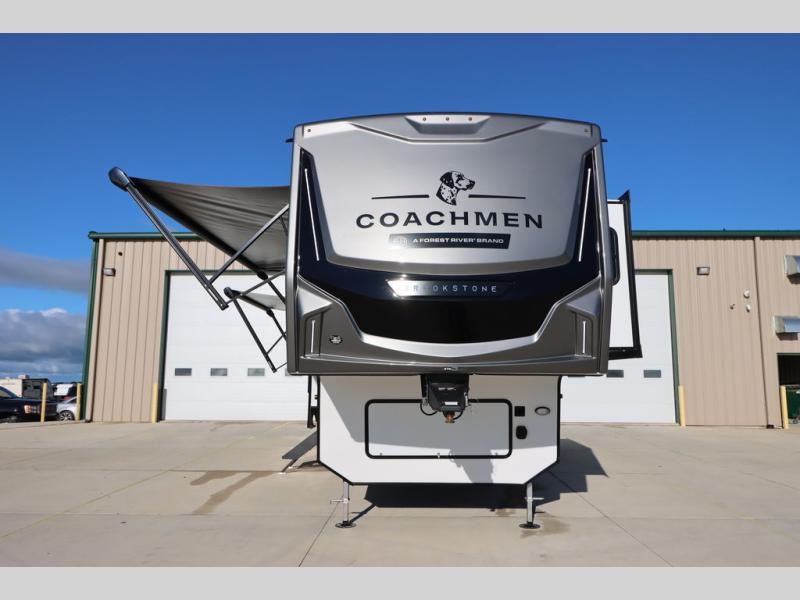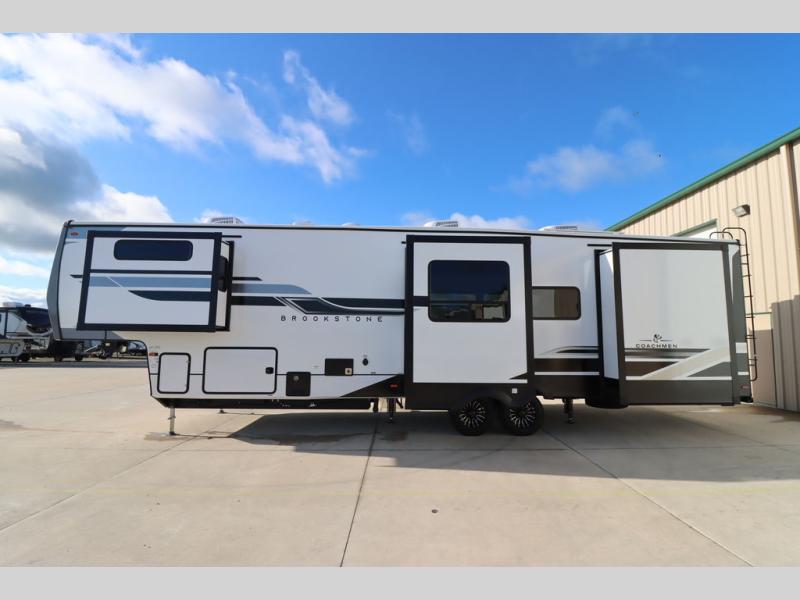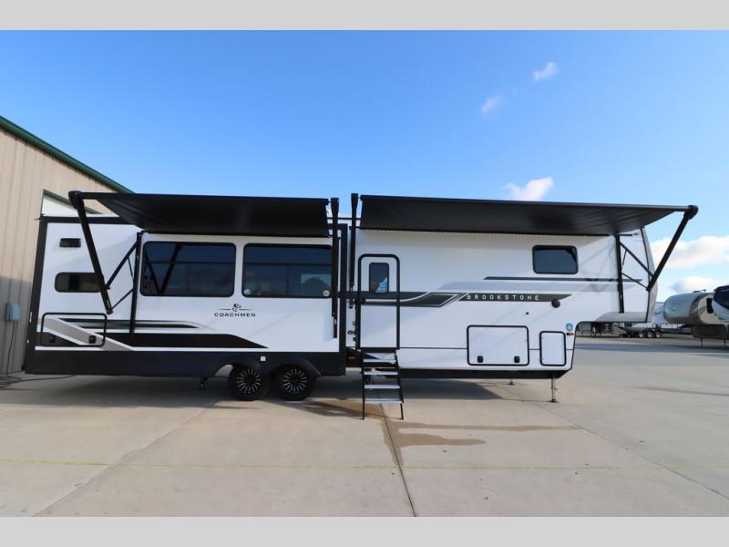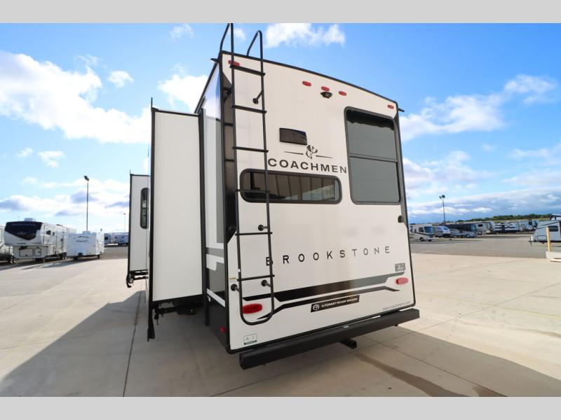 The Brookstone fifth wheels by Coachmen are coming to you with wide-body comfort, home-like amenities, and unique designs for a truly luxurious RV. The Weather Shield+ consists of a 6X double Azdel aluminum cage sidewall system, a Radiant Pro weather barrier system, and more that will help you extend your camping season or go full-time. Head inside to find solid surface countertops in the kitchen, an 4K Smart LED TV in the living room, slow rise roller night shades, and the list of comforts goes on! The Brookstone also includes 6-point electric auto-leveling, four Solid Step entry steps, an electric awning with LED lights, and many more exterior conveniences!