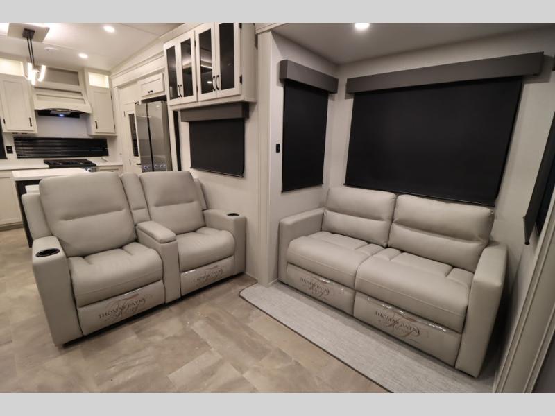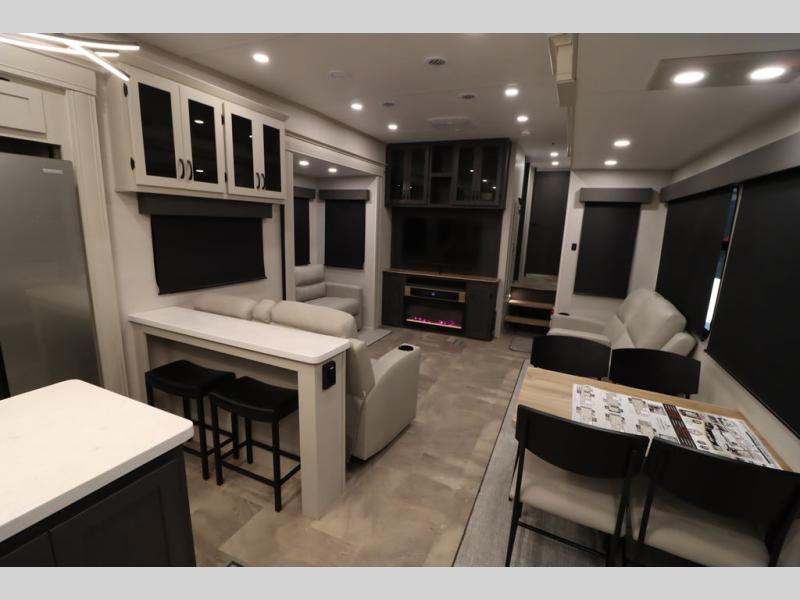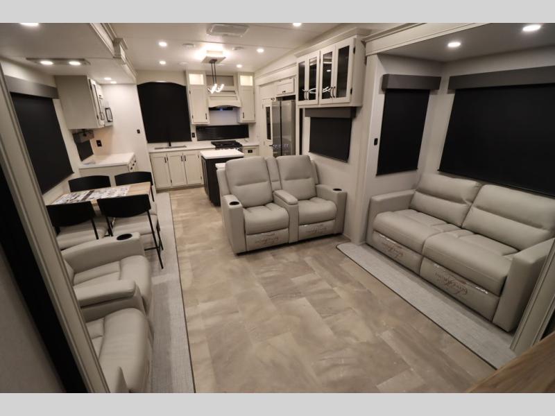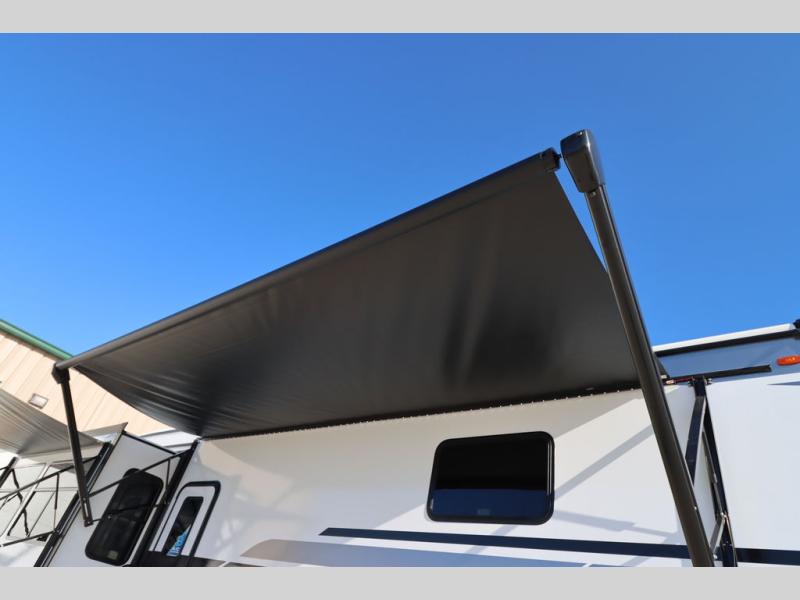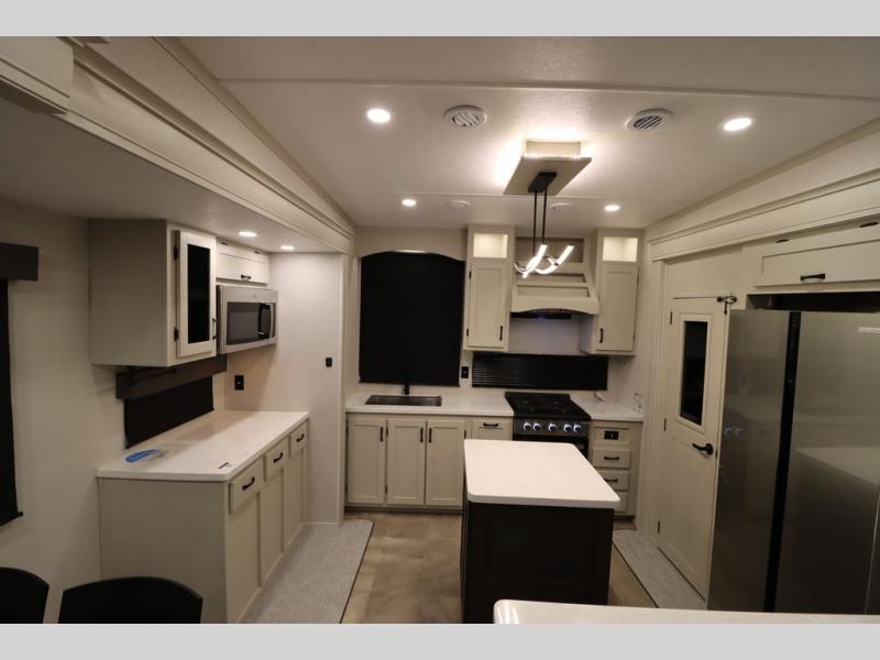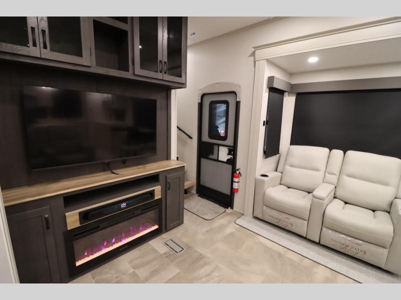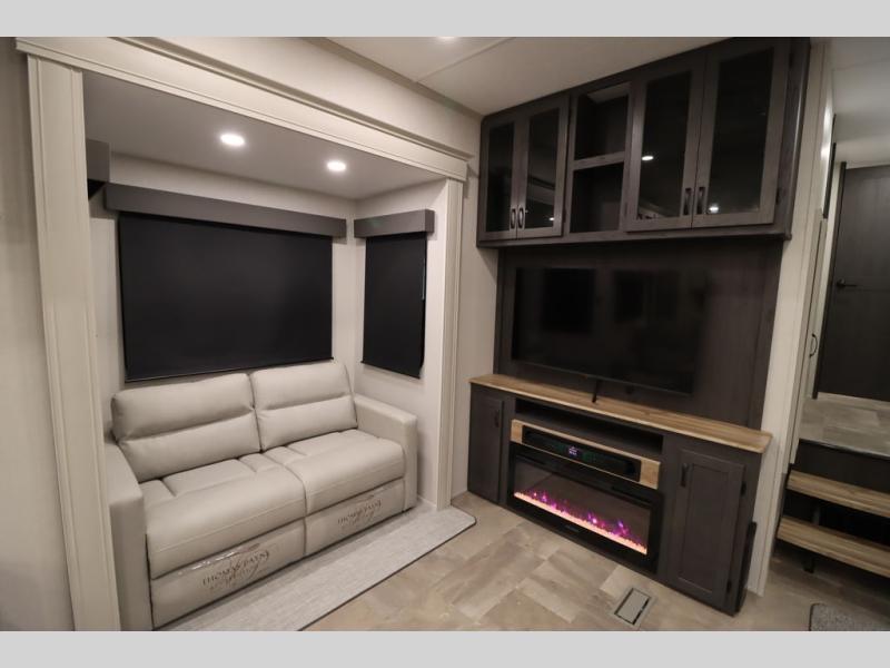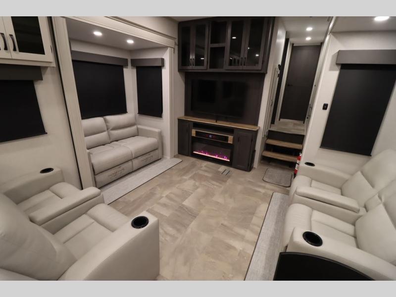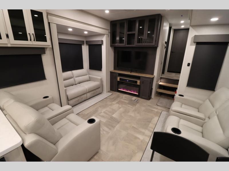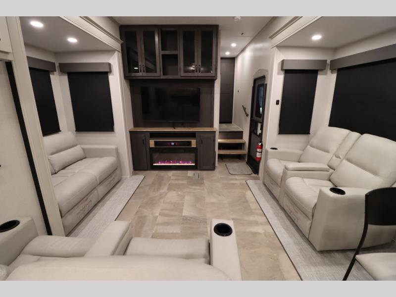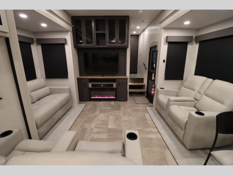 One look at this fifth wheel and you'll be sold. You'll find tons of counter space in the rear kitchen along with a kitchen island, a large pantry, and a hutch for even more storage. Visit in the main living area on the two theater seats and tri-fold sofa, or you may want to head outdoors under the two power awnings! There is even an outside refrigerator here to entertain guests. The spacious full bath will allow you to clean up after a day of adventuring, and here you'll find a full-size shower with sliding glass doors and a seat, plus a dual sink vanity. The front private bedroom will feel just like home with its king bed slide out, large wardrobe, and dresser to keep your clothes tidy.