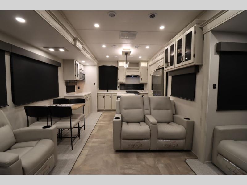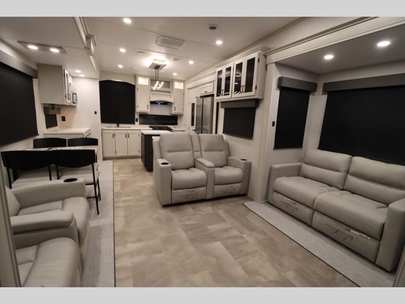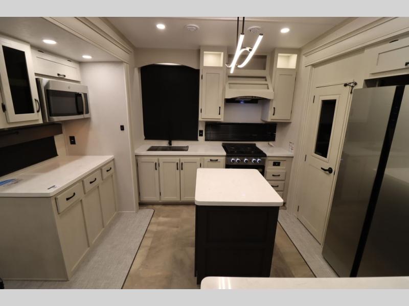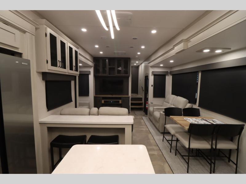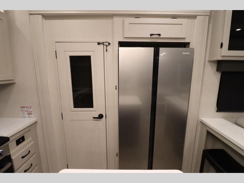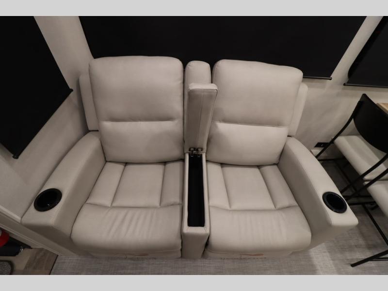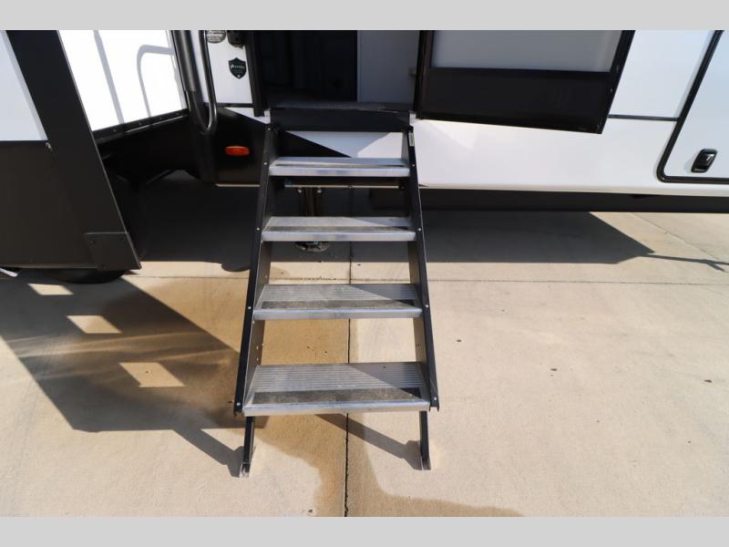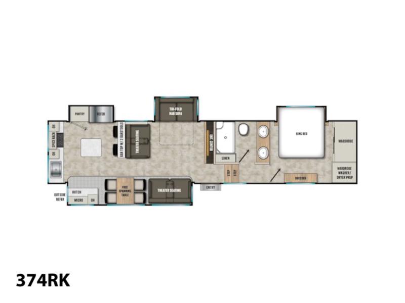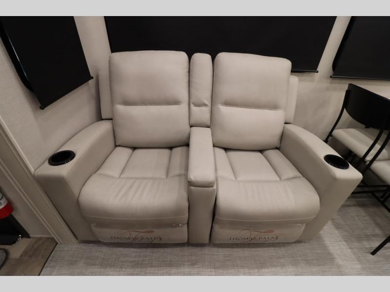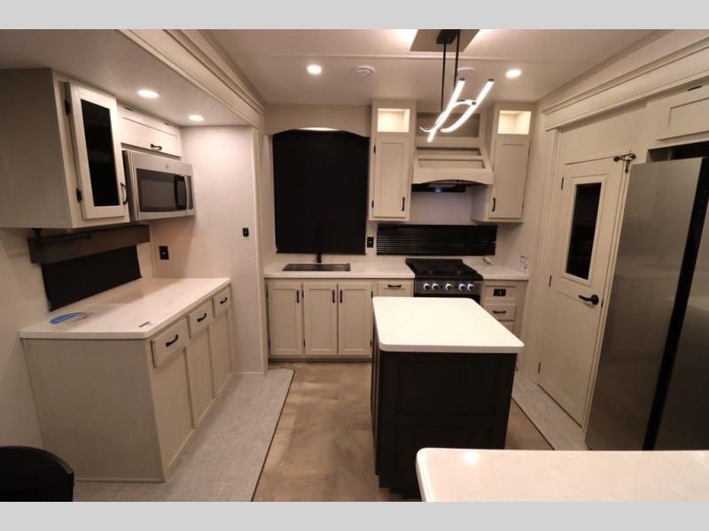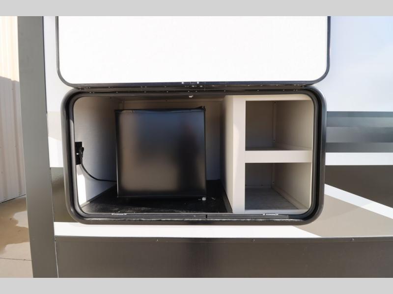 One look at this fifth wheel and you'll be sold. You'll find tons of counter space in the rear kitchen along with a kitchen island, a large pantry, and a hutch for even more storage. Visit in the main living area on the two theater seats and tri-fold sofa, or you may want to head outdoors under the two power awnings! There is even an outside refrigerator here to entertain guests. The spacious full bath will allow you to clean up after a day of adventuring, and here you'll find a full-size shower with sliding glass doors and a seat, plus a dual sink vanity. The front private bedroom will feel just like home with its king bed slide out, large wardrobe, and dresser to keep your clothes tidy.