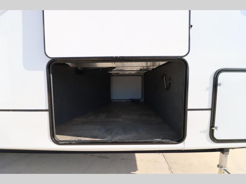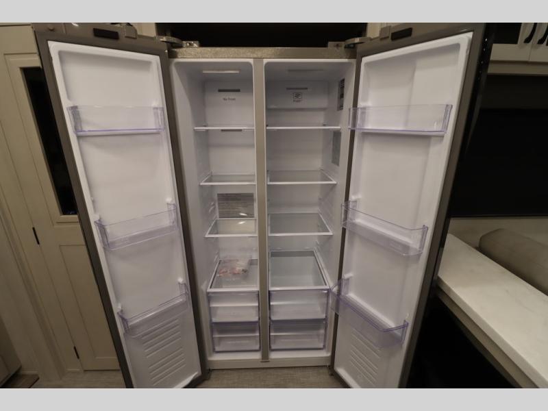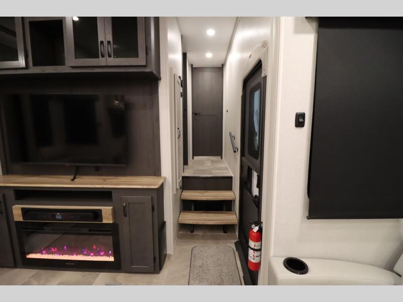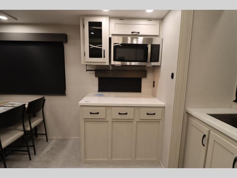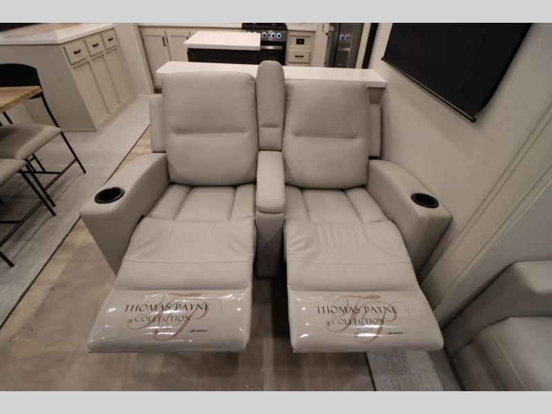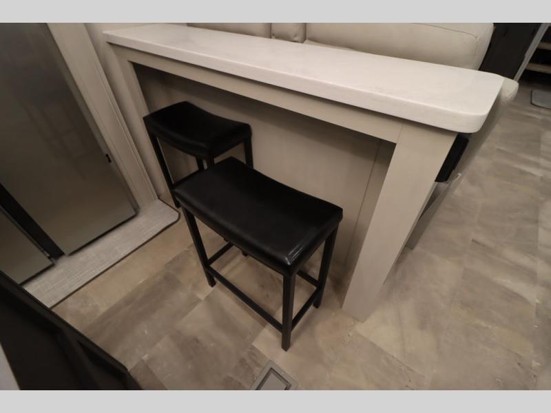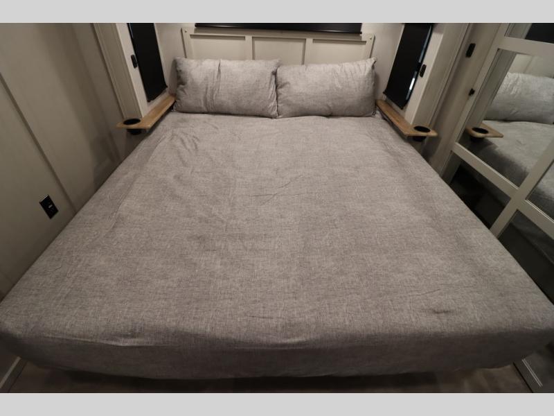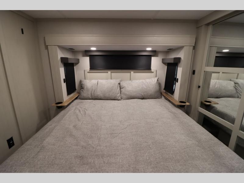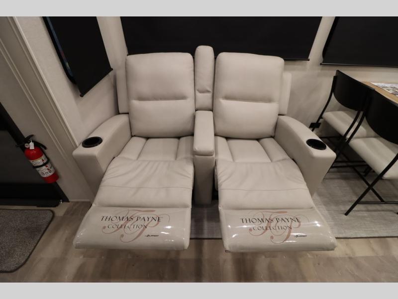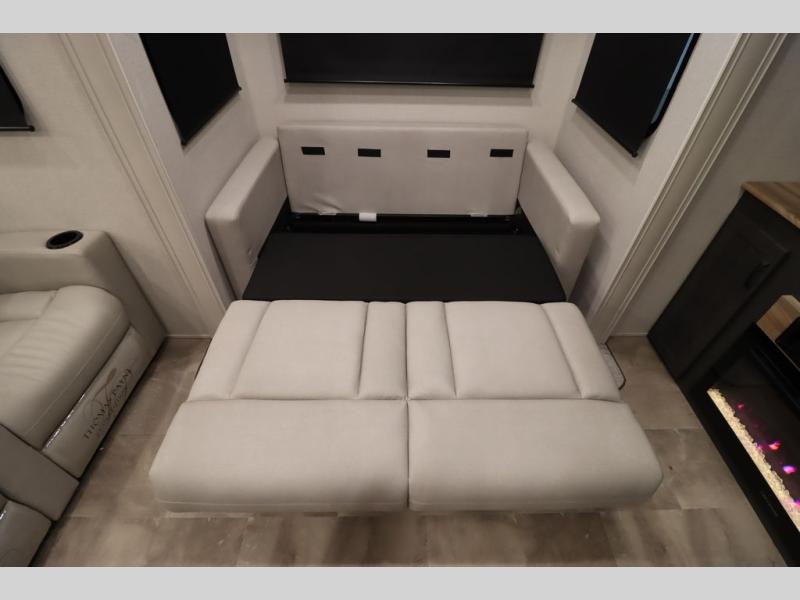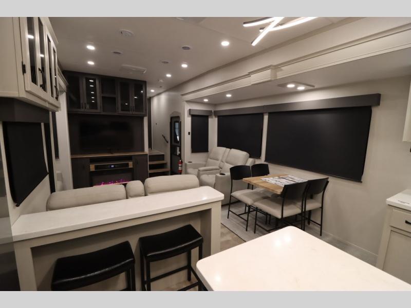 One look at this fifth wheel and you'll be sold. You'll find tons of counter space in the rear kitchen along with a kitchen island, a large pantry, and a hutch for even more storage. Visit in the main living area on the two theater seats and tri-fold sofa, or you may want to head outdoors under the two power awnings! There is even an outside refrigerator here to entertain guests. The spacious full bath will allow you to clean up after a day of adventuring, and here you'll find a full-size shower with sliding glass doors and a seat, plus a dual sink vanity. The front private bedroom will feel just like home with its king bed slide out, large wardrobe, and dresser to keep your clothes tidy.